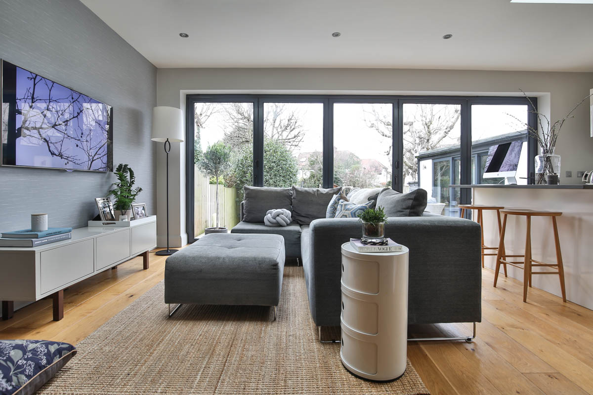 This small yet perfectly formed 1930’s Wimbledon home was completely refurbished throughout. A large open plan living space was created with the addition of a rear extension, making a modern and light filled family room. The space was carefully zoned to blend together informal seating, dining and a kitchen area. The clean architectural lines of the off-white handle less kitchen meets the needs of this busy family’s lives who love to entertain, using the kitchen island for socialising with family and friends or for working from home.