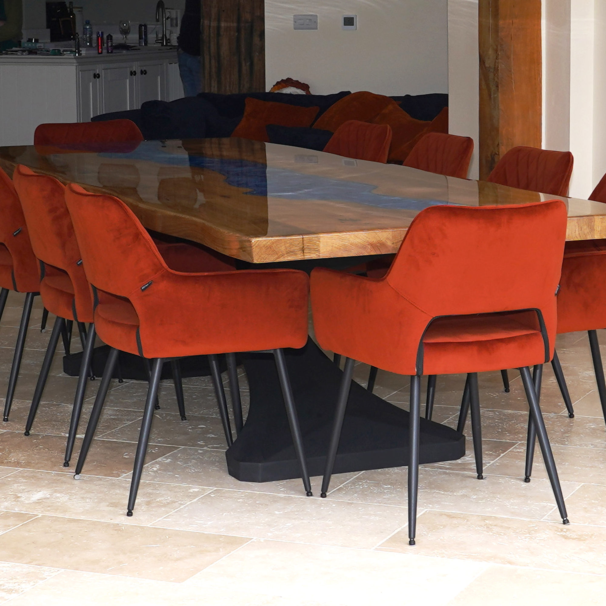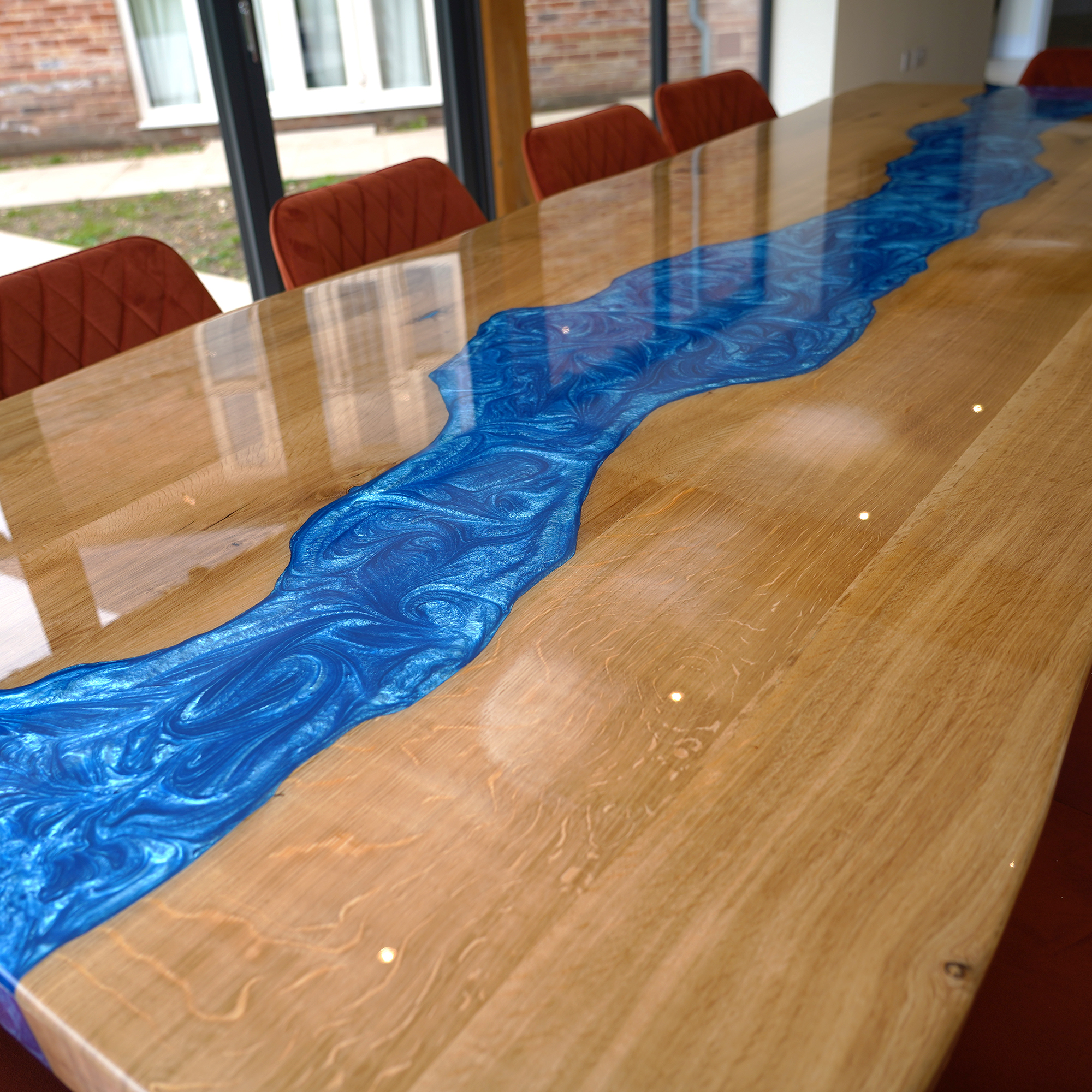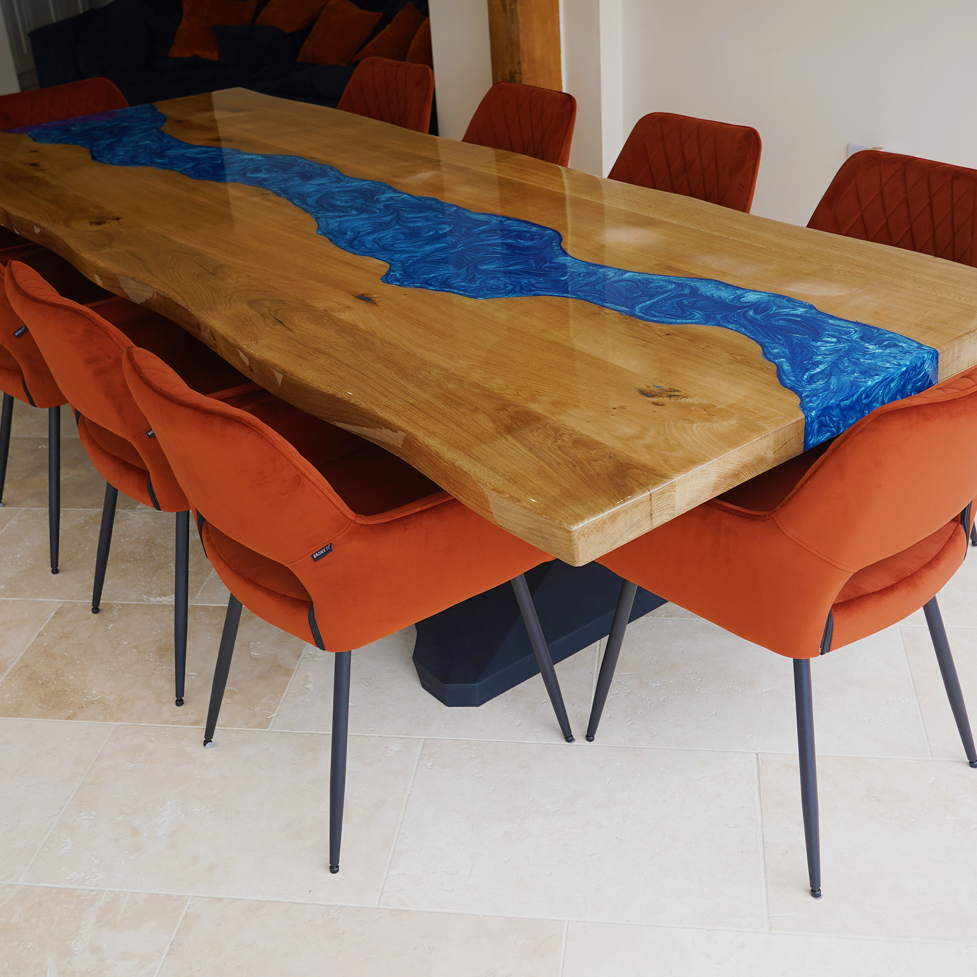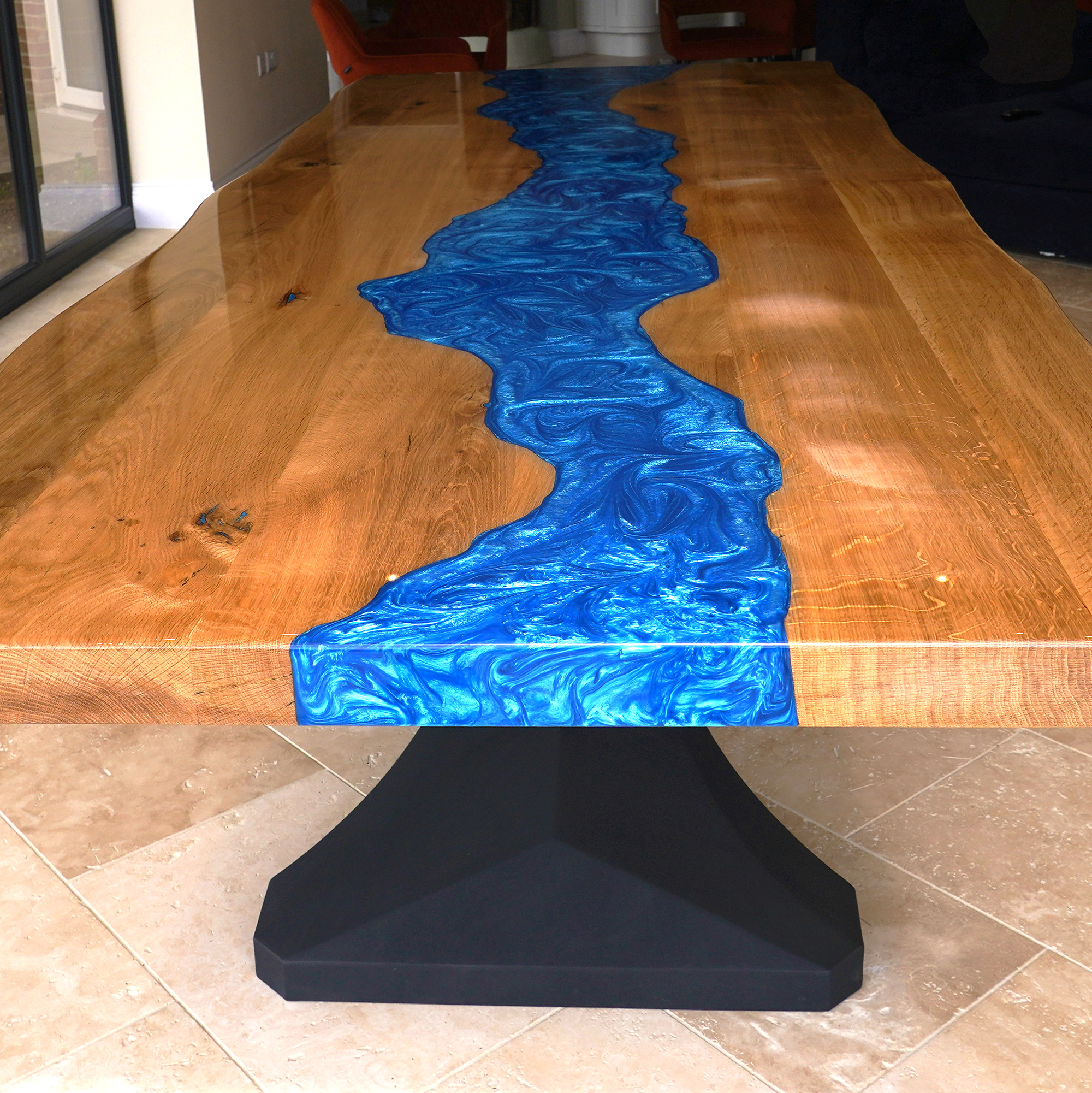 This impressive 3-metre oak dining table, featuring a striking Olympic Blue resin river and a sleek Kamari base finished in black satin, was commissioned by a client seeking a true statement piece.