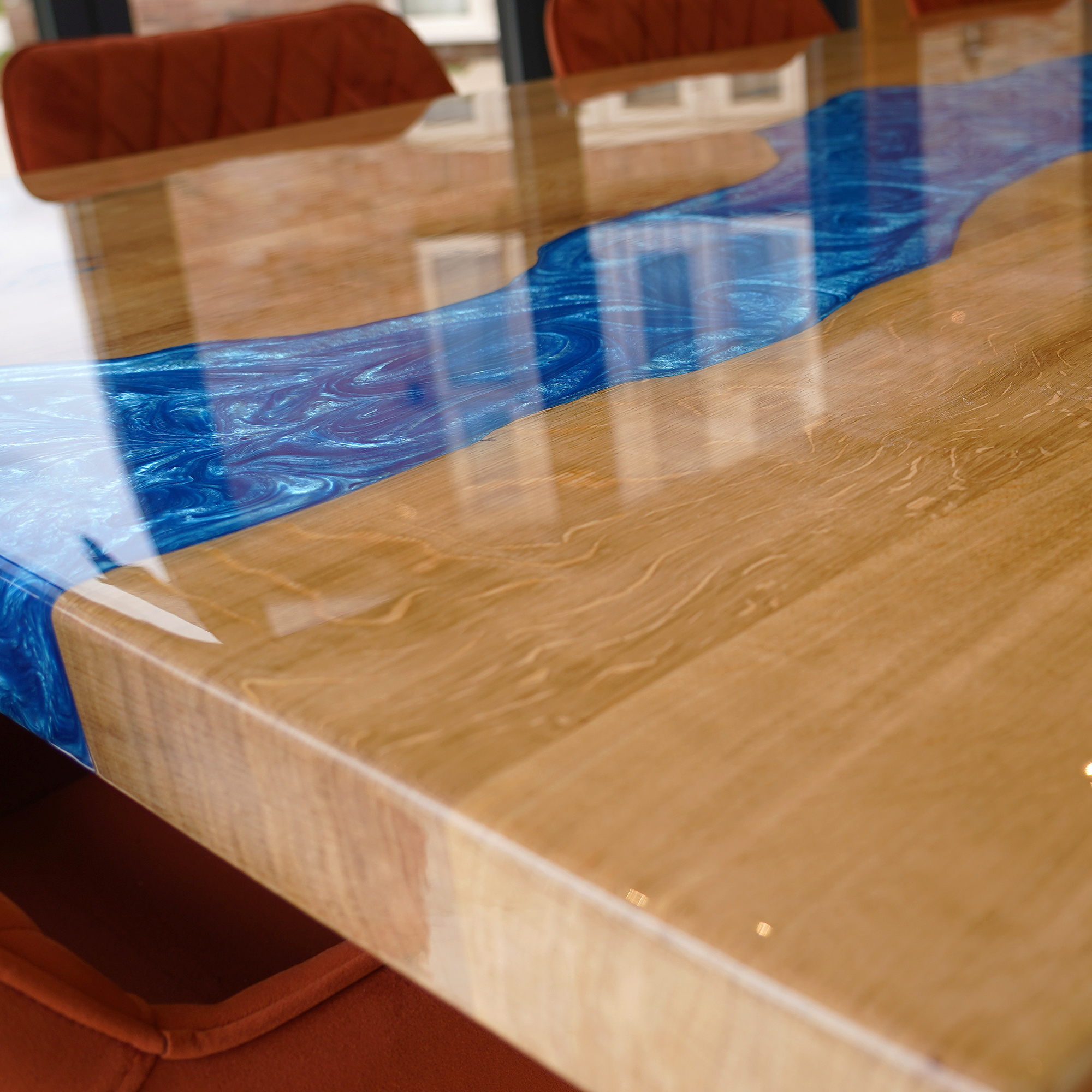 From the initial concept to the final delivery, the customer was fully engaged in every step of the journey, collaborating closely with our team to bring their vision to life. The vibrant resin river, flowing boldly through the heart of the natural oak, adds a dynamic contrast that captures attention and sparks conversation.