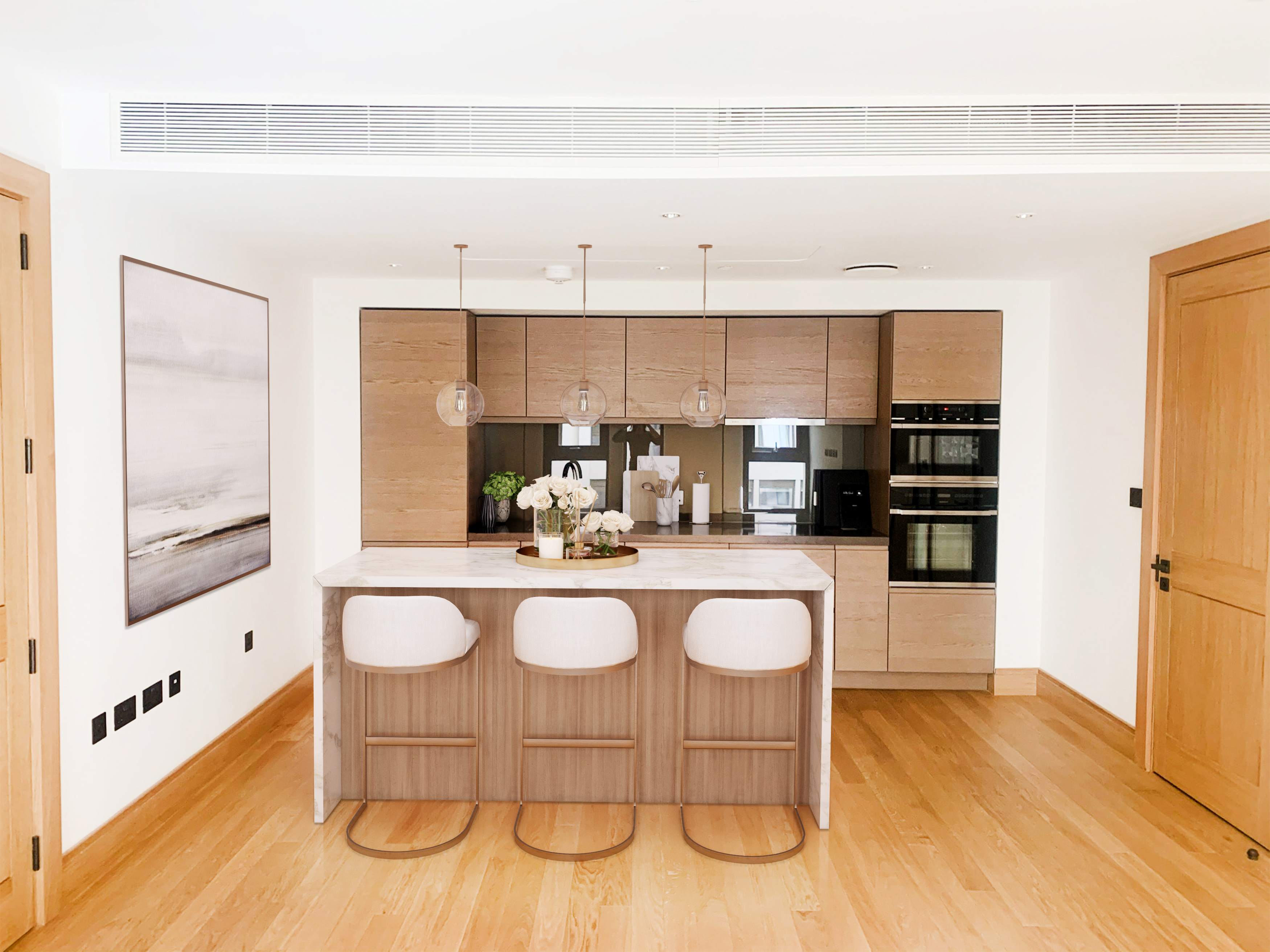 The clients requested a neutral theme with a touch of character, resulting in a natural, eclectic design with a classic charm. To maximize the limited space, we integrated a kitchen island that also served as a dining table. The use of oval shapes and pops of blue added contrast and vibrancy to the predominantly beige and white color scheme.