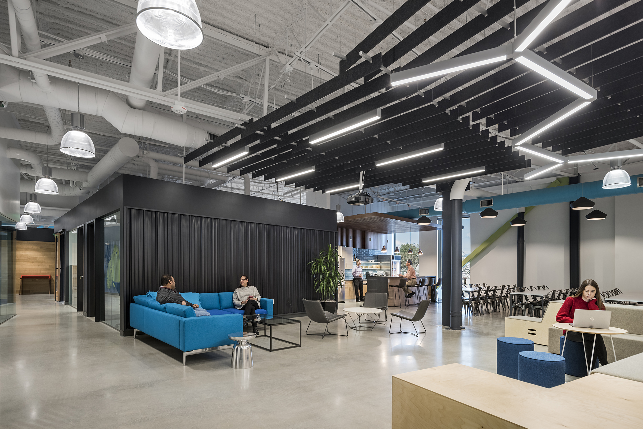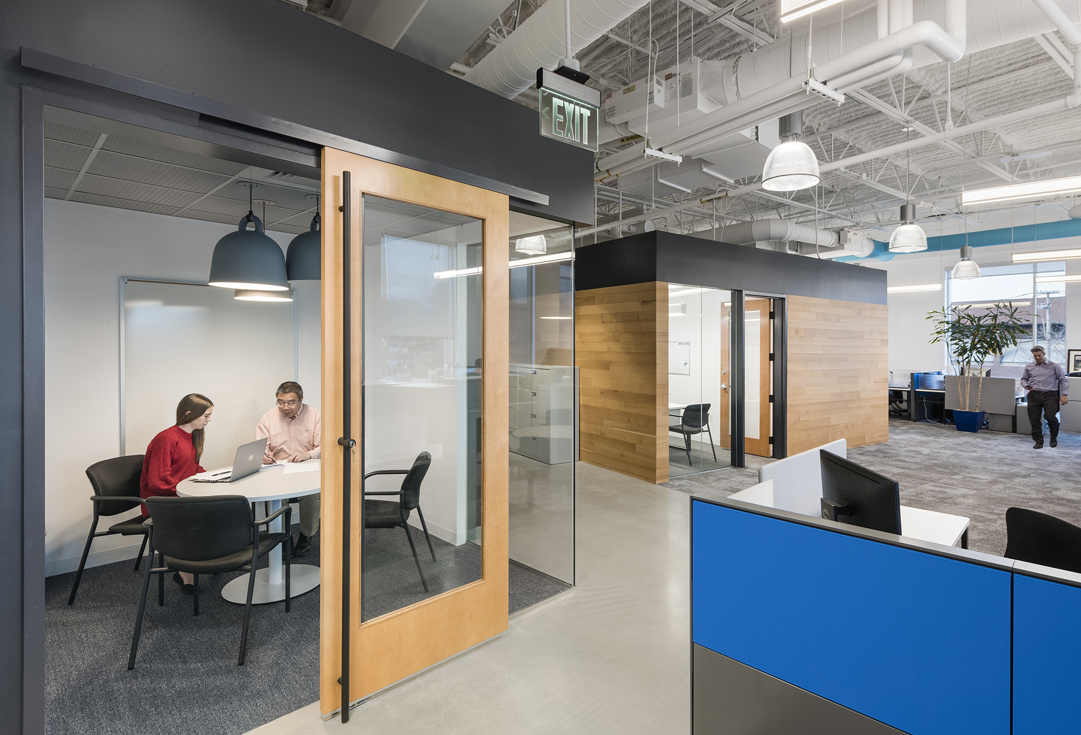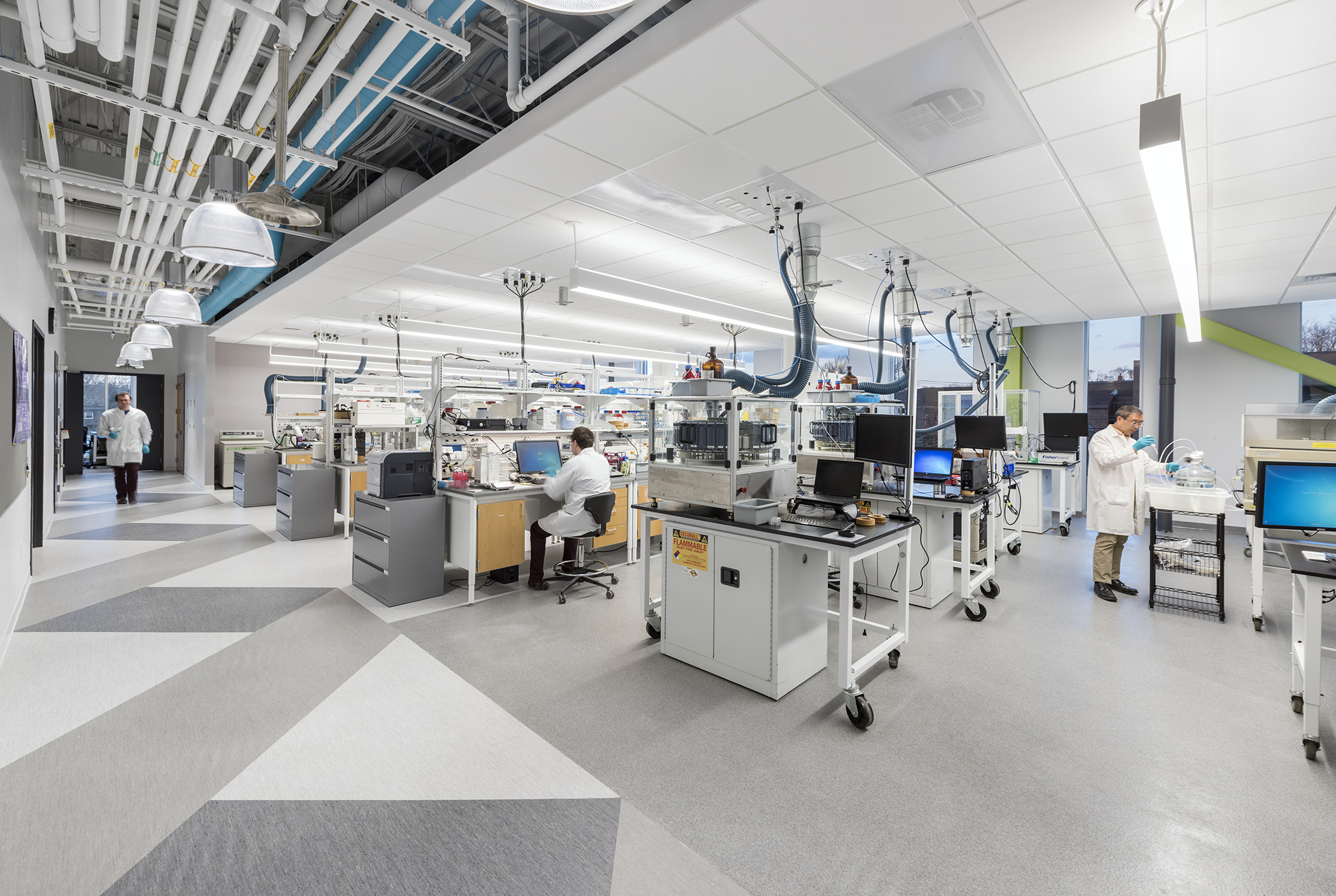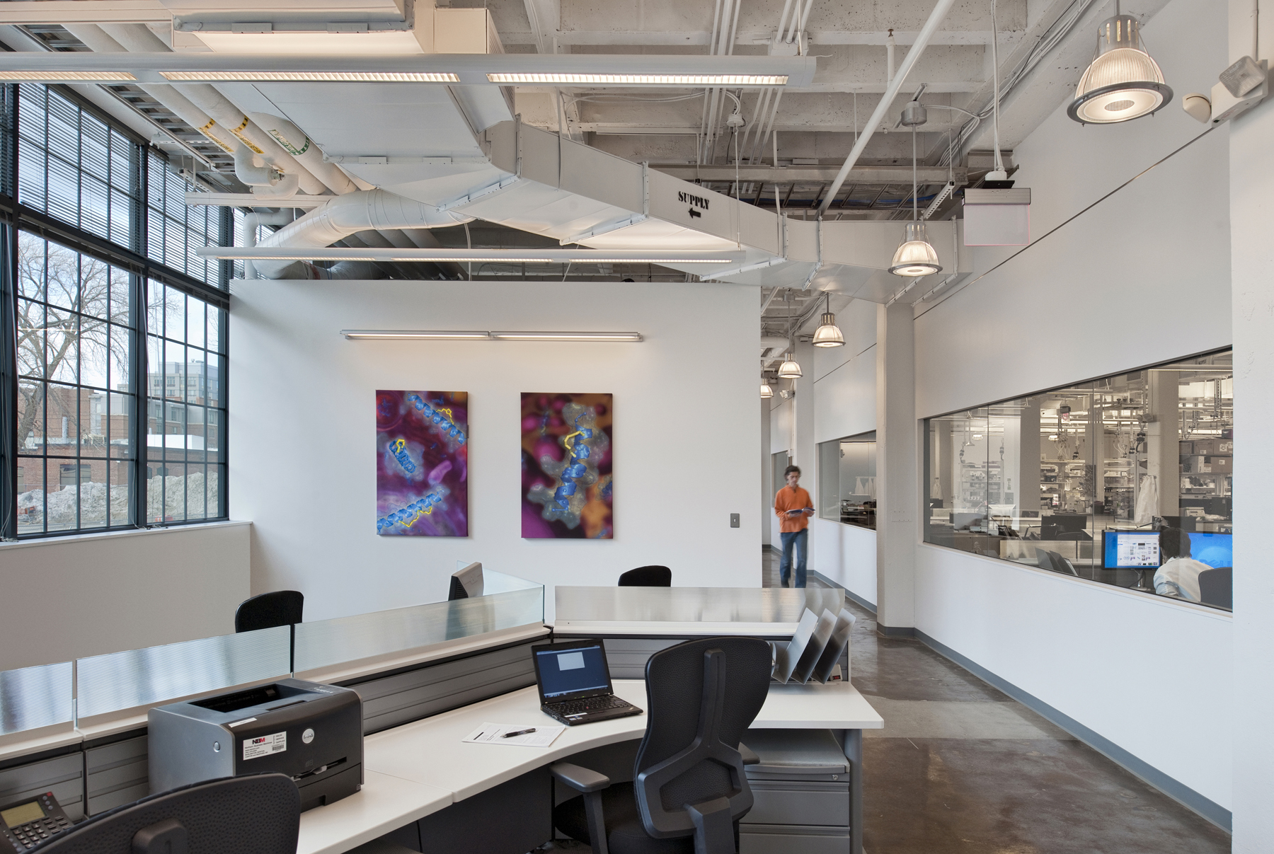Aileron Therapeutics turned to Jacobs a third time for their latest tenant fit-out, this time into a new raw shell space. The goal was to cost-effectively develop a new home that was as innovative and inspiring to employees, visitors, and potential investors as their novel research into a new class of drugs called stapled peptides. The design includes a large flexible collaboration space adjacent to the coffee bar, to support all-hands meetings and to provide addition future growth open office space. Floor to ceiling windows to flood laboratory and office spaces with natural daylight, and closed offices and meeting rooms were designed as clustered pavilions to maintain views and the sense of openness. The laboratory area takes advantage of a generous deck-to-deck height to create a sense of openness along with ceiling clouds to provide ceiling mounted panels for all needed services.