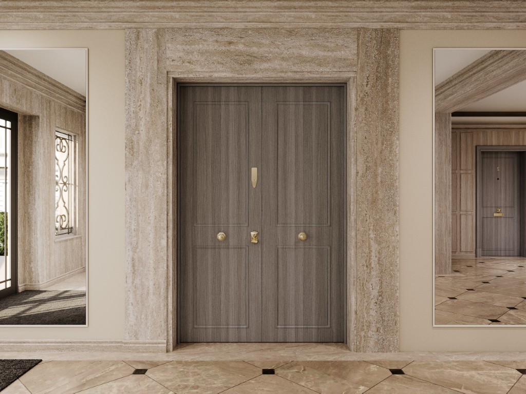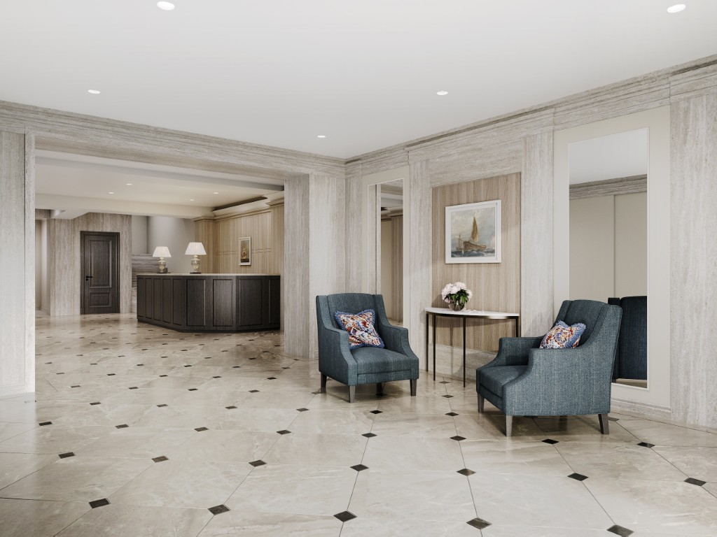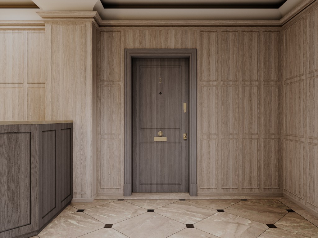 Located in the heart of Kensington, Albertine Commons is a refined common parts project inspired by the timeless grandeur of Claridge's Hotel. The design objective was to marry high-traffic practicality with a sense of residential luxury, ensuring the building's first impression is one of both prestige and warmth. The entrance hall is anchored by traditional honed marble flooring inset with classic black cabochons, creating a rhythmic, geometric foundation. This is complemented by bespoke specialist-finish wall panelling in a soft, light palette, designed to catch the light while providing a durable, luminous backdrop.