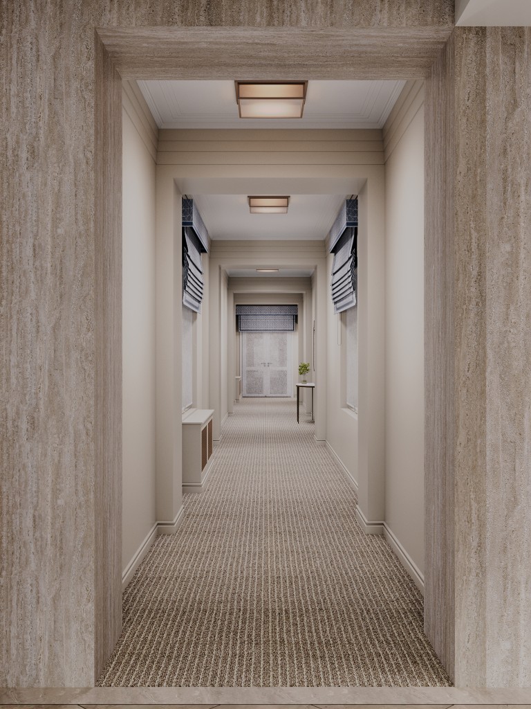 As the design transitions into the residential corridors, the sophisticated tone is maintained through rich strie carpets that offer both acoustic comfort and visual texture. The walls are finished in soft stone hues, serving as a neutral, calming canvas for the architectural details. To complete the scheme, windows are dressed in a subtle baby blue fabric, adding a delicate "lift" of colour that softens the transition between the interior and the Kensington streetscape. Through this meticulous selection of materials, Albertine Commons has been reimagined as a luxurious sanctuary, proving that communal spaces can feel just as curated and personal as a private residence.