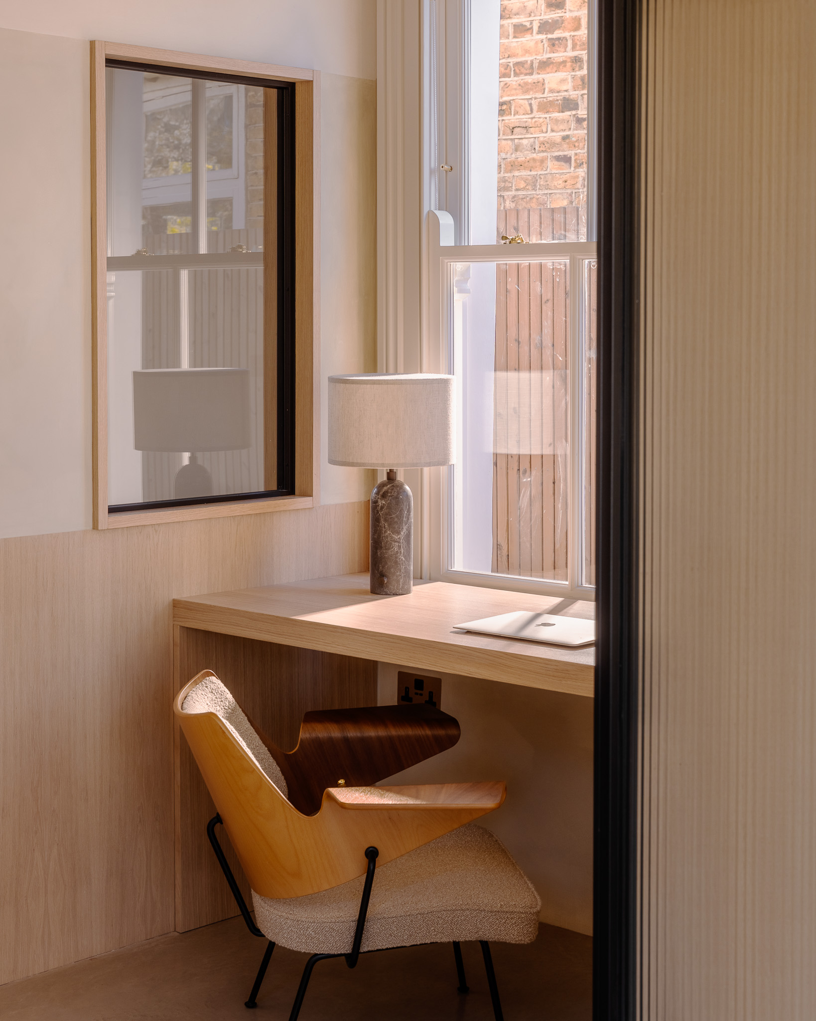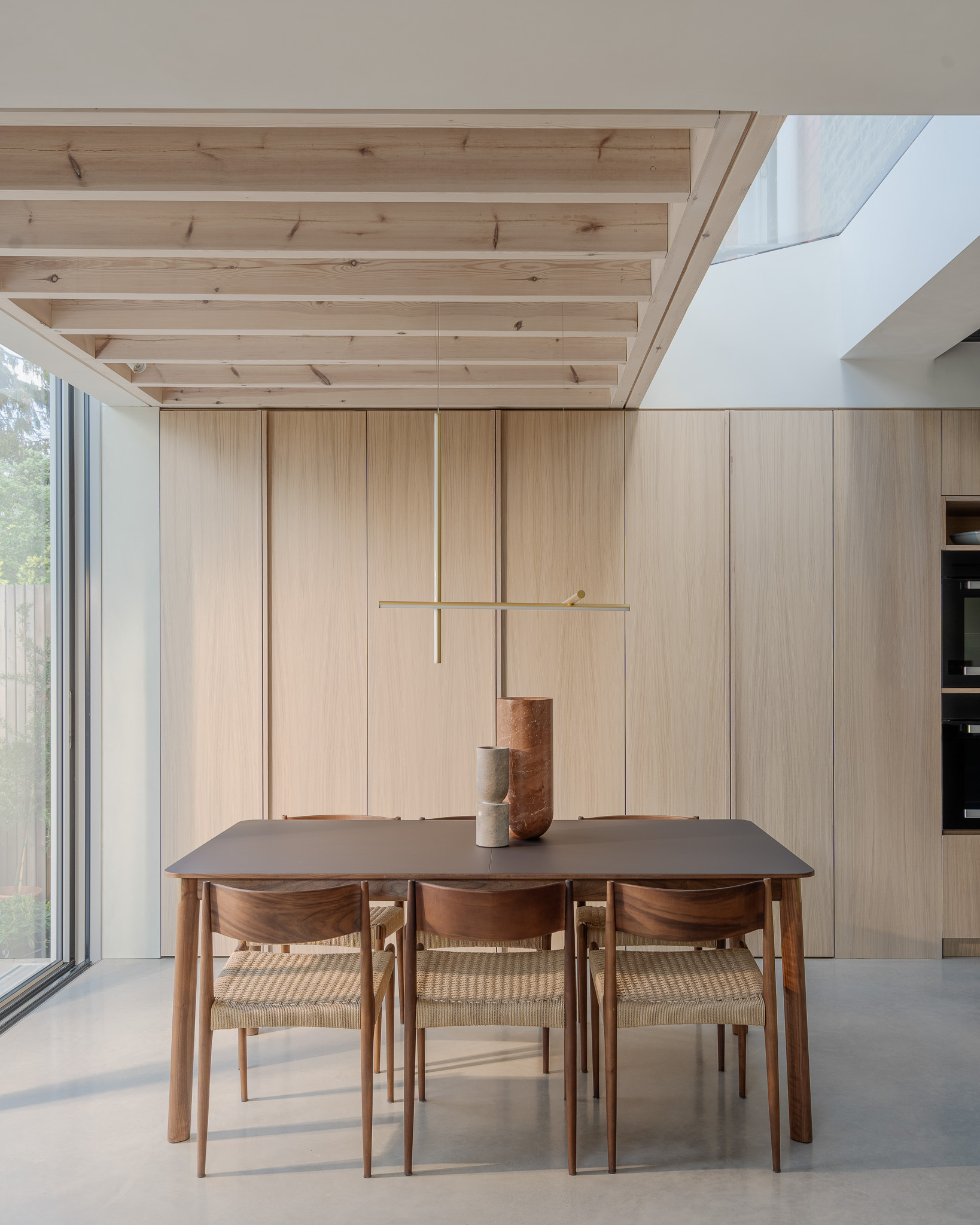 This Edwardian home renovation in East London's Aldersbrook Conservation Area transforms a fragmented ground floor into a cohesive family living space. The design centres around an open kitchen and dining area, connected by a sculptural curved wall that creates subtle zones while maintaining visual flow. A modest rear extension with timber cladding and floor-to-ceiling glazing seamlessly links interior to garden. Exposed timber beams, marble surfaces, and oak cabinetry add warmth, while integrated storage serves practical family needs. The approach carefully balances heritage preservation with contemporary functionality, creating spaces designed to adapt and age gracefully alongside the family's evolving lifestyle.