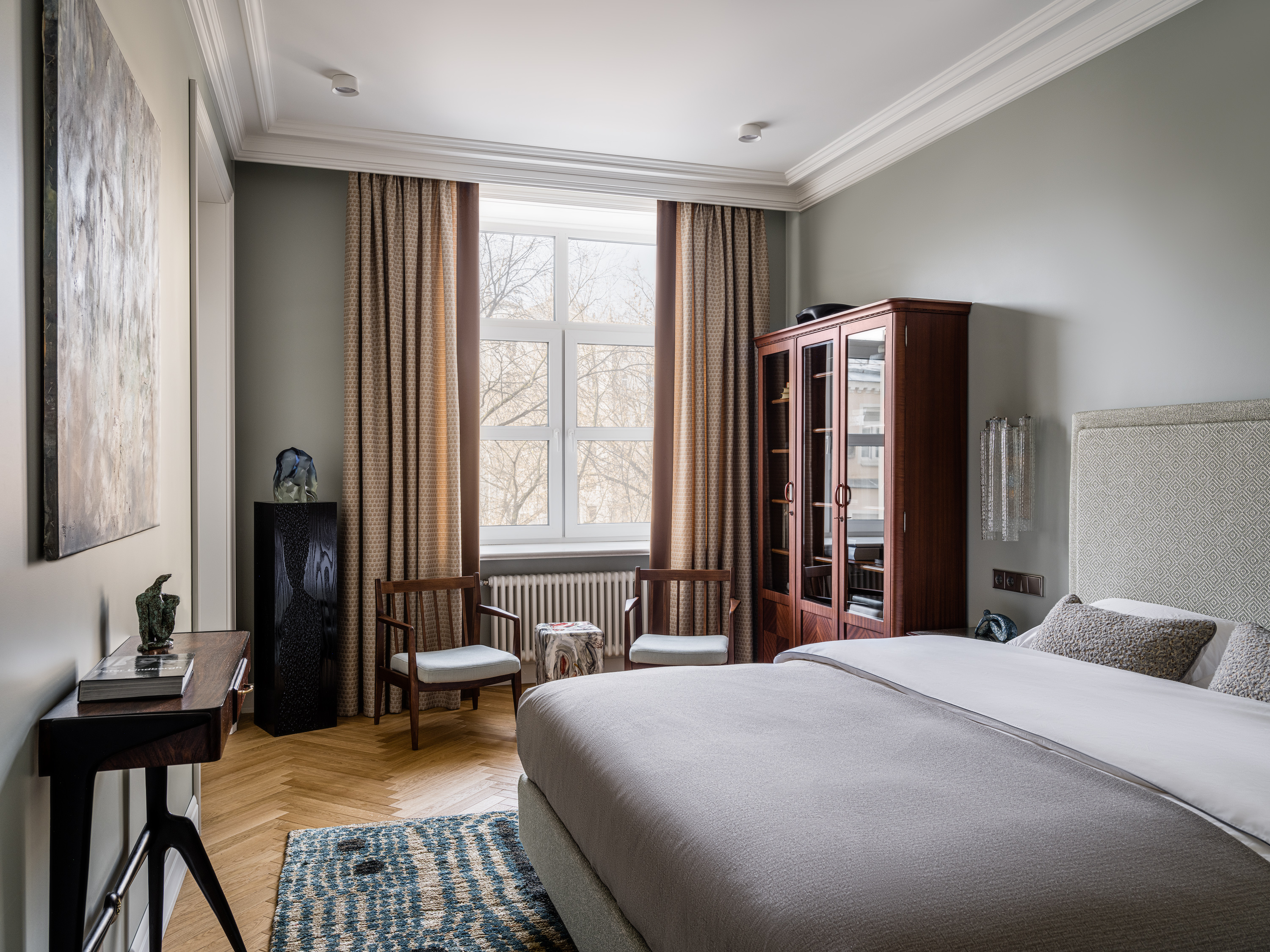A renovated apartment in a historical building in the centre of Moscow. The pale light colour palette is mixed with bold accent furniture and decor elements. The traditional doors and partitions were restored and painted as well as some pieces of furniture were restored and breathed a new life. The apartment is done in an eclectic style mixing old and new elements together. It is a typical one bedroom apartment layout with an isolated kitchen, dining and a living room. High ceiling and doors add space into the apartment and it looks bigger than the actual size. The floor layout was changed from the initial one. Now it is a so-called circular apartment layout - an enfilade was added from the kitchen to the bedroom. You can either go through the whole apartment via beautiful double doors or there is an alternative private entry into the bedroom.