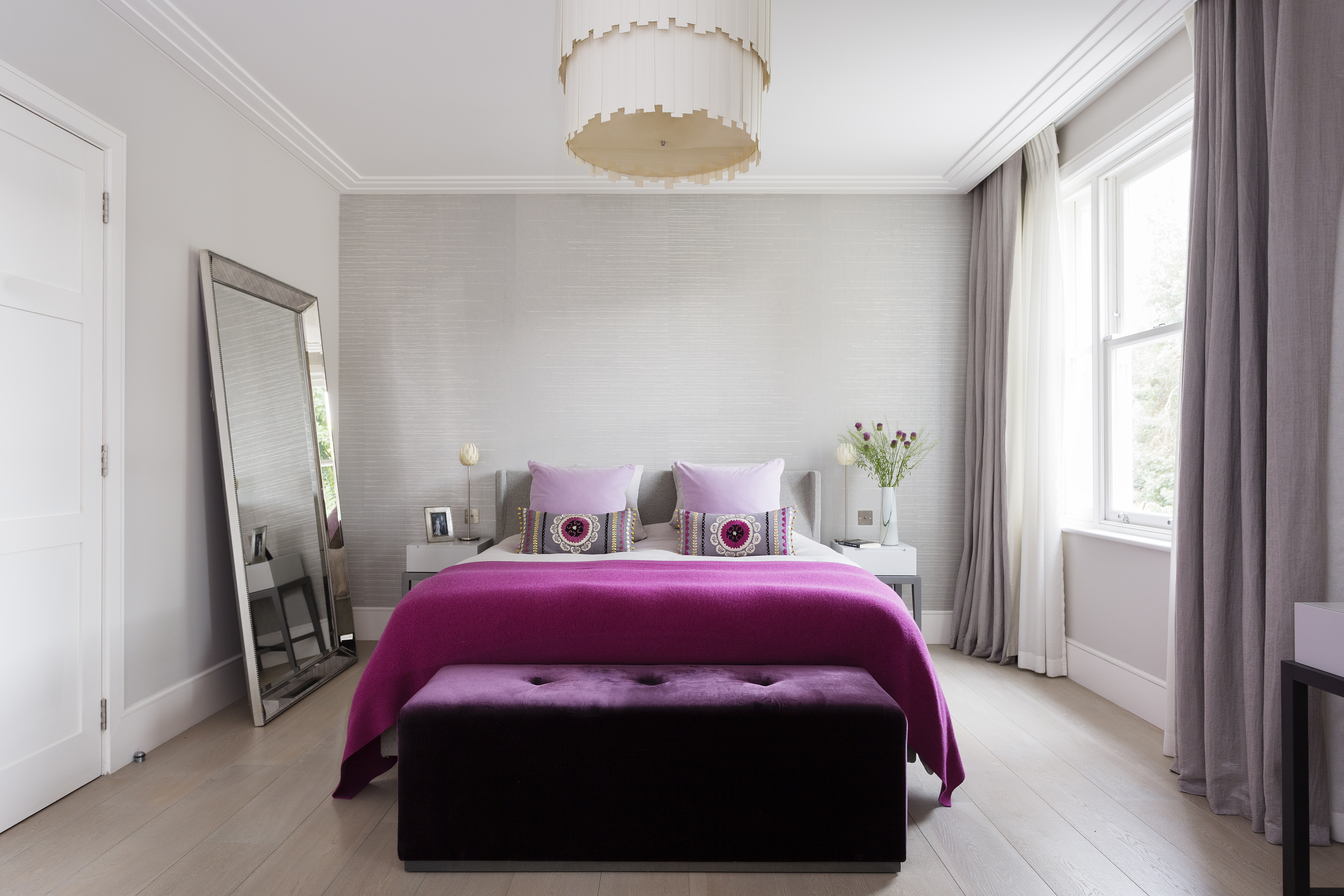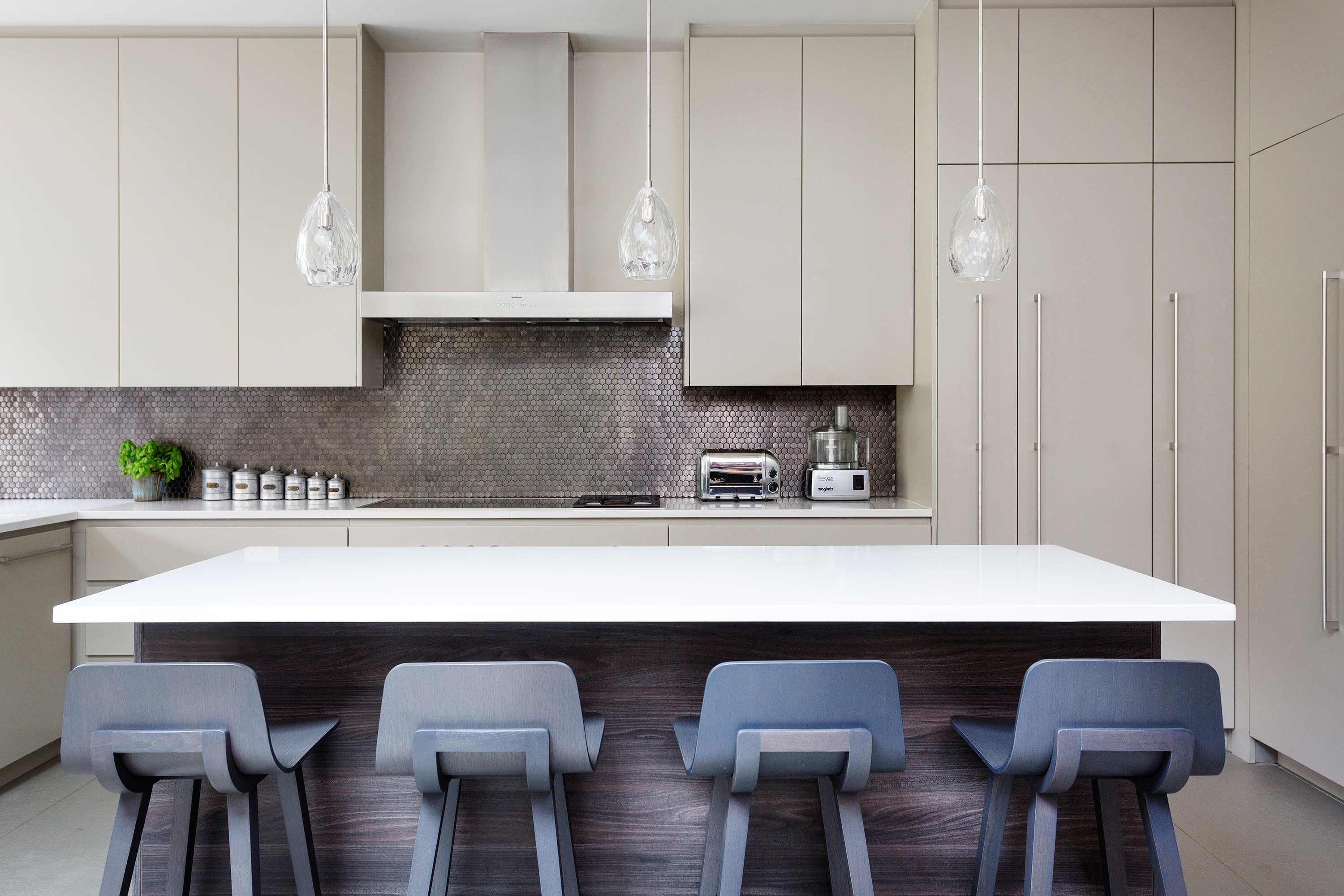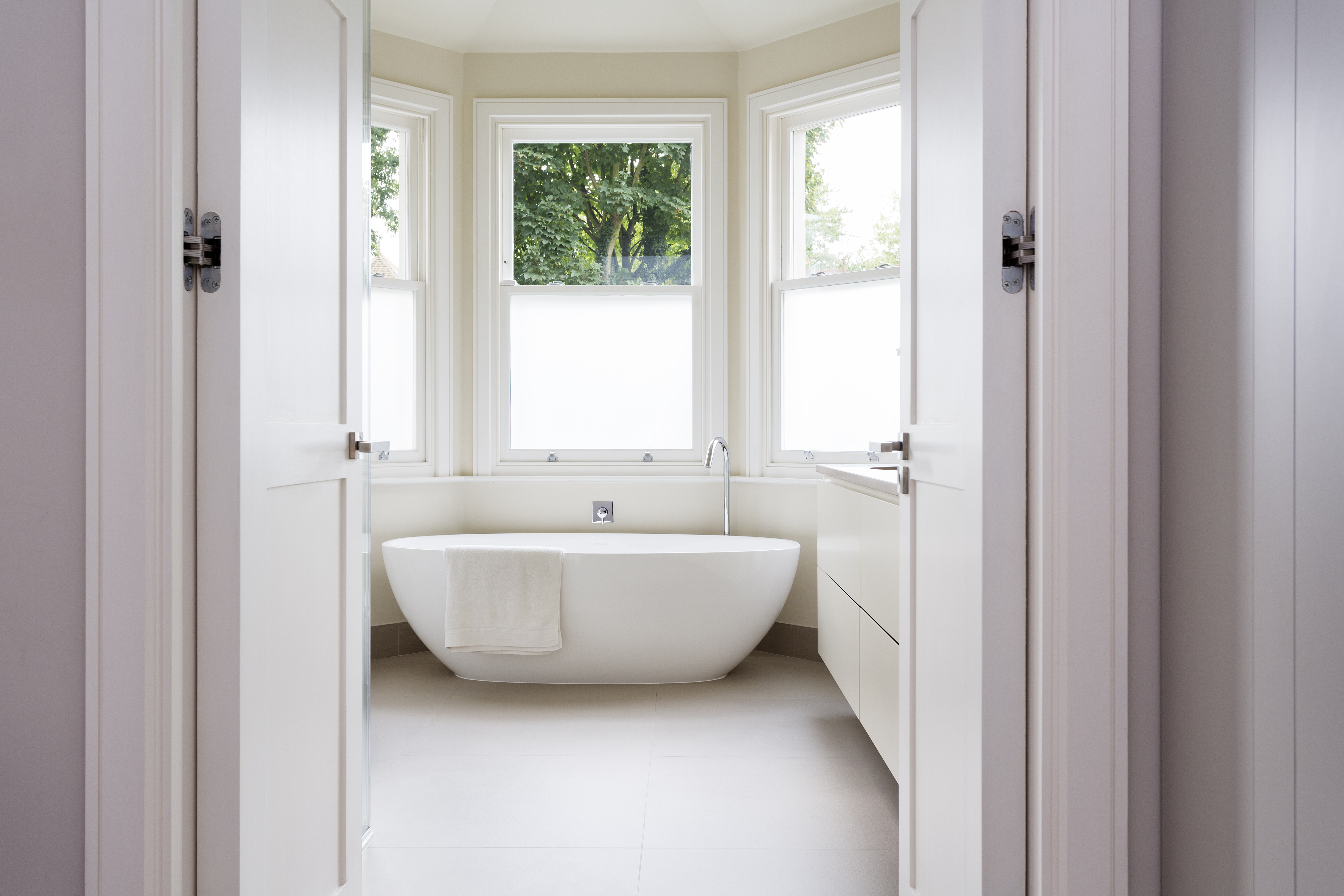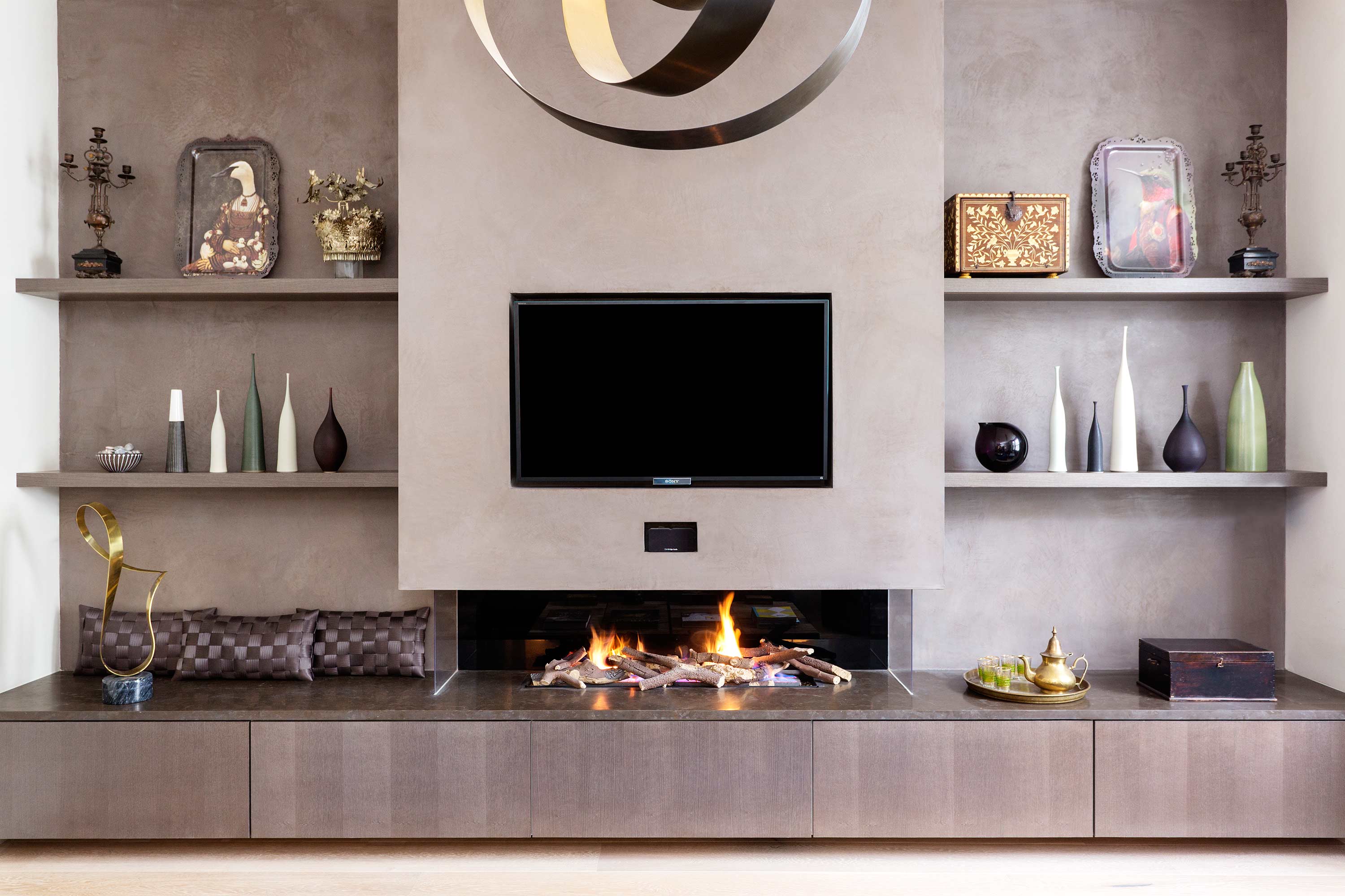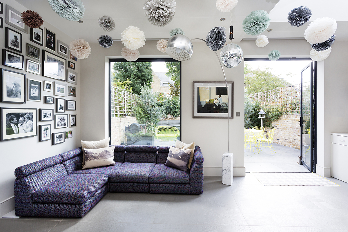 A 5 bedroom period family house in Chiswick has been transformed into a contemporary light-filled home. The clever lighting scheme mixes intelligent lighting with vintage flea market finds to create a unique look. All doors, skirtings, panelling and joinery are bespoke designed so the space has a continual flow. The french grey panelled hallway has eclectic tiles running from inside out. In the lounge the polished plaster feature wall is paired with a rustic wood coffee table to give a luxurious feel with surprising twist. The mix of textural surfaces are key, and the refined architectural language creates a sense of calm throughout.