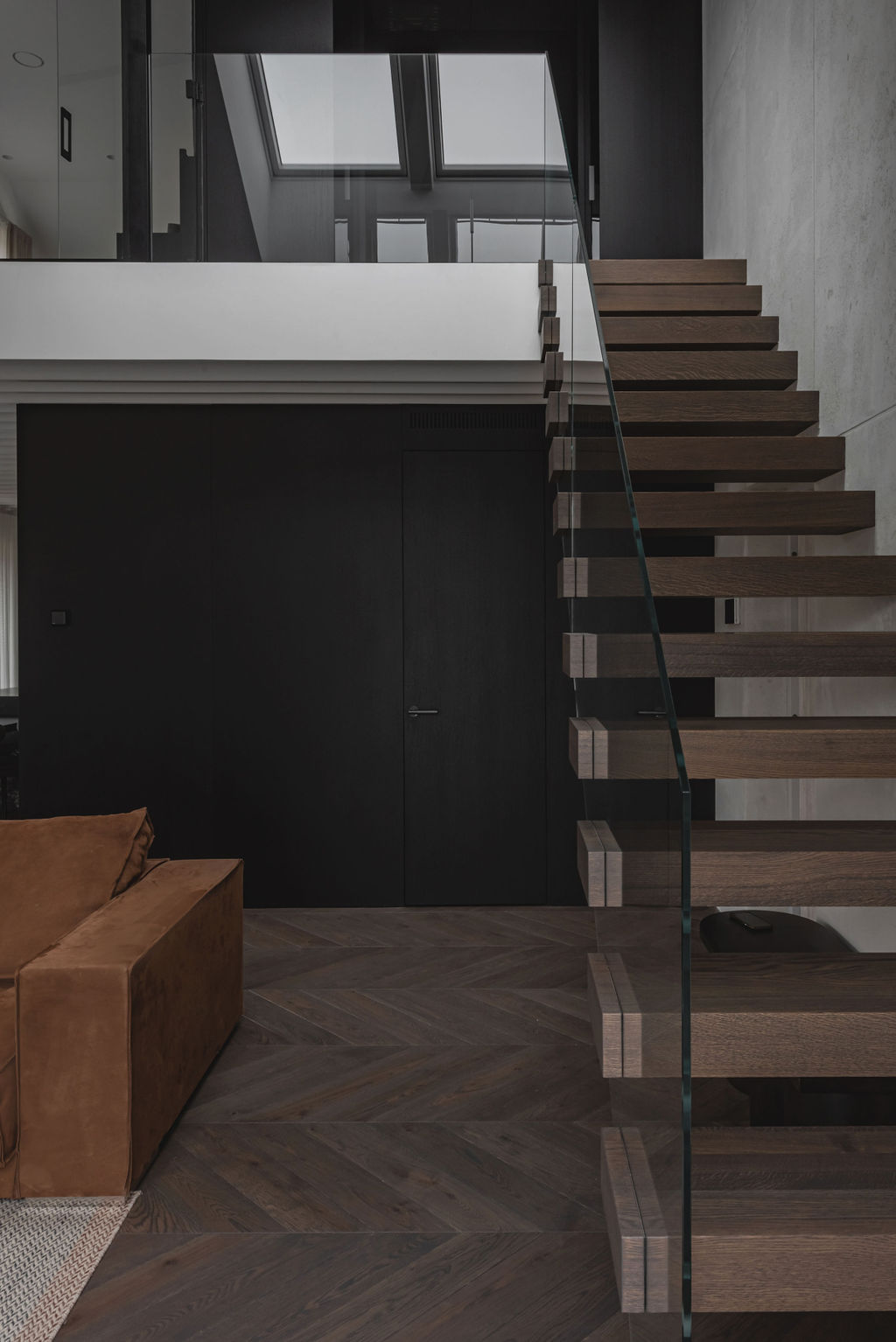 Reflecting on the decision to incorporate the Antique oak wood flooring colour into the interior, designer Indre Dorofejute shares, "Some clients may have reservations about opting for very dark floors due to practical concerns. However, they often gravitate towards darker tones such as Walnut or grey. The wide range of oak wood flooring shades offers limitless design possibilities. As floors occupy a significant area, choosing the right wood flooring colour is a pivotal decision in interior design. In this case, the clients were certain about their preferred tone from the outset, which greatly influenced our creative direction."