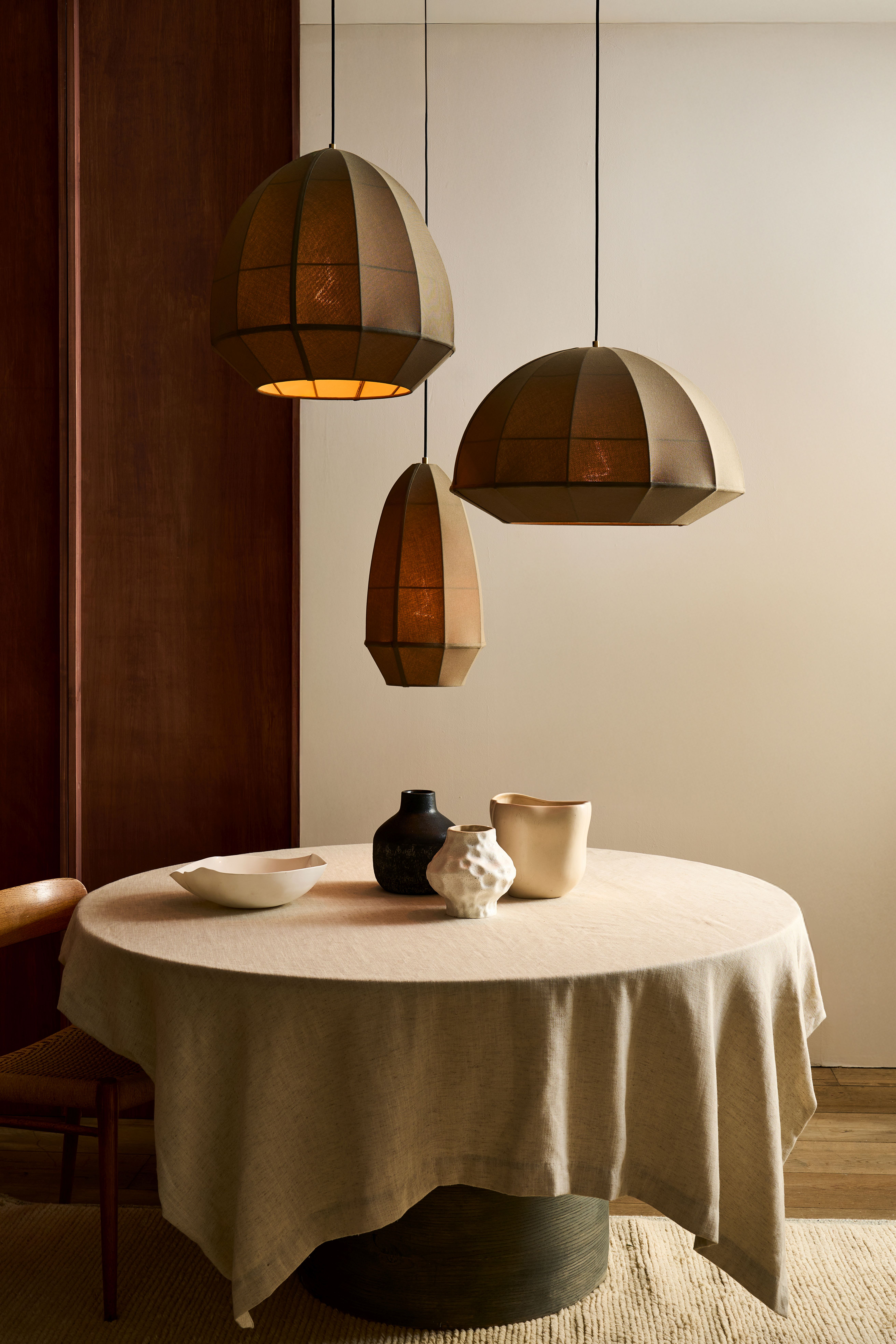 Statement shades have a new softness this season with the introduction of the Burham range for AW25. These oversized lantern-style pendants are crafted from green flax with a double-layered finish, creating a richly tactile and visually striking presence.
