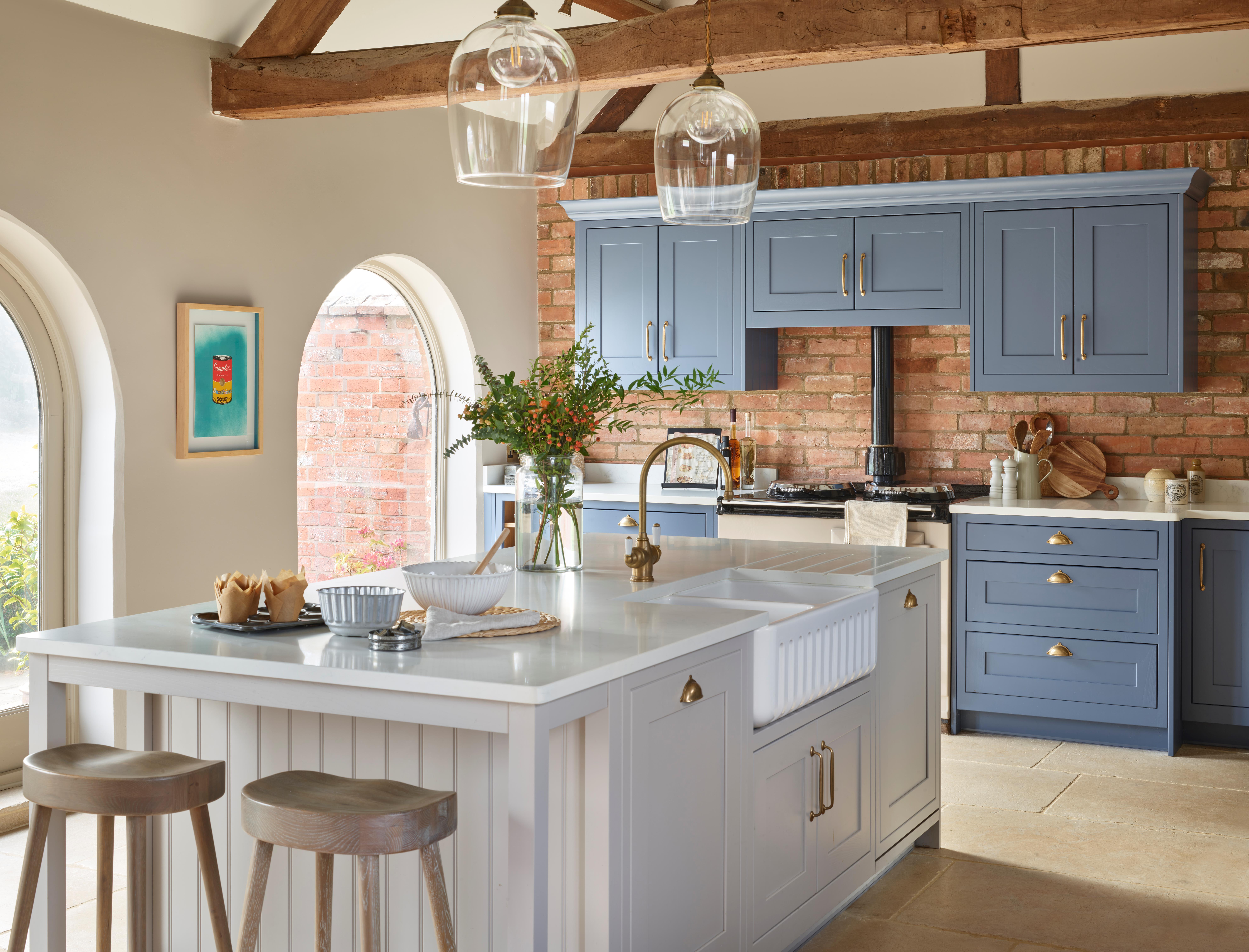 The couple selected a beautiful denim blue shade, Pale Navy, for the main kitchen units, paired with a neutral island painted in Cashmere. The Cashmere tone was also used for a media unit at the far end of the open-plan kitchen and dining area, creating a cohesive and versatile space.