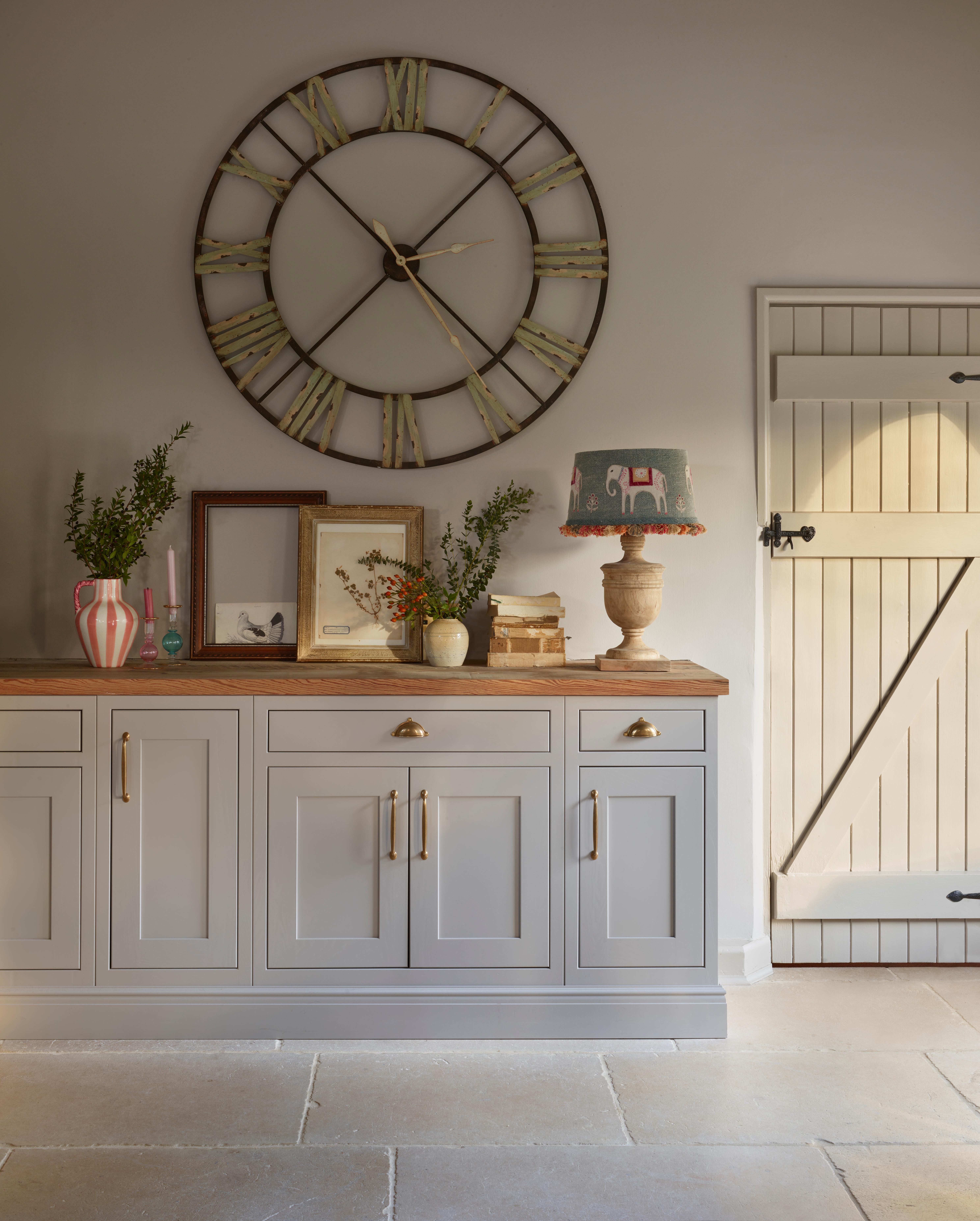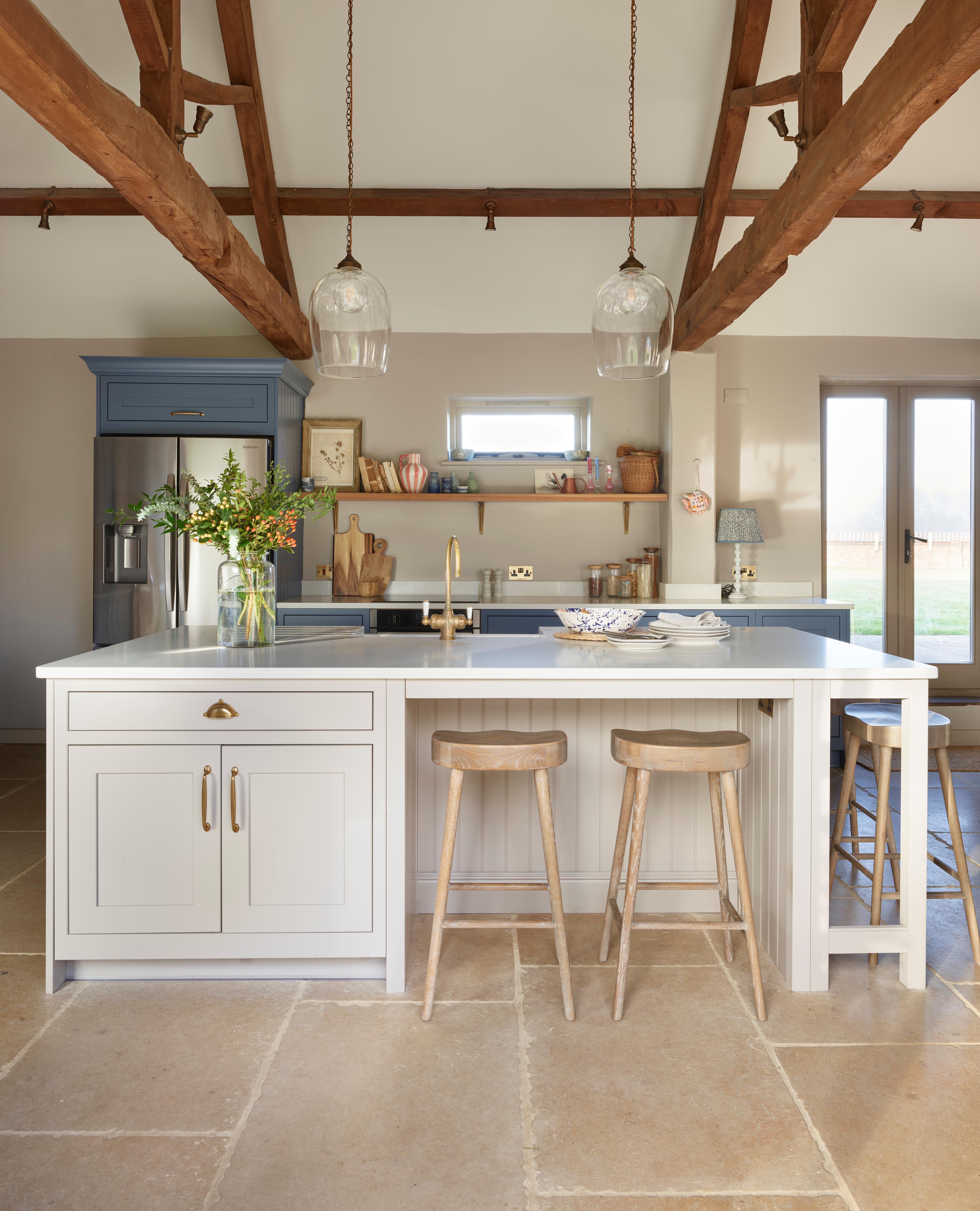 Key elements of the barn’s character, such as the beautiful arched windows and exposed wooden beams, were retained. However, the terracotta tiles were replaced with limestone flooring, enhancing the room’s light and airy atmosphere. After visiting the Kitchen Makers showroom and working closely with a designer, Katie and Richard opted for the classic shaker-style Haddon kitchen.