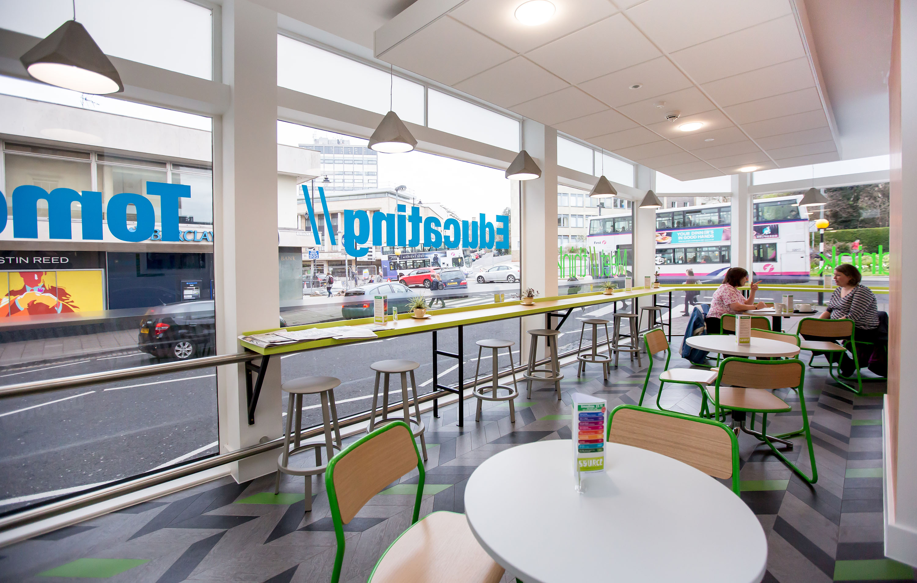As the new University building is open to the public as well as students, it was important to give Beacon House its own individual feel while at the same time ensuring it could be identified as a University space. The design strategy endeavoured to create a distinct visual identity, linking together the three main functions of the space, and working within the agreed brand colour palette and recommendations of the University’s General Project Requirements.