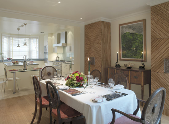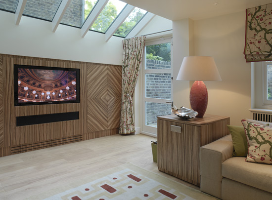 This pretty Victorian terraced house was converted into three flats during the 1950's. Meltons' brief was to seek Planning Permission in order to remove the flats, and to turn the property back into a single family house. All refurbishment was to be carried out in as Eco-Friendly a way as possible. The clients also wished to open up the warren of rooms on the Lower Ground Floor in order to make one large open-plan area for the Kitchen, Dining Space, and Family Room/Playroom. A media centre and Plasma Screen are incorporated in the Family Room. A few of the special features include underfloor heating in the Lower Ground Floor, acoustic sound insulation between hard floors, Lutron lighting controls, Crestron controlled sound system, Pilkington's self-cleaning insulated glass on the glazed roof extension, Limestone flooring in the Kitchen, Element 7 Hardwood Flooring on the Ground and Lower Ground Floors, Thermafleece loft insulation.
