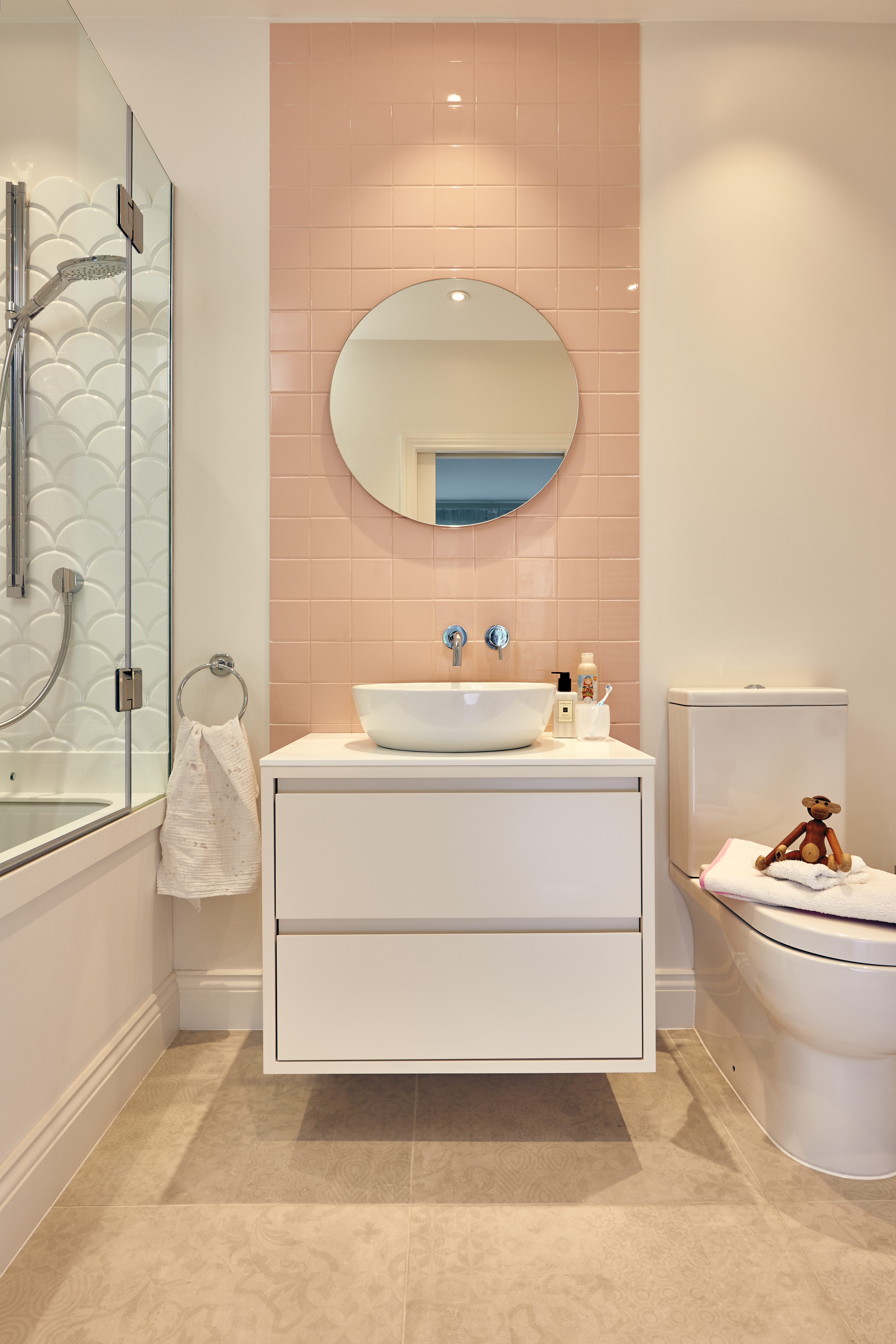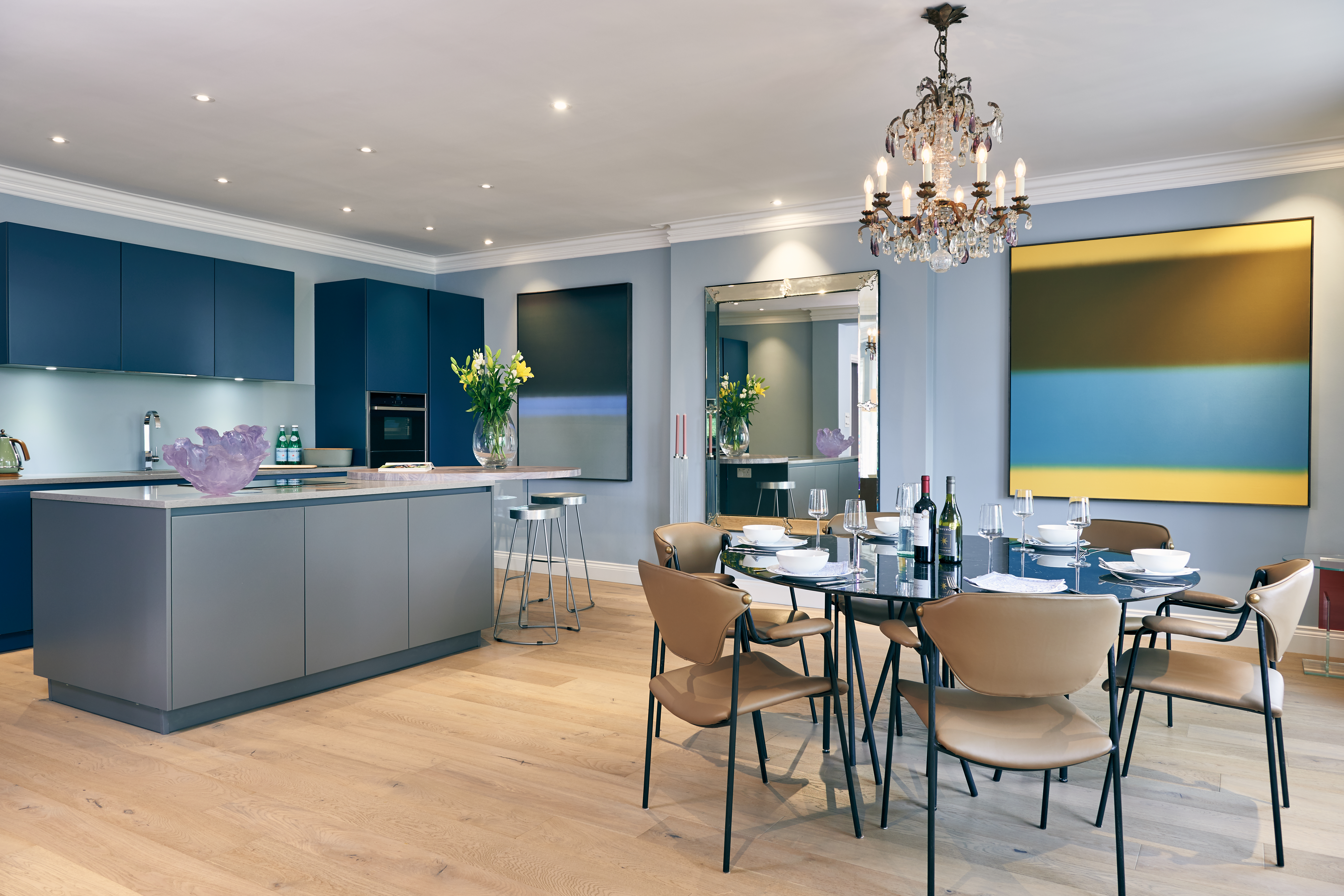 The colour scheme was clearly defined at the start of the project with a focus on a palette of soft pinks, blues and lavenders. The client loved the idea of a bold, statement kitchen. Petrol blue provided the perfect accent colour.