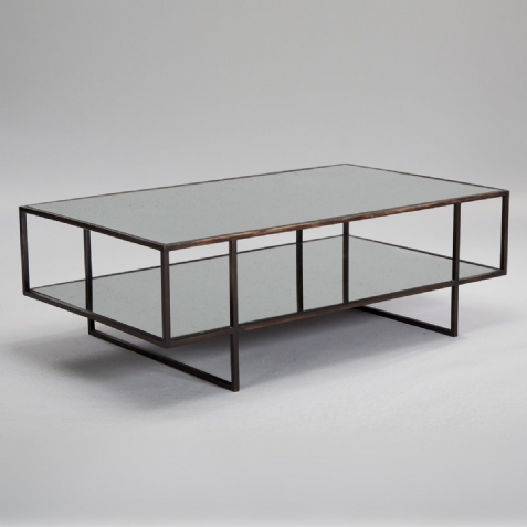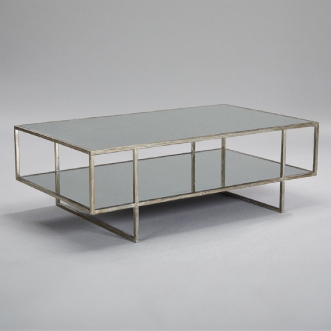 This simply designed metal base is hand finished to an aged silver. The antique mirrored top and shelf are fixed to board for added strength and the reflective surfaces are great for displaying your books and objet.