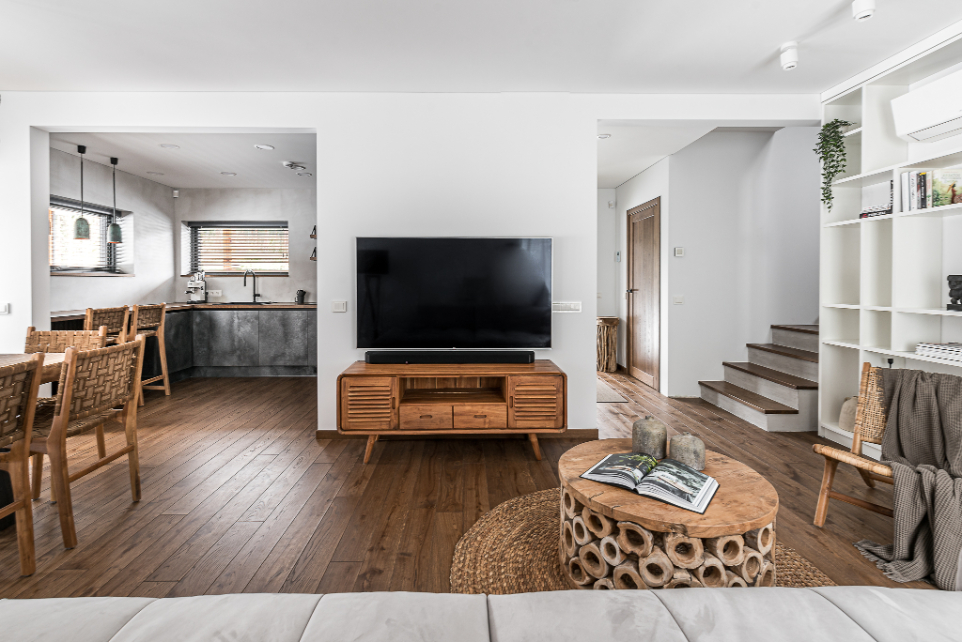 This two-story home is reminiscent of Bali, steps away from a forest with oak floors and exotic wood furniture blending harmoniously. Ecohardwood oak flooring is perfectly displayed in this interior design by Dovile Sakevice.