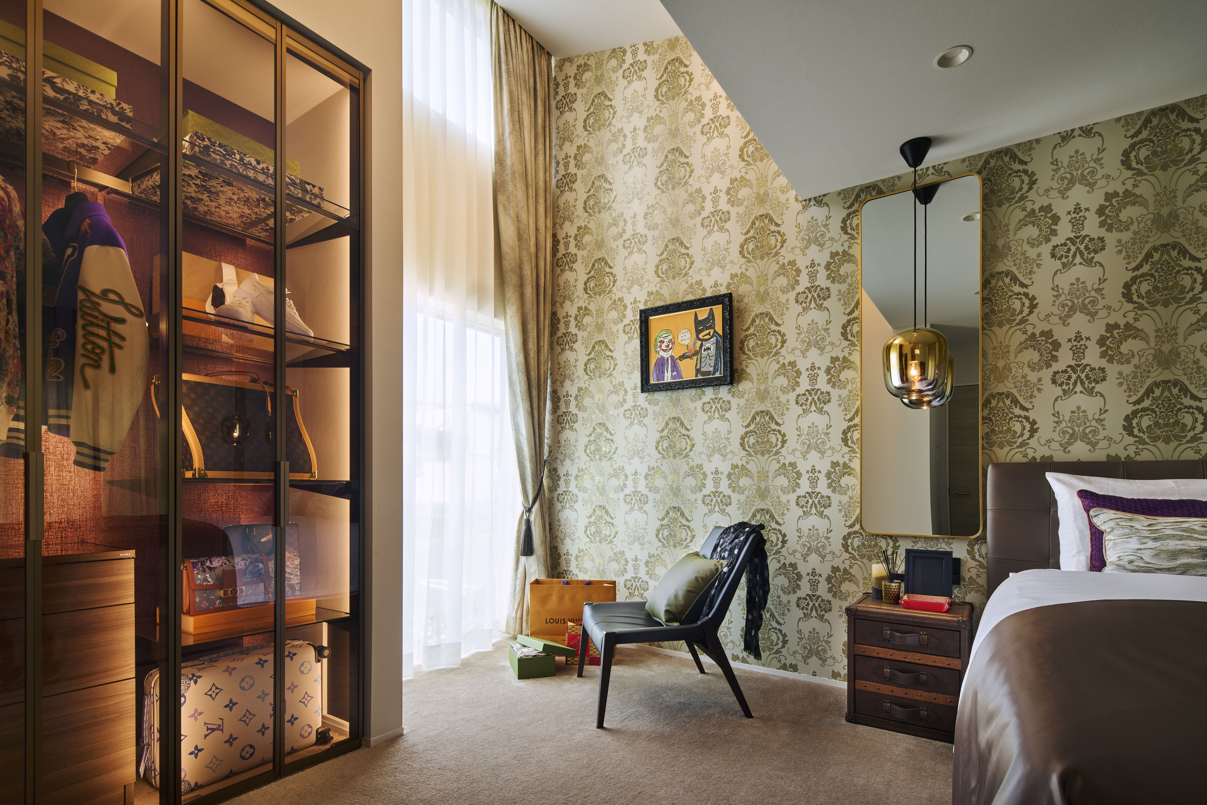 The couple's bedroom is adjacent to the walk-in-closet [WIC]. The WIC houses a collection of their favorite luxury brand, “Louis Vuitton”. The bedroom where they spend a lot of their time looking at some of their favorite things is a space where they can dream about traveling.