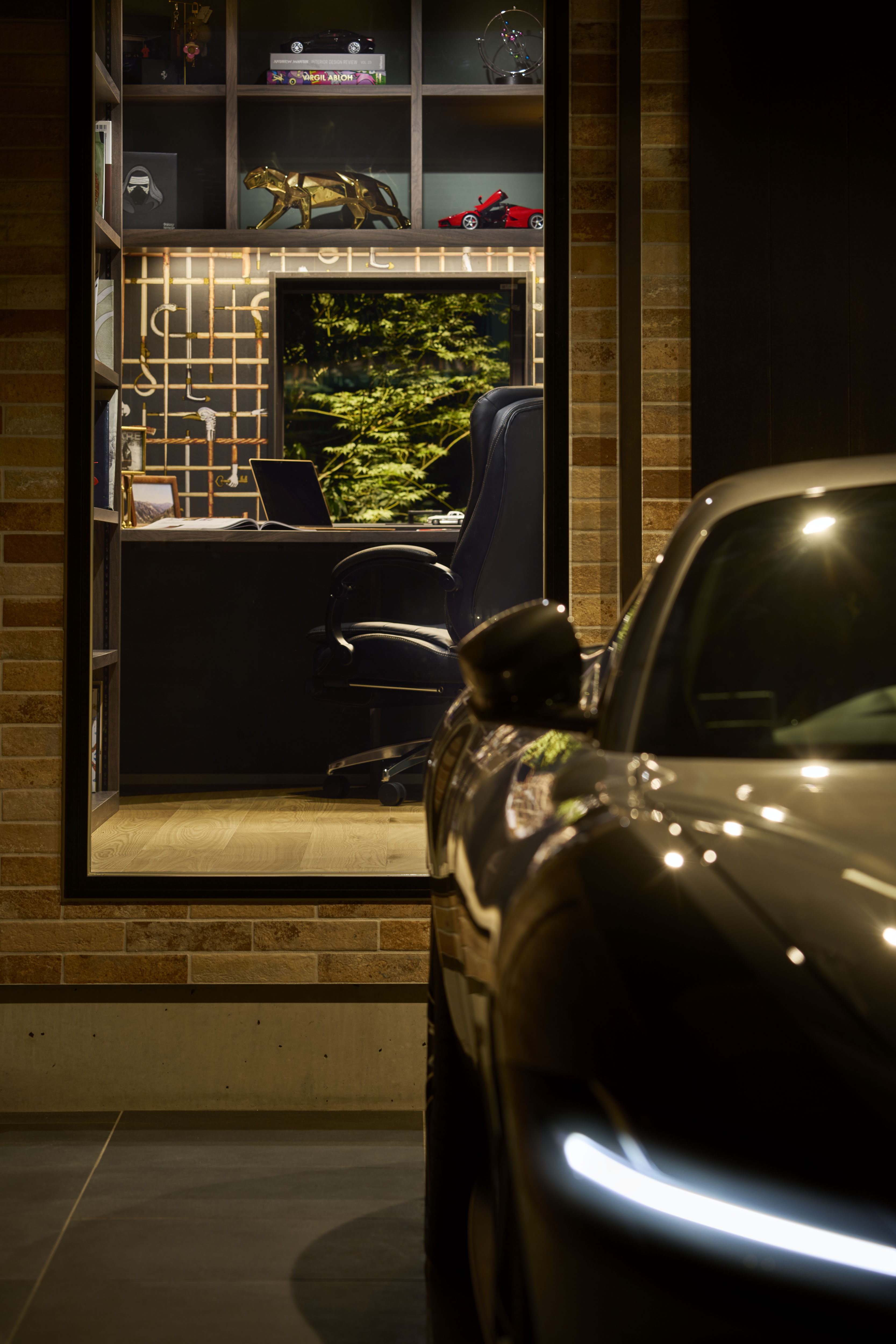 Once stepping inside, you'll be fascinated by the built-in garage that reminds us of the cockpit from a James Bond movie. A study, full of the client's collection, and a step-down living room with a dynamic glass opening overlooks the garage. The living room was designed with an opening as large as possible so that the client’s beloved car, Ferrari Roma could be seen from top to bottom. And there are also large windows on the other side of the living room facing Japanese garden. We ensured the safety of installing large windows on both walls through careful structural calculations.