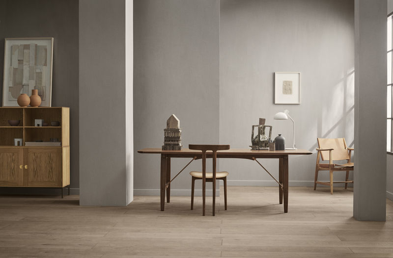 Børge Mogensen designed the BM1160 Hunting Table for the Copenhagen Cabinetmakers’ Guild Furniture Exhibition in 1950. The table combines excellent woodwork with elegant metal brace bars, creating a bold and organic whole.