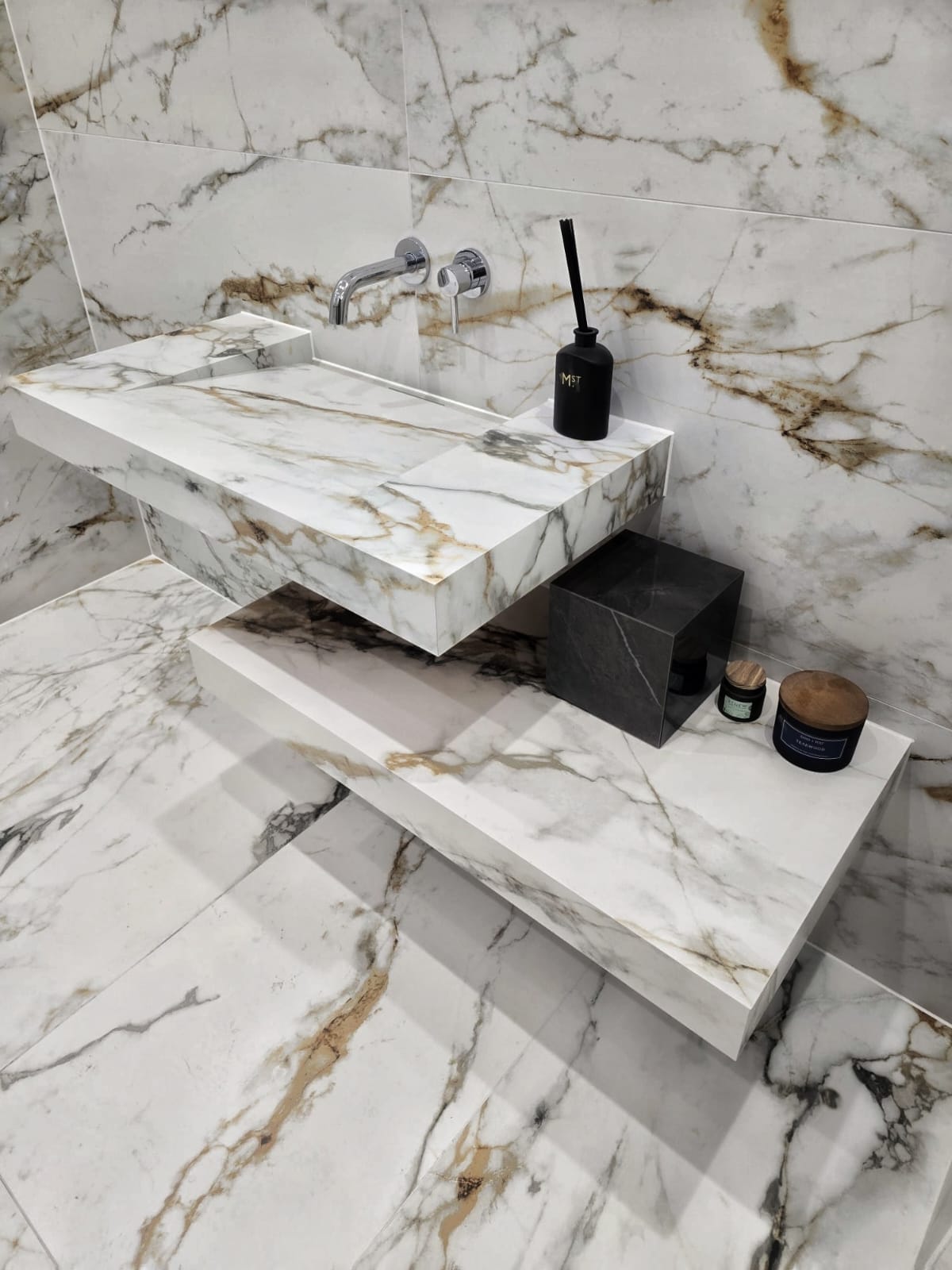 Transform your home or workspace into a masterpiece of elegance with Catania, the ultimate symbol of sophistication and timeless beauty. Featuring stunning white marble tones accented with striking golden veining, these tiles bring opulence and charm to every setting. We like this tile so much we have committed a large display in our showroom including stunning fabricated sink, shelf and niche.