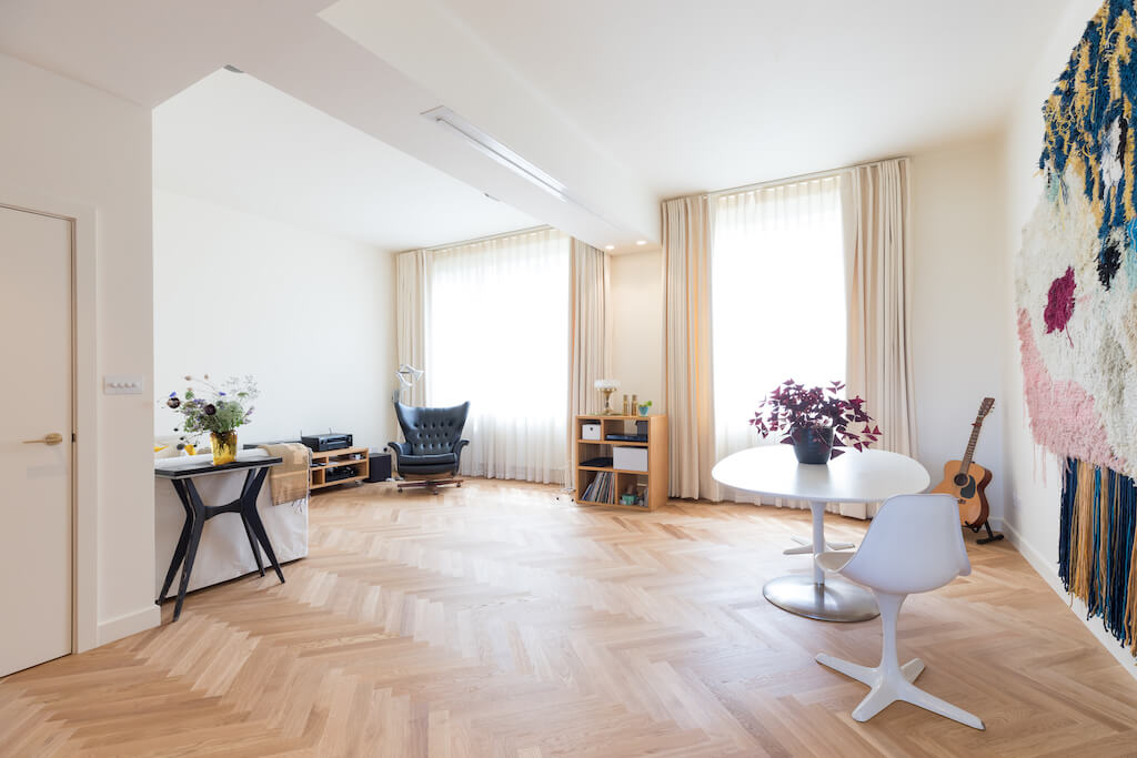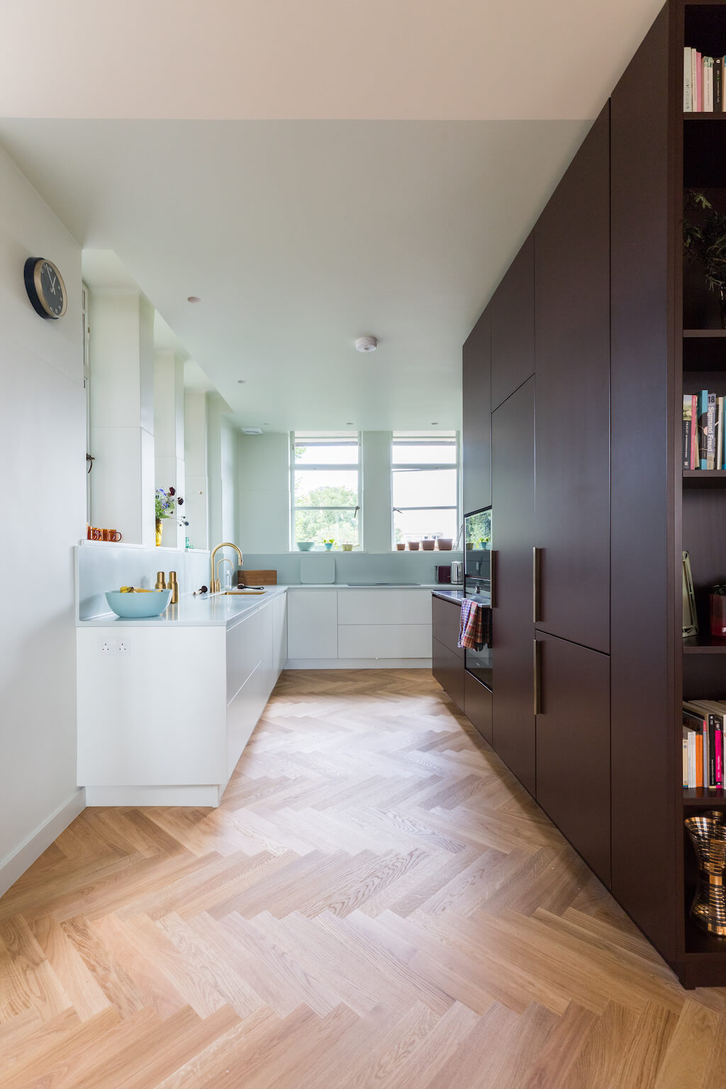 Stunning oak parquet flooring was fitted throughout, working beautifully with the new bespoke window dressings covering the particularly large windows of the living area and bedrooms. The ceiling was opened up above the kitchen and living area, with modern electrics and lighting chosen for maximum ceiling height, while also allowing for a contemporary home entertainment system to be fitted, and natural light to flood the space.