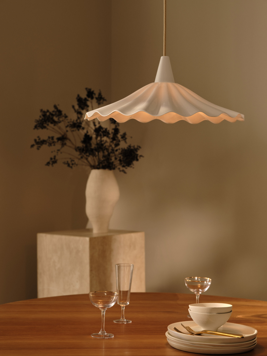 The Christie Range combines playful refinement with timeless craftsmanship. Featuring pendants, rise-and-fall pendants, ceiling lights, and wall lights, its pleated bone-china shade suits both classic and contemporary interiors. All shades are made by our team of experts in our Stoke-on-Trent pottery.
