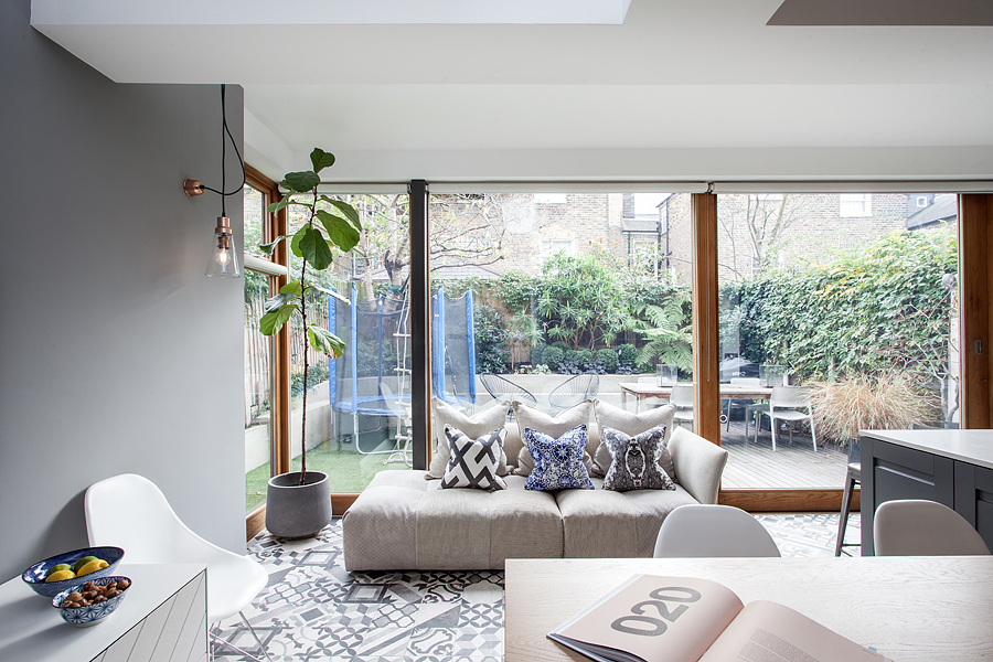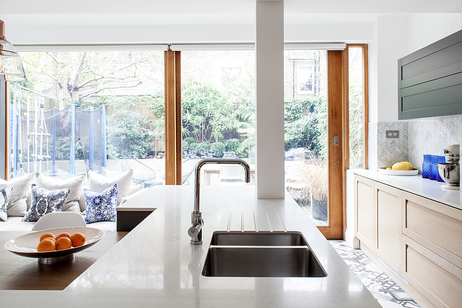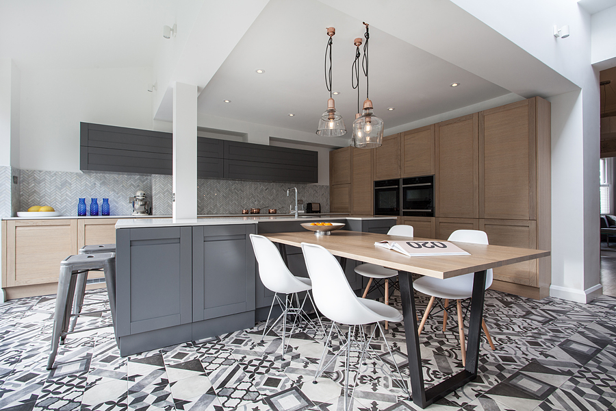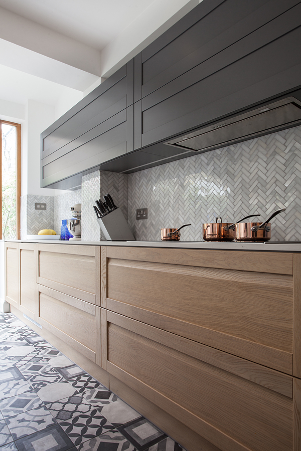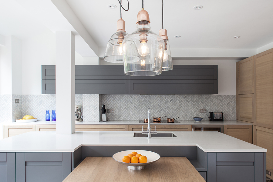 This formerly crammed old kitchen was transformed into a light and airy contemporary multi-functional family room in a light industrial style, complete with a breakfast bar, large dining table that can be turned at 90deg to accommodate up to 8 people for dinner parties and a comfortable modular sofa from where kids can watch TV. Base and tall units in solid bleached stone oak, with matching handless shaker style Pepper Grey matte island and wall units.
