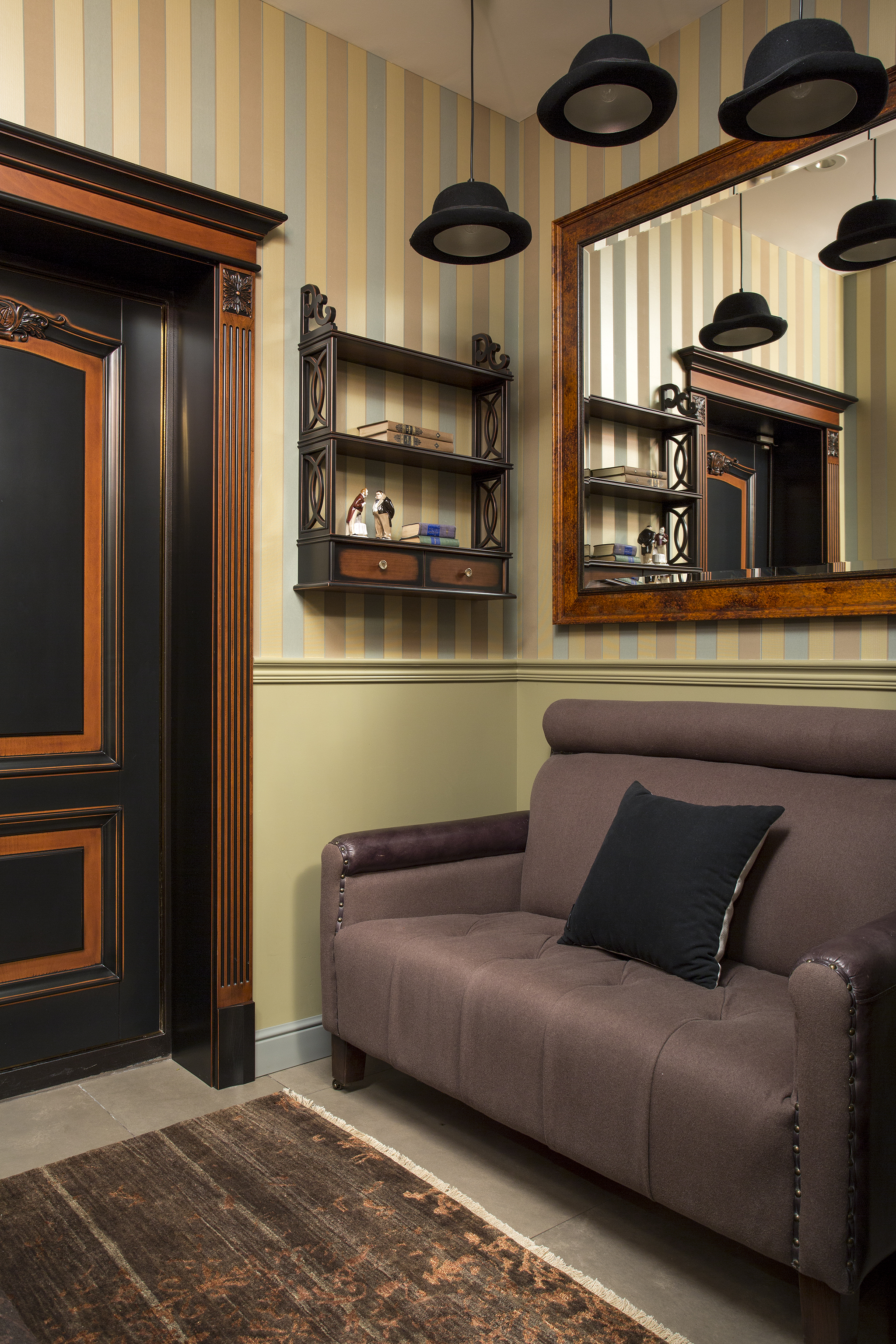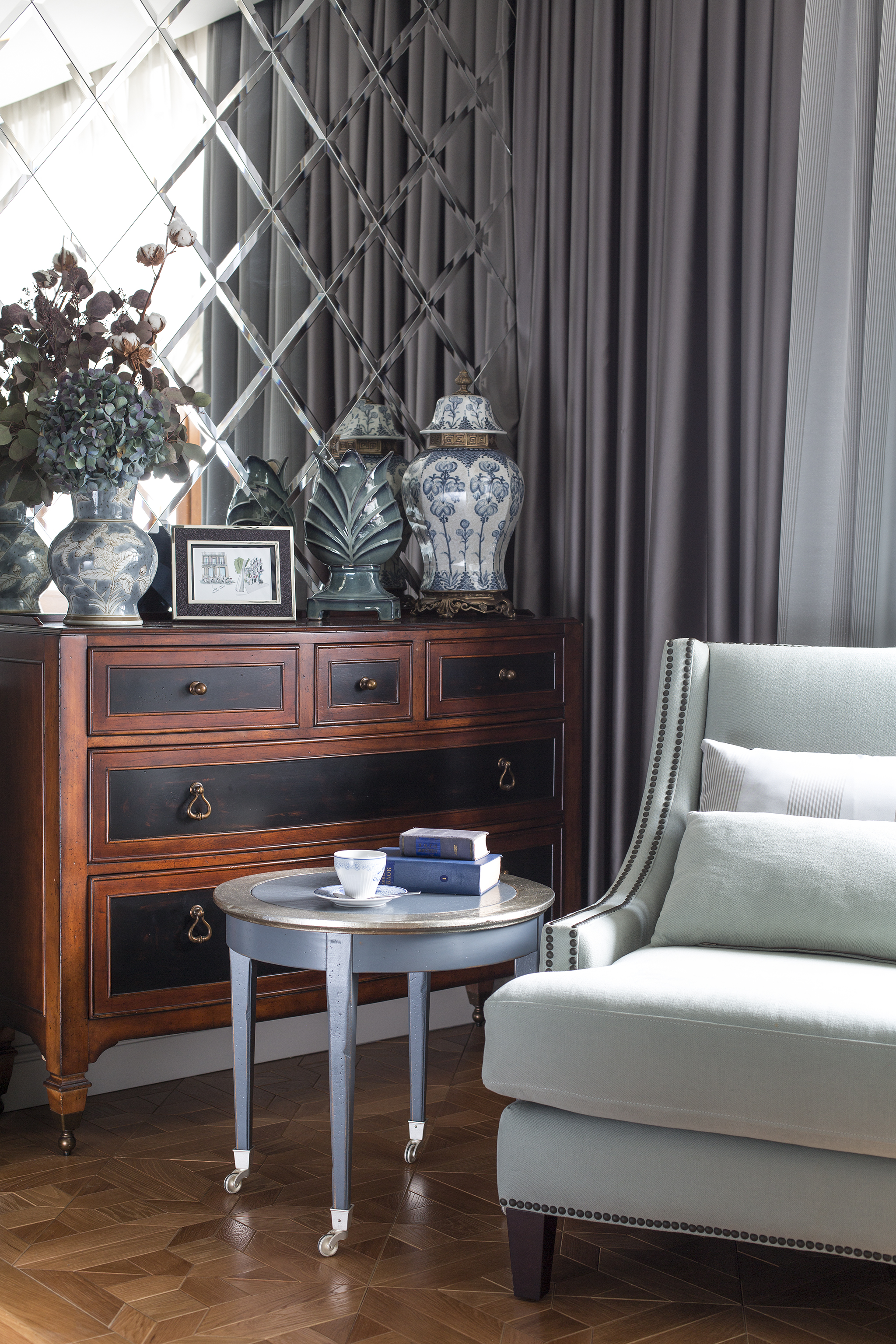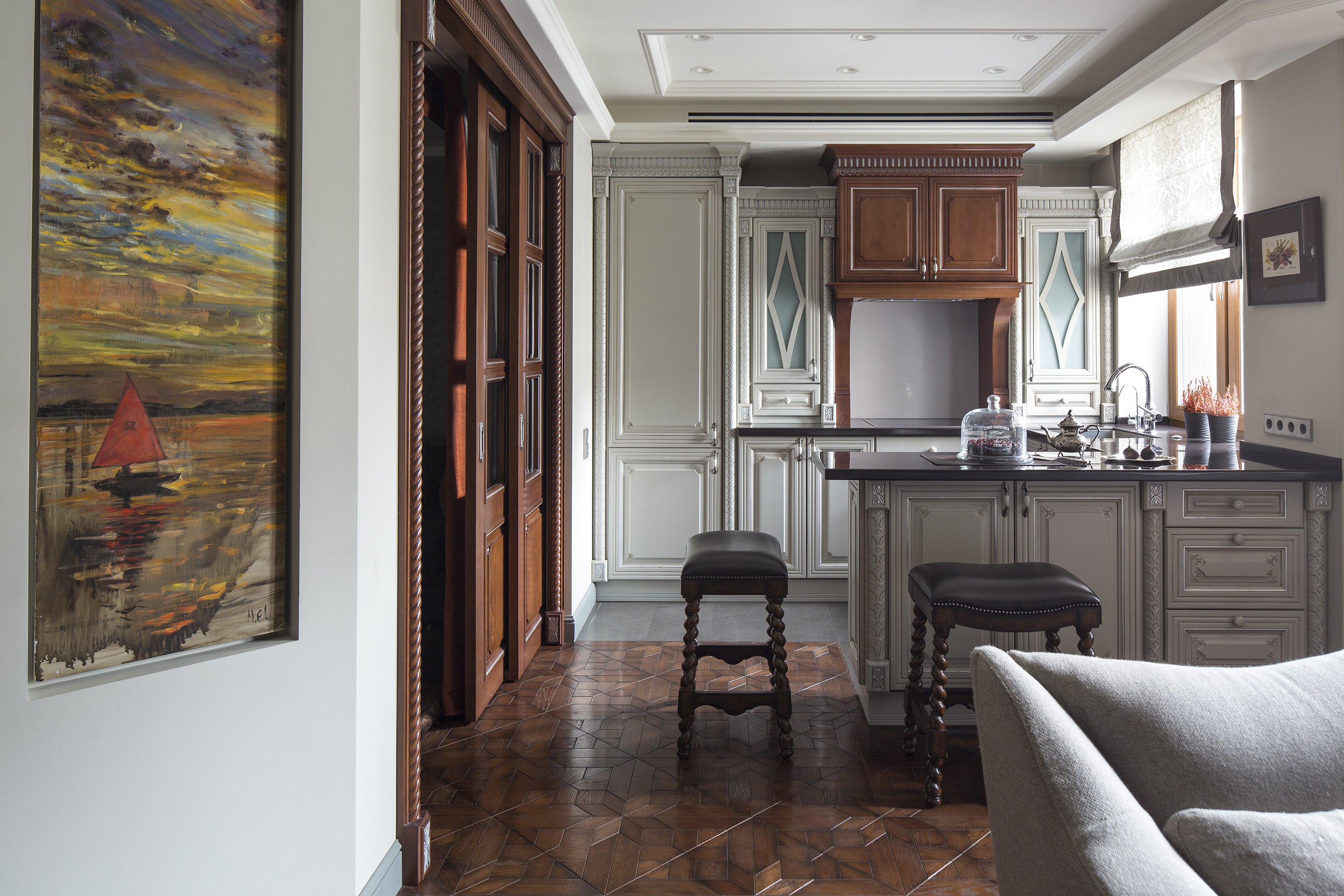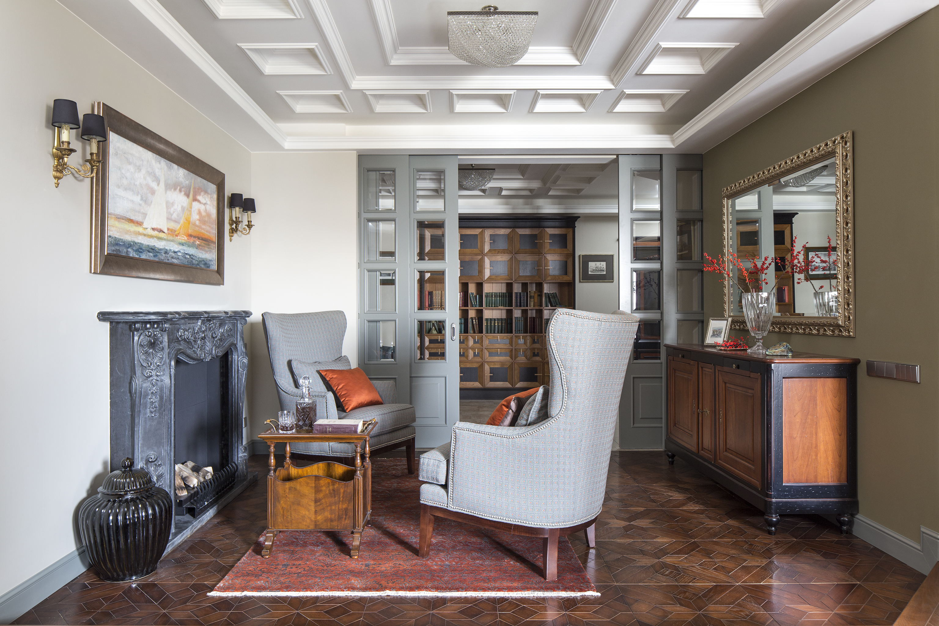 We started with the floor plans and a new layout of the apartment. The apartment is divided into two areas facing the opposite sides of the building - a public one with an open space living room, a tv zone and a fireplace, a game room and a library room; and a private one - which consists of en-suite bedroom. The bedroom enjoys a marvellous view on a river and a forest and enjoys the sun rise. The apartment is developed with the traditional American furniture pieces as well as vintage and bespoke details. The earthy colour palette adds coziness and atmosphere to the place.