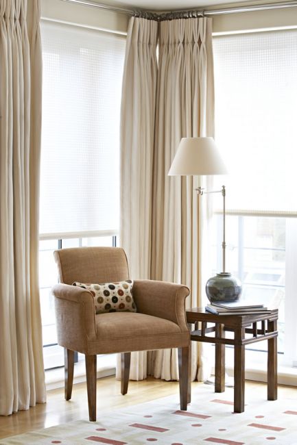The decoration was kept simple, because of the low ceilings, using plain colours and bringing in patten in the decorative cushions. A Carew Jones Perspex coffee table was used, so as not to detract from the colours of the carpet, in keeping with the contemporary feel. This was also expressed in the plain nickel curtain poles and white linen curtains.
