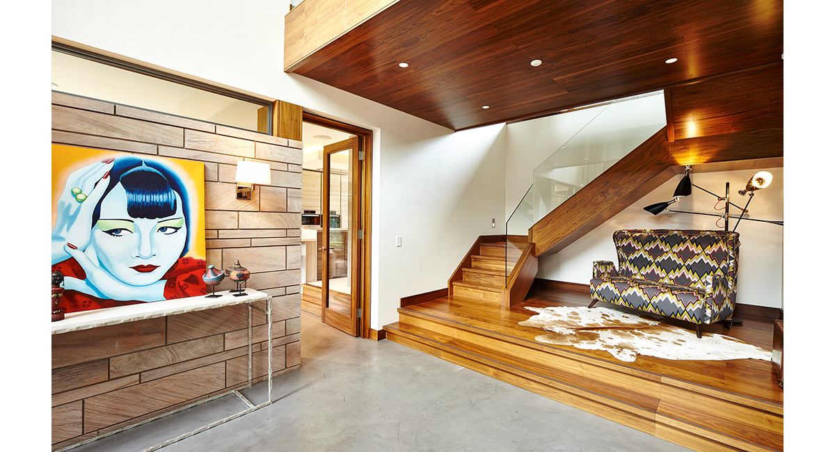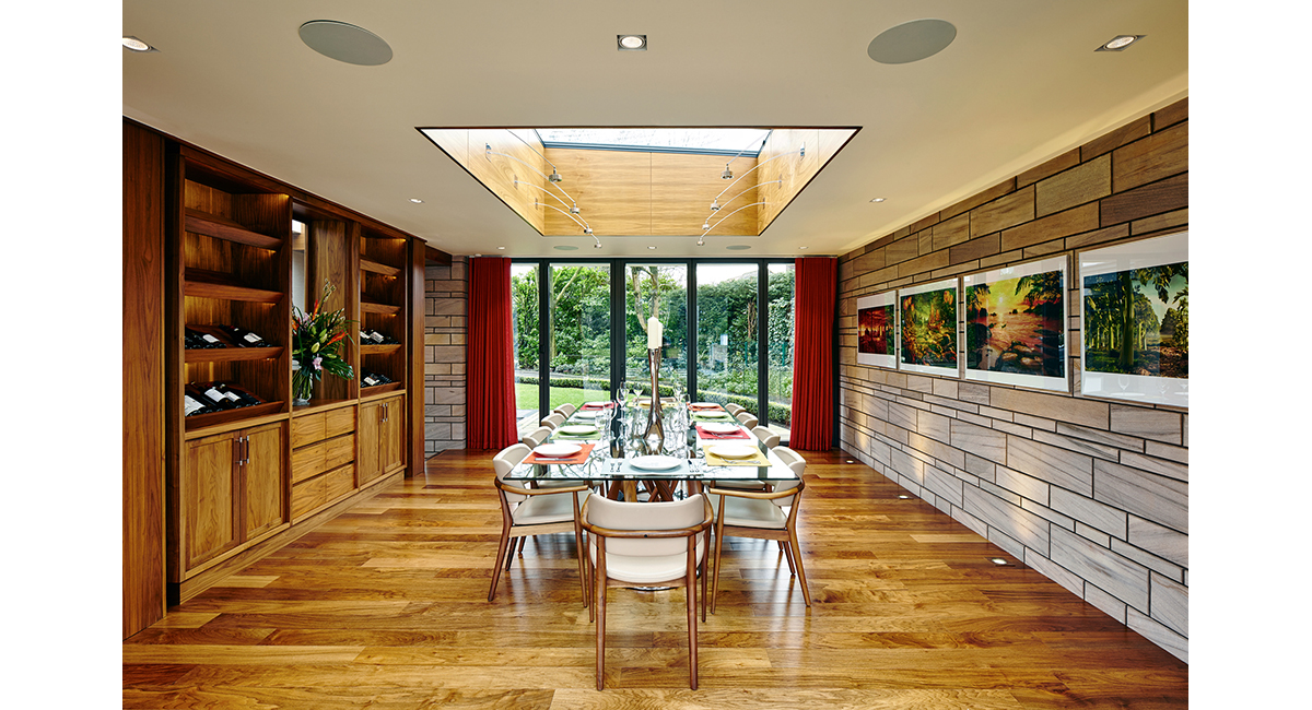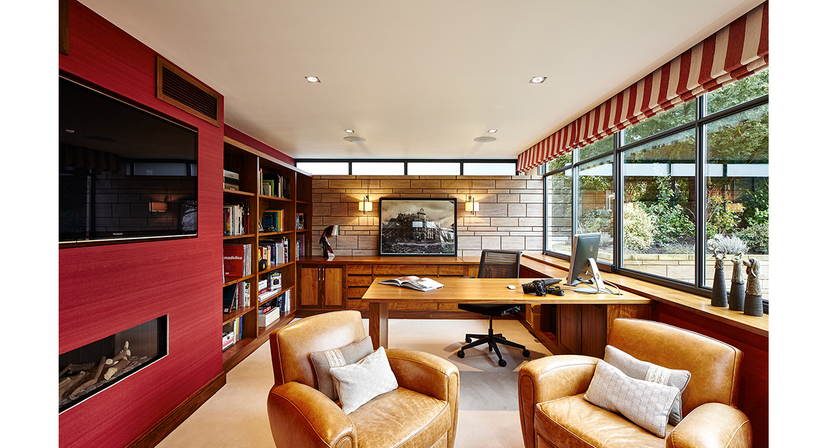 A strong use of colour throughout balanced the strong materials we helped the client choose - including walnut joinery, polished concrete flooring and feature sandstone walls.