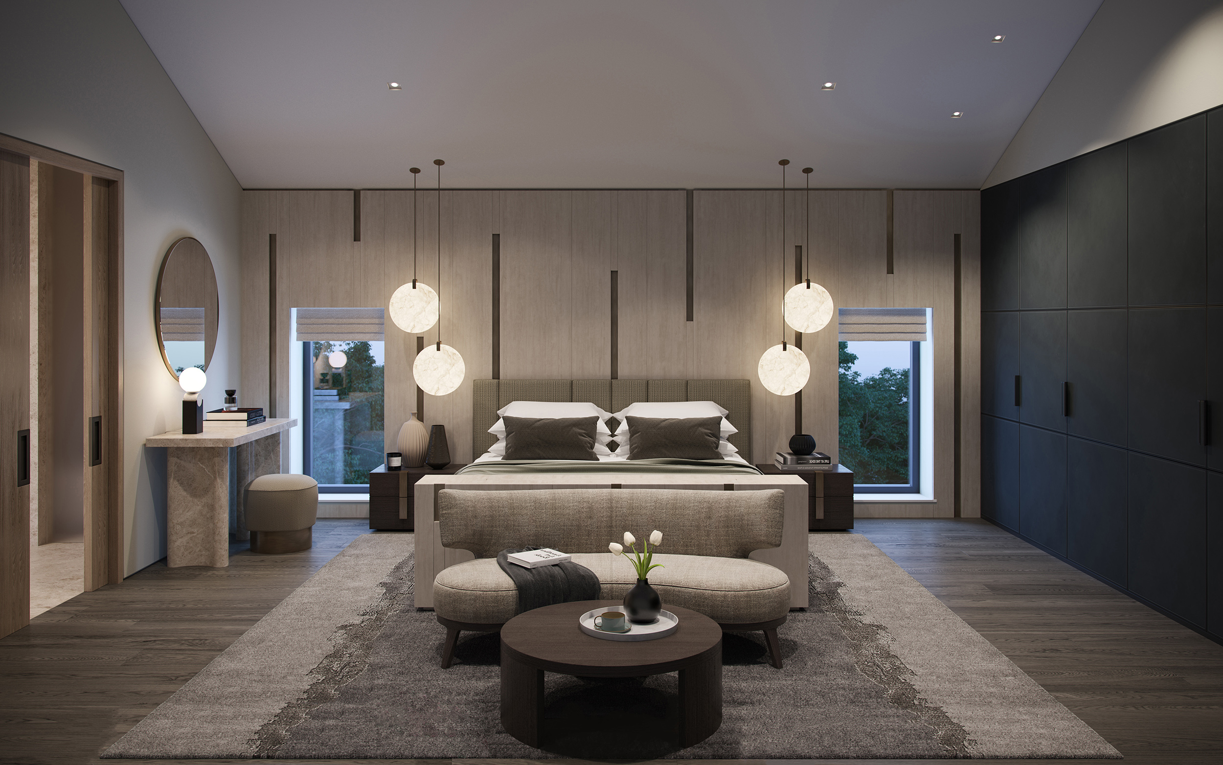 This contemporary master bedroom scheme features a bespoke wall with light timber veneer and bronze vertical panelling, to surround the windows and frame the bed