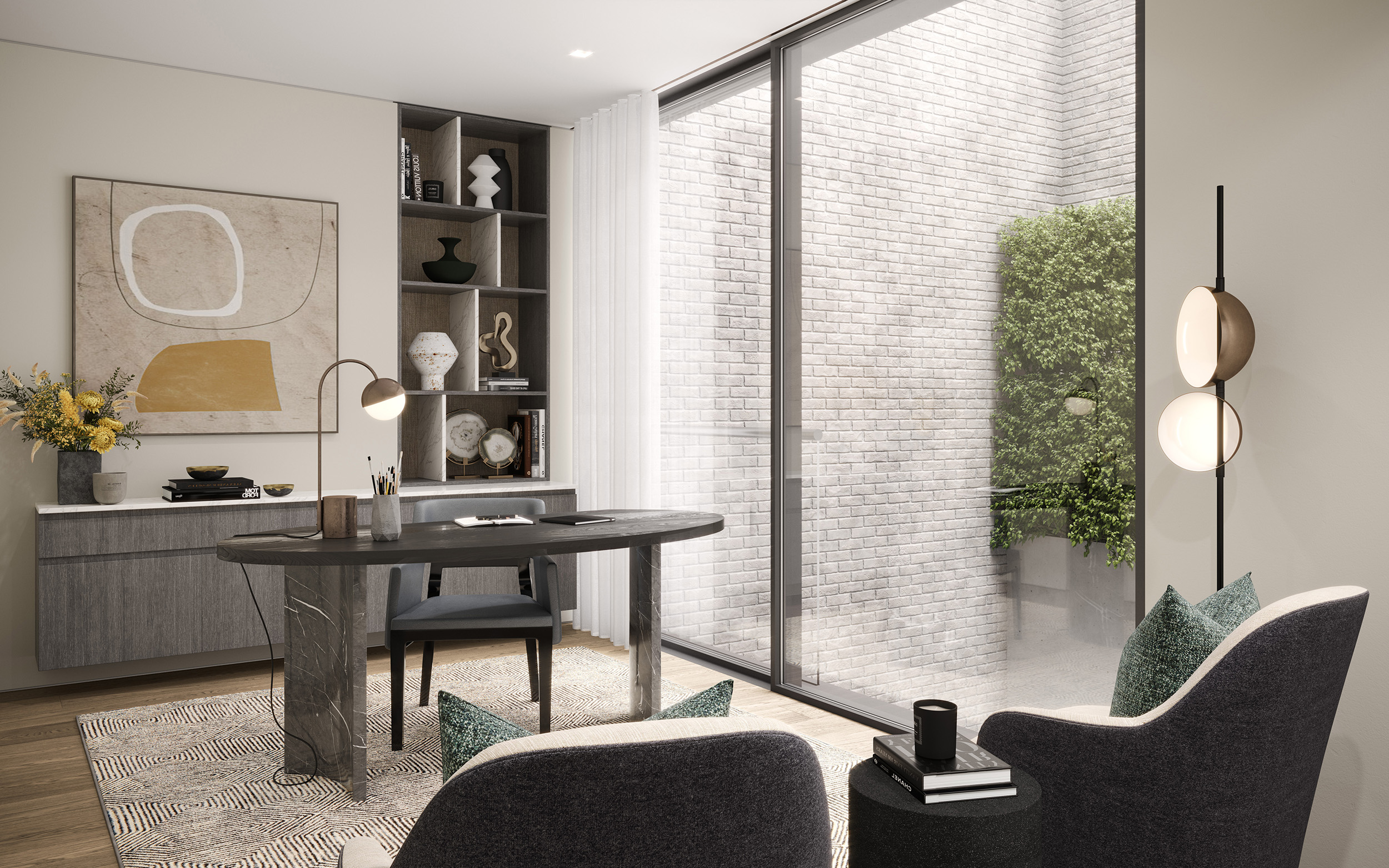 This home office features vast amounts of light and greenery through floor-to-ceiling windows, and incorporates bespoke joinery into the alcove space