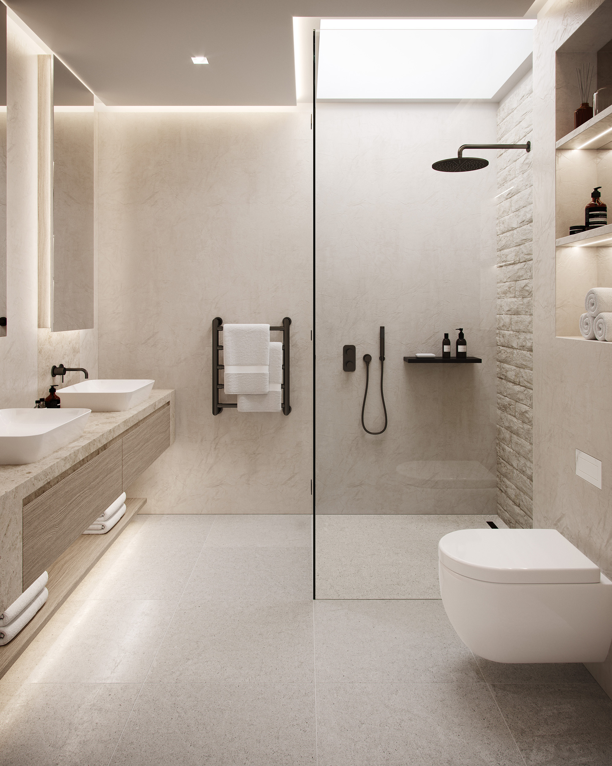 Luxury penthouse master en-suite uses soft lighting to create a perfectly relaxing space