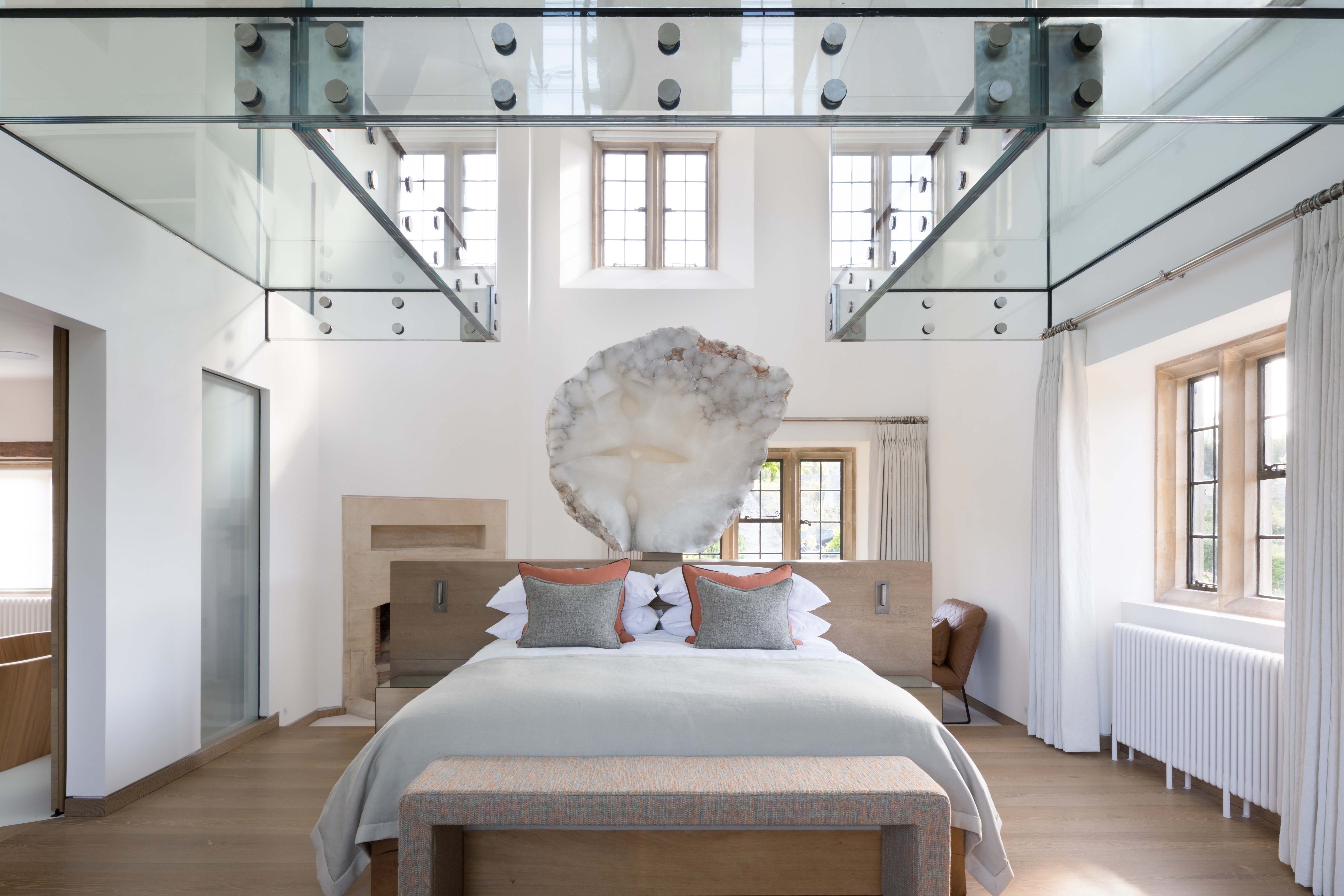 The design concept fuses contemporary and traditional materials whilst exposing and enhancing the traditional fabric of the building. Particuler areas included creation of a bespoke kitchen incorprating dining and sitting areas, creating a double height master suite by removing an upper floor bedroom and converting an old indoor pool house into an industrial-style gym. Textural layers and a softly neutral palette throughout provide a background against which the owners' collection of contemporary sculpture and eclectic artefacts are beautifuly displayed.