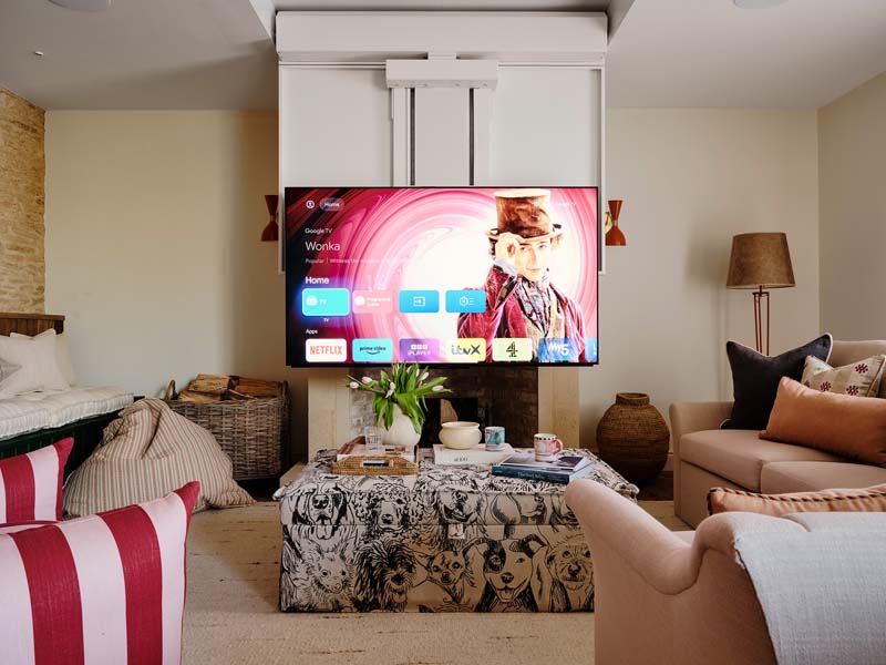 The audio setup includes a blend of plaster-in speakers and in-wall speakers from Sonance, and in-wall subwoofers from Artison, discreetly hidden behind acoustically transparent horsehair fabric grilles. In the TV snug, Bowers & Wilkins in-ceiling speakers are driven by two Sonos amplifiers paired with a Sonos subwoofer, create a virtual 4.1 surround sound system. A Future Automation CHRST7 ceiling hinge (drop and swivel system) conceals a 75” Sony TV; this required precise coordination with structural engineers due to its 230kg weight. The system is seamlessly controlled via a URC control system, integrating Apple TV and Sky sources.