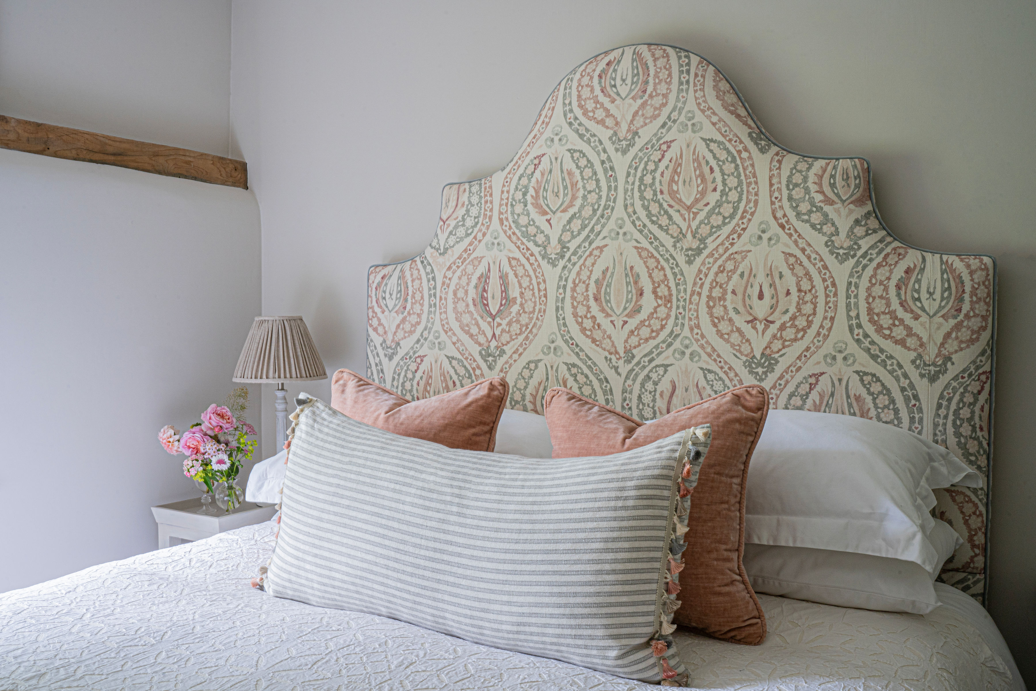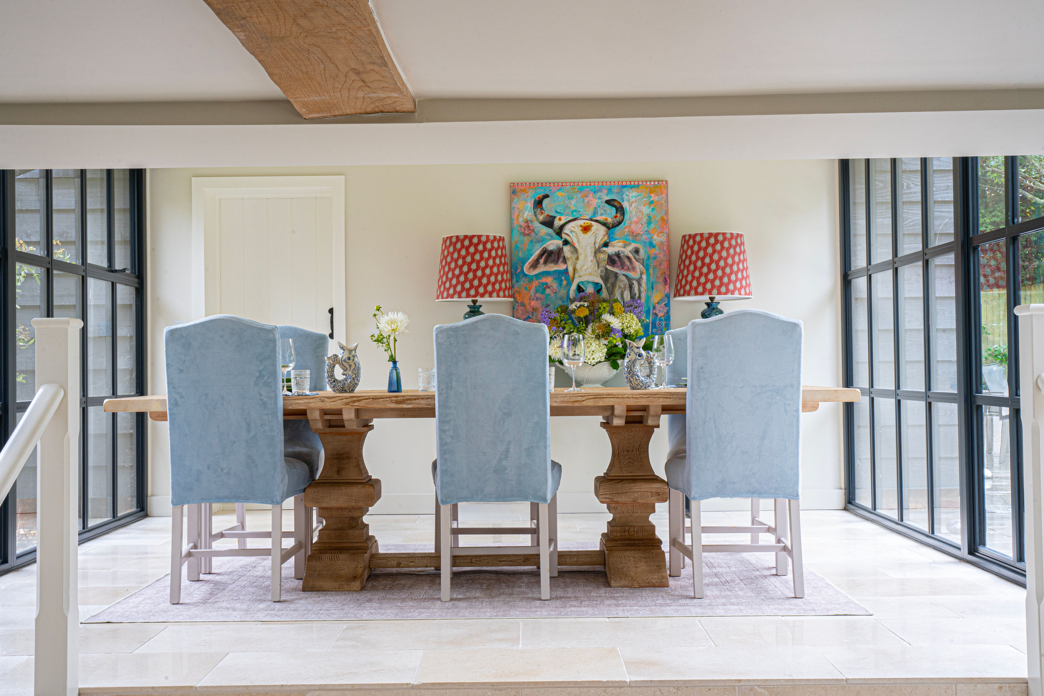 For the full refurbishment of this 19th century barn we delivered turn-key decoration in collaboration with local craftspeople. Taking into account the original architecture, soft country colours were paired with warm, inviting fabrics and trimmings to reflect the harmony of the setting. A second barn was built attaching both properties with a contemporary glass link, adding a layer of modernity to the design.