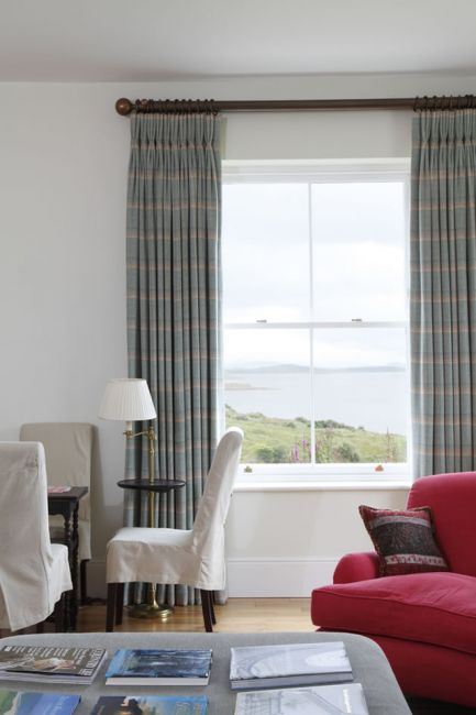 The palette of colours are pale greens, pale blues and greys – these colours reflect the light from the sea, and are counterbalanced with splashes of red and terracotta. The decoration has been kept simple – plains, stripes and checks have been used. Interesting pottery – some of which was bought at an Antiques fair in Bath - prints found in Dublin, and other works of art add warmth and interest to the neutral background colours.
