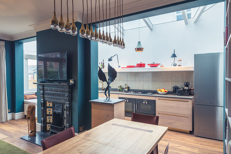 Renovated from multiple bedsits from the 1970's this house was a true transformation which consisted of re-imagining room size and creating more space and light throughout. We extended the kitchen at the back of the house into an open plan diner/sitting room, built around the original fire place. We had a bespoke hand made kitchen with a Basaltina worktop made and installed. The single shelf above the units incorporated the extraction. The banquette overlooking the garden also provided extra storage below.