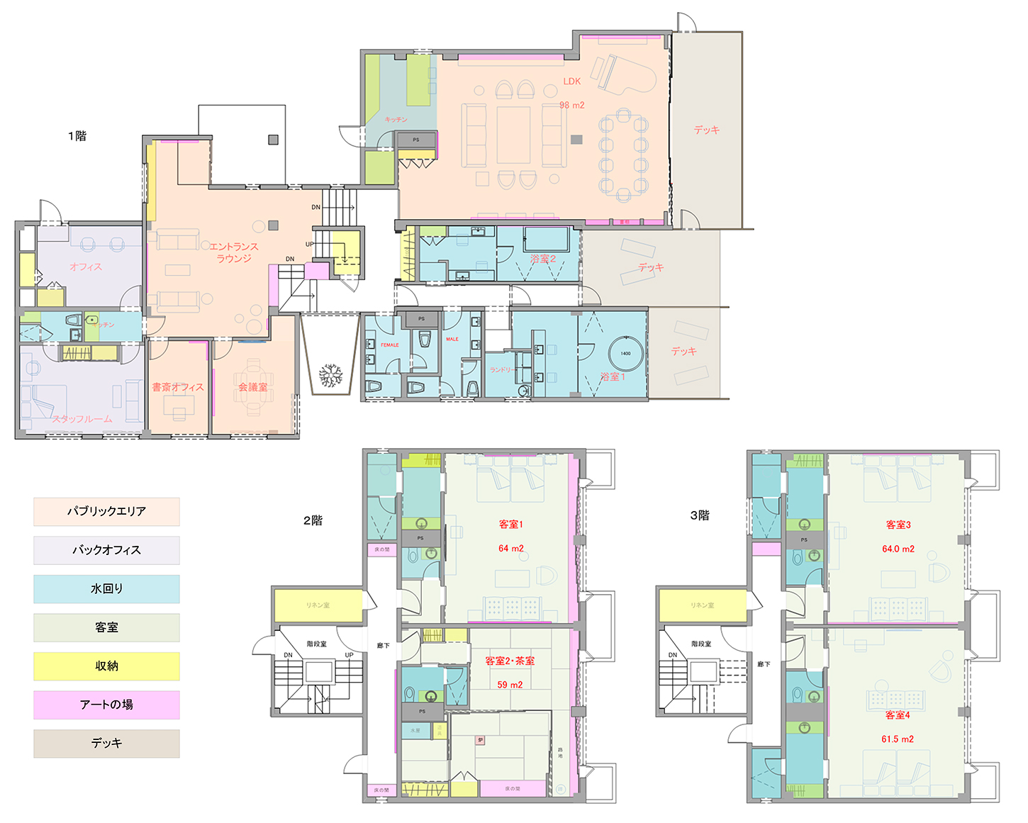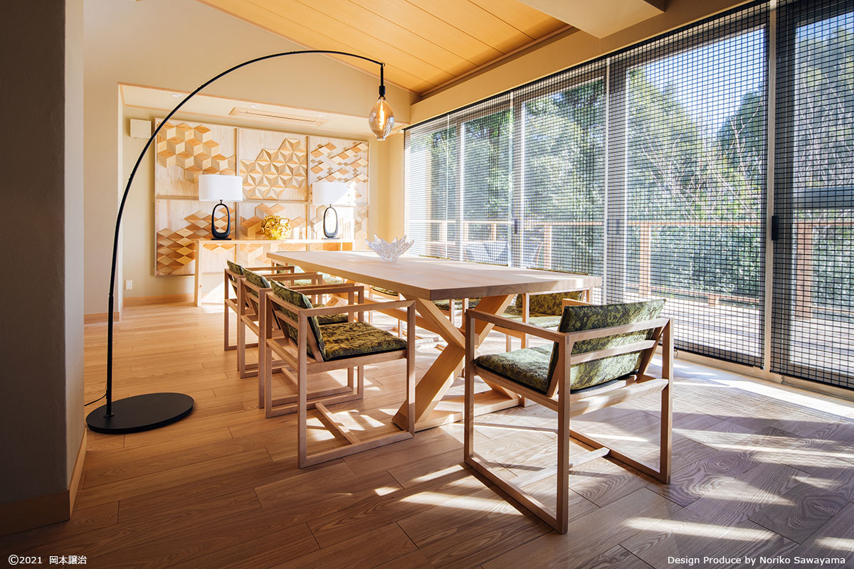 Public spaces include a lounge with a substantial deck, suitable for salon seminars and concerts, in addition to a living/dining/kitchen area. There are also two private bathrooms with large decks, and a shared office and meeting room that is conducive to remote work, making it perfect for workcations. The facility boasts a high level of entertainment value, featuring a tea room for authentic tea ceremonies and a gallery space for private exhibitions.