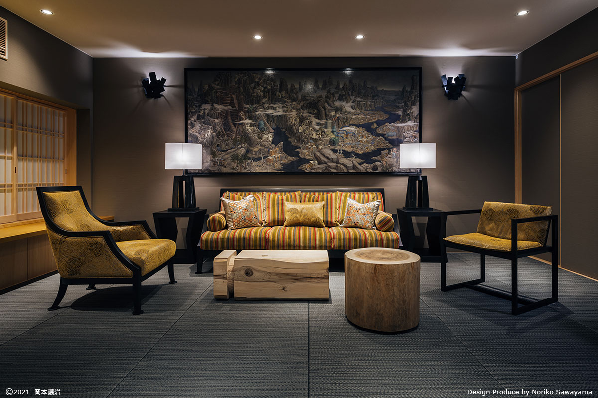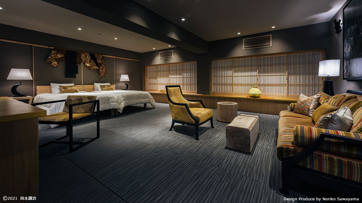 The 640 m² facility, which serves as the owner's villa, is available for rental as a whole or as individual rooms. Guests can choose to rent four spacious guest rooms or book each facility by the hour. The average size of the guest rooms is 62 m², including a Japanese-style suite featuring an authentic Urasenke tea room. These rooms showcase impressive large-scale art created by Japanese artists, with each designed by three international designers, each following a distinct theme.