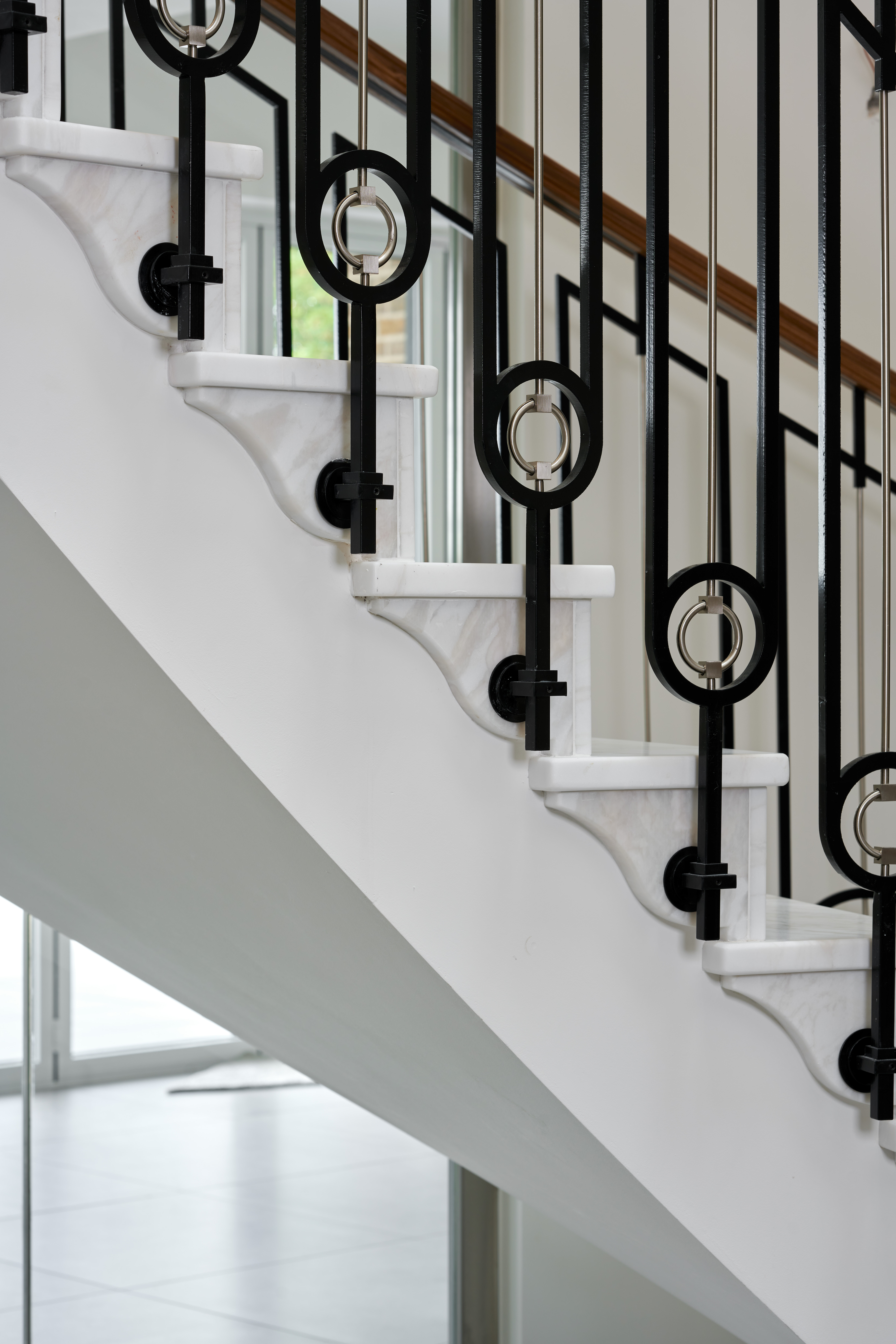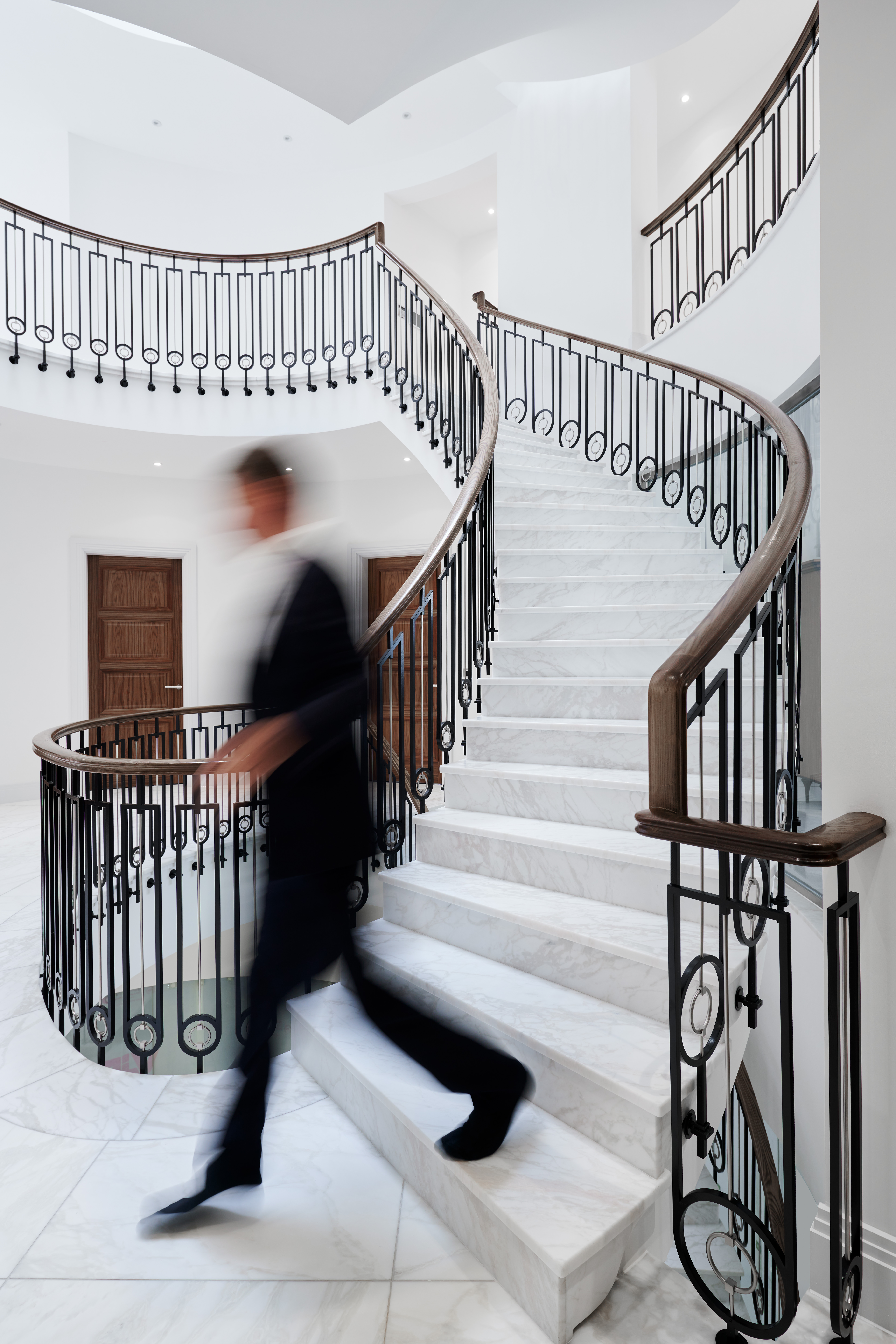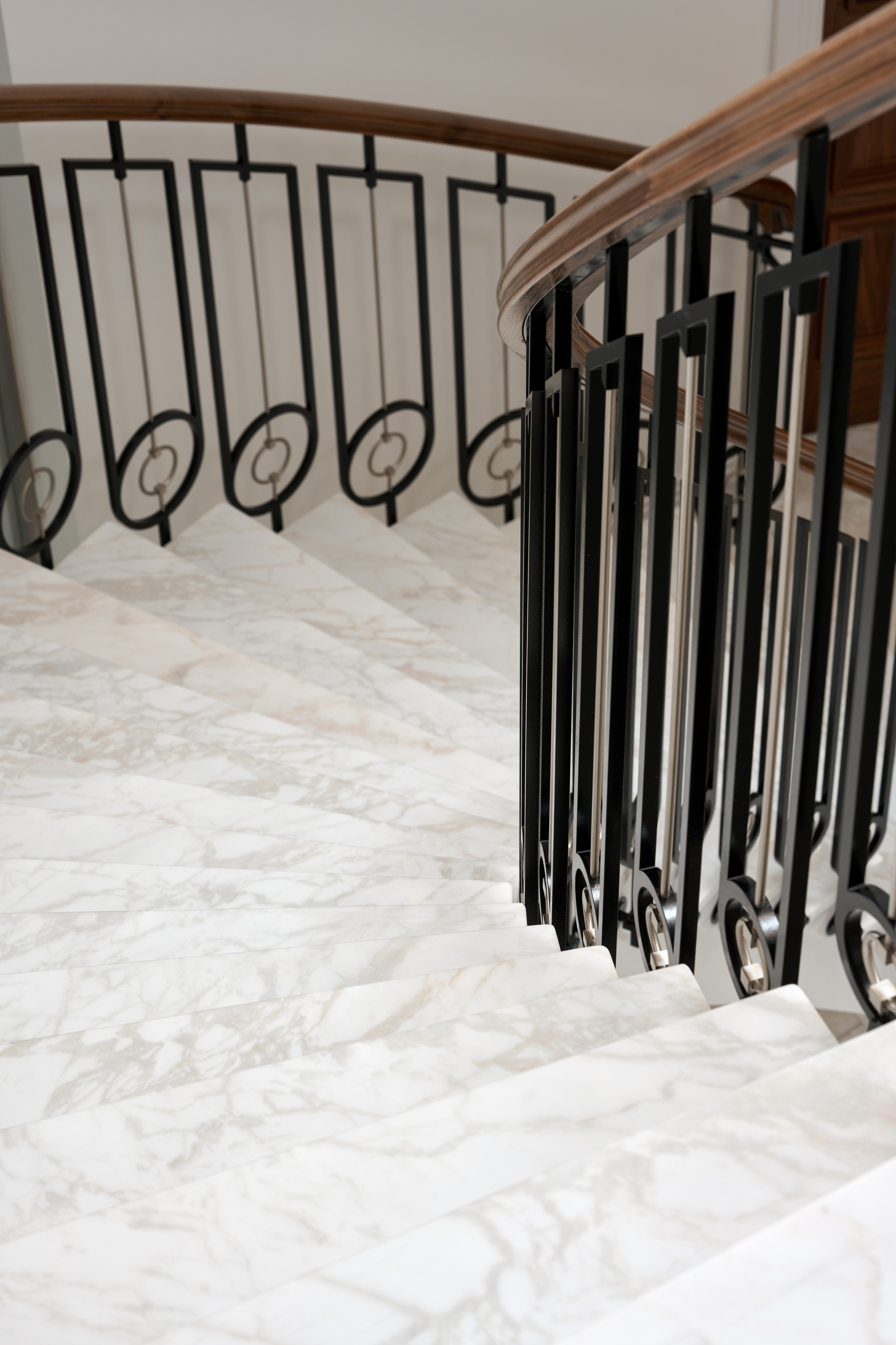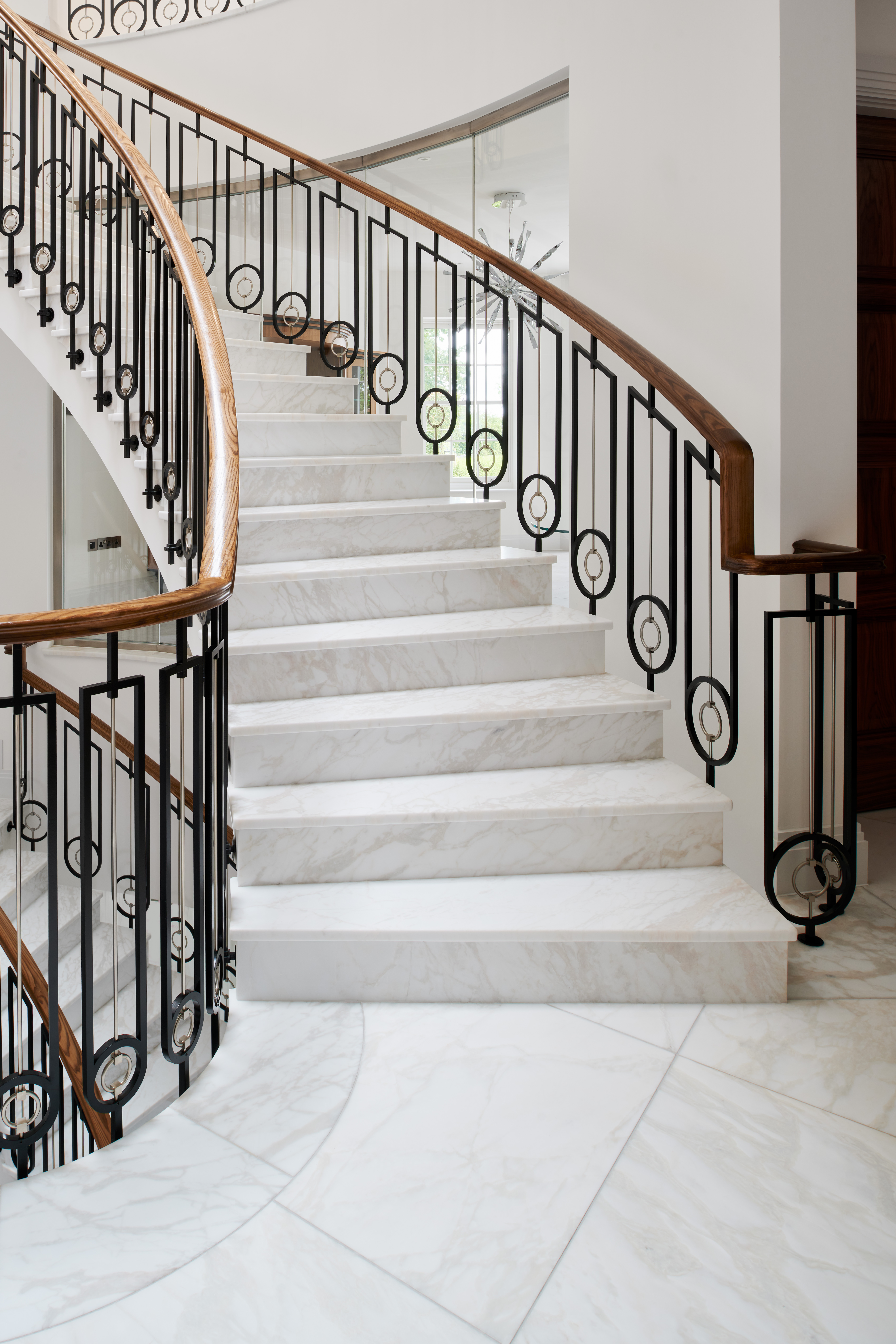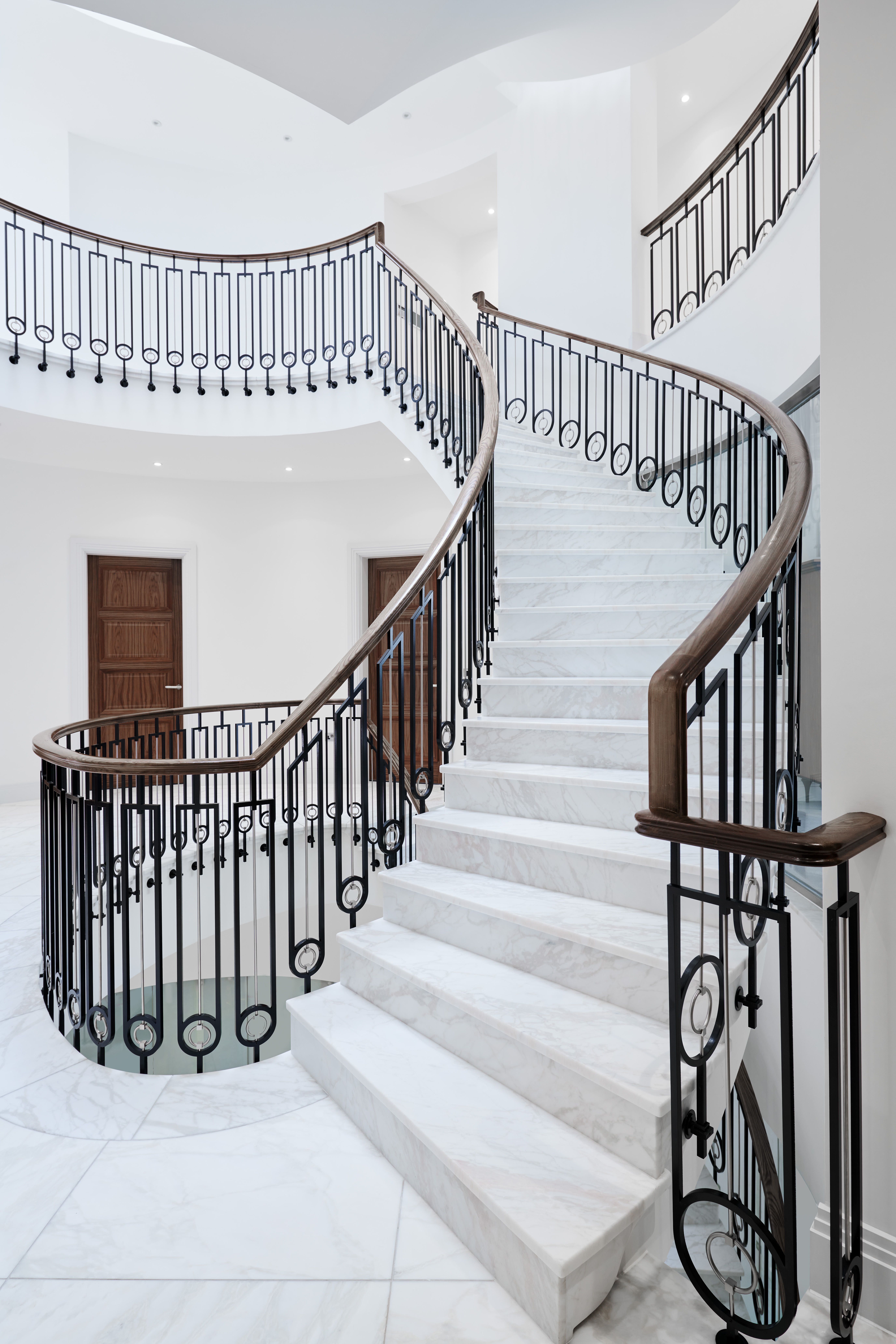 A spectacular sprawling spiral staircase clad in opulent Florida White Marble creates a high impact statement in this luxury family home. It runs all the way from the basement to the second floor and centralises precisely to the front door for perfect symmetry and an unforgettable first impression.