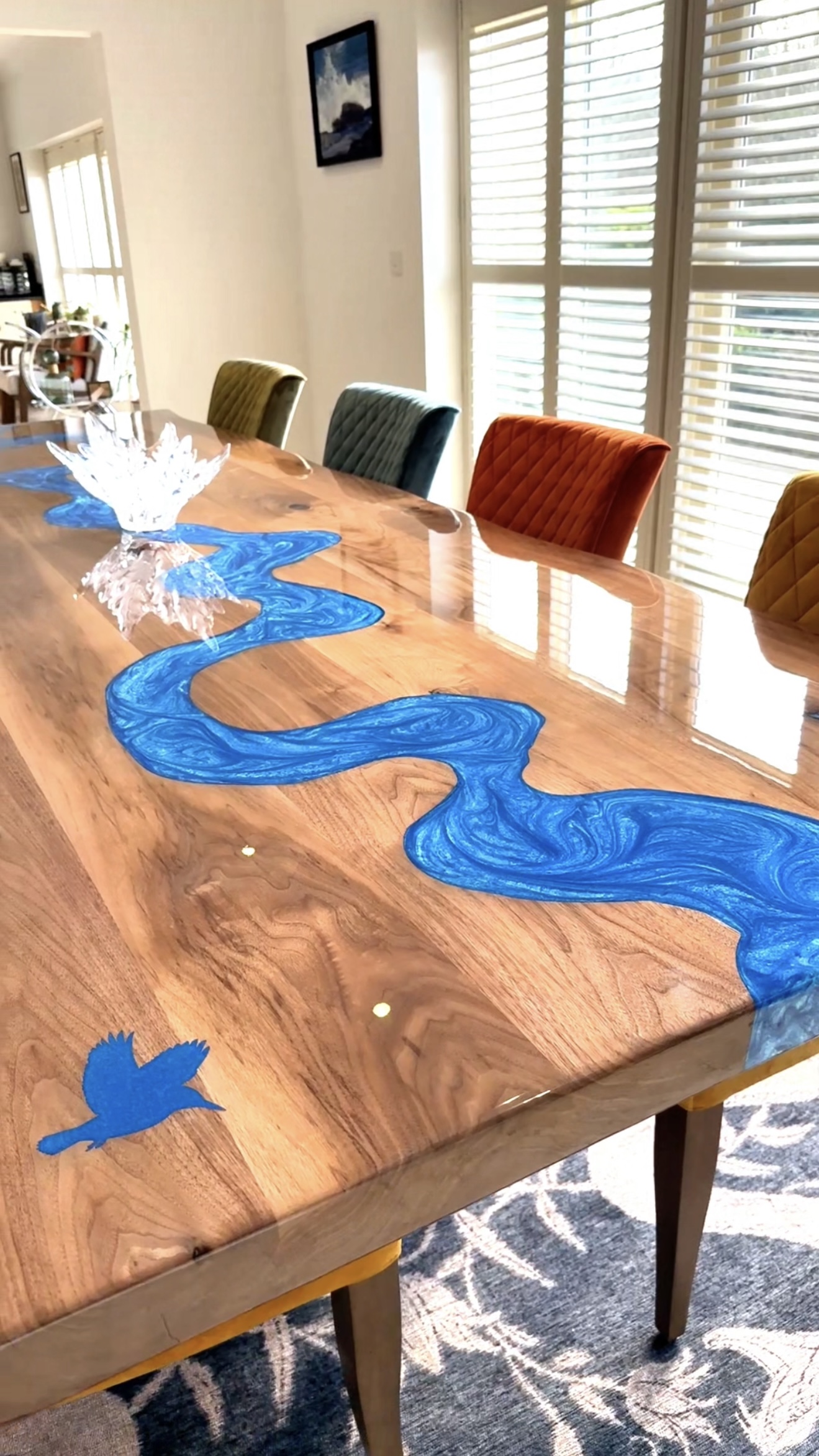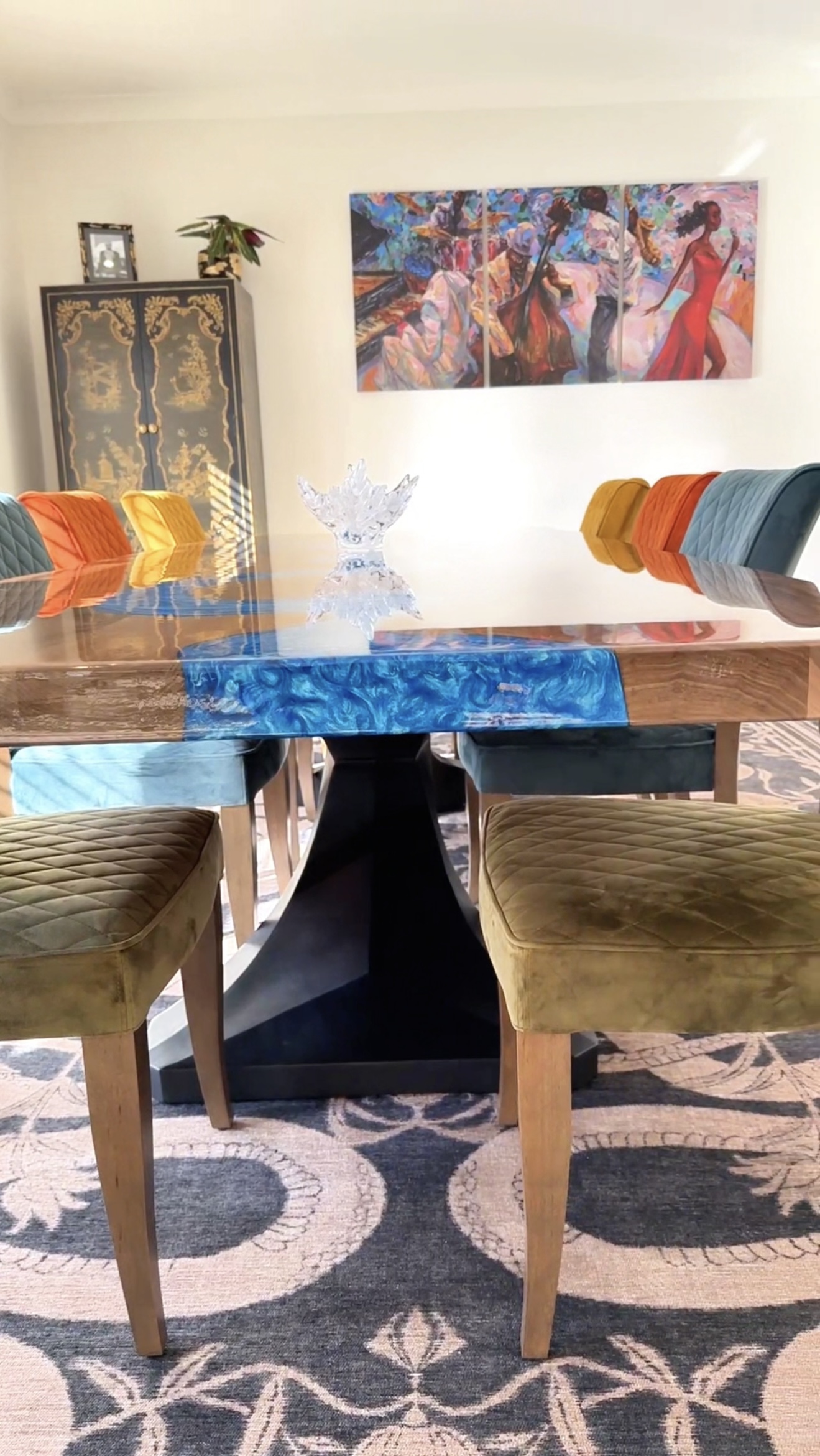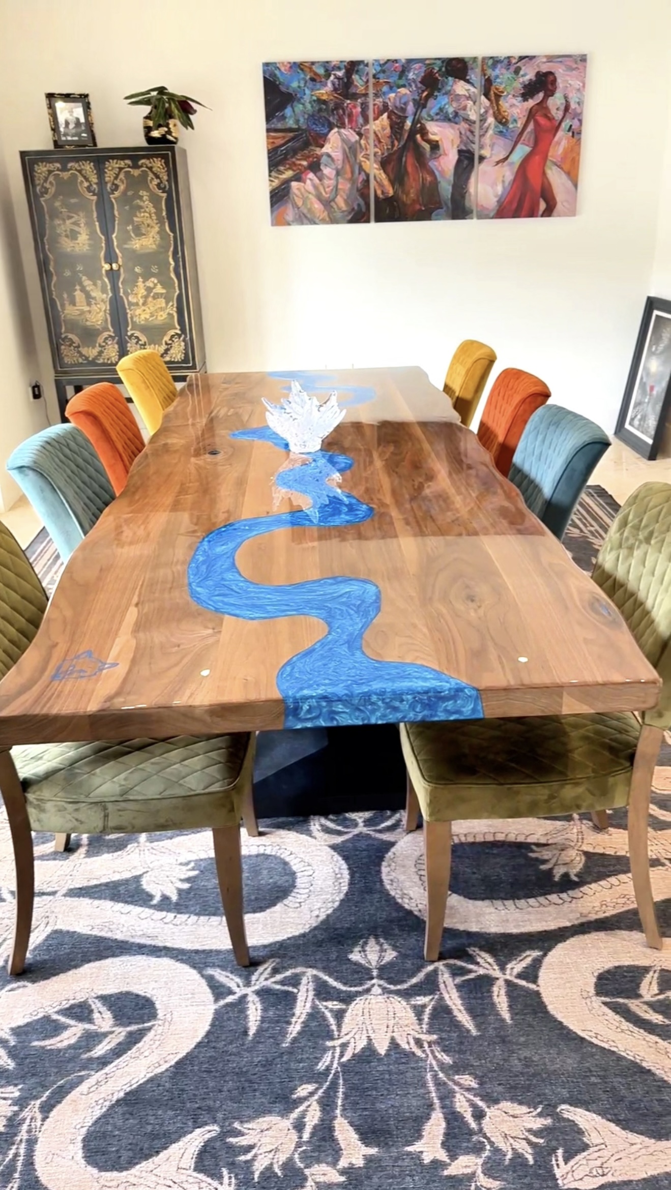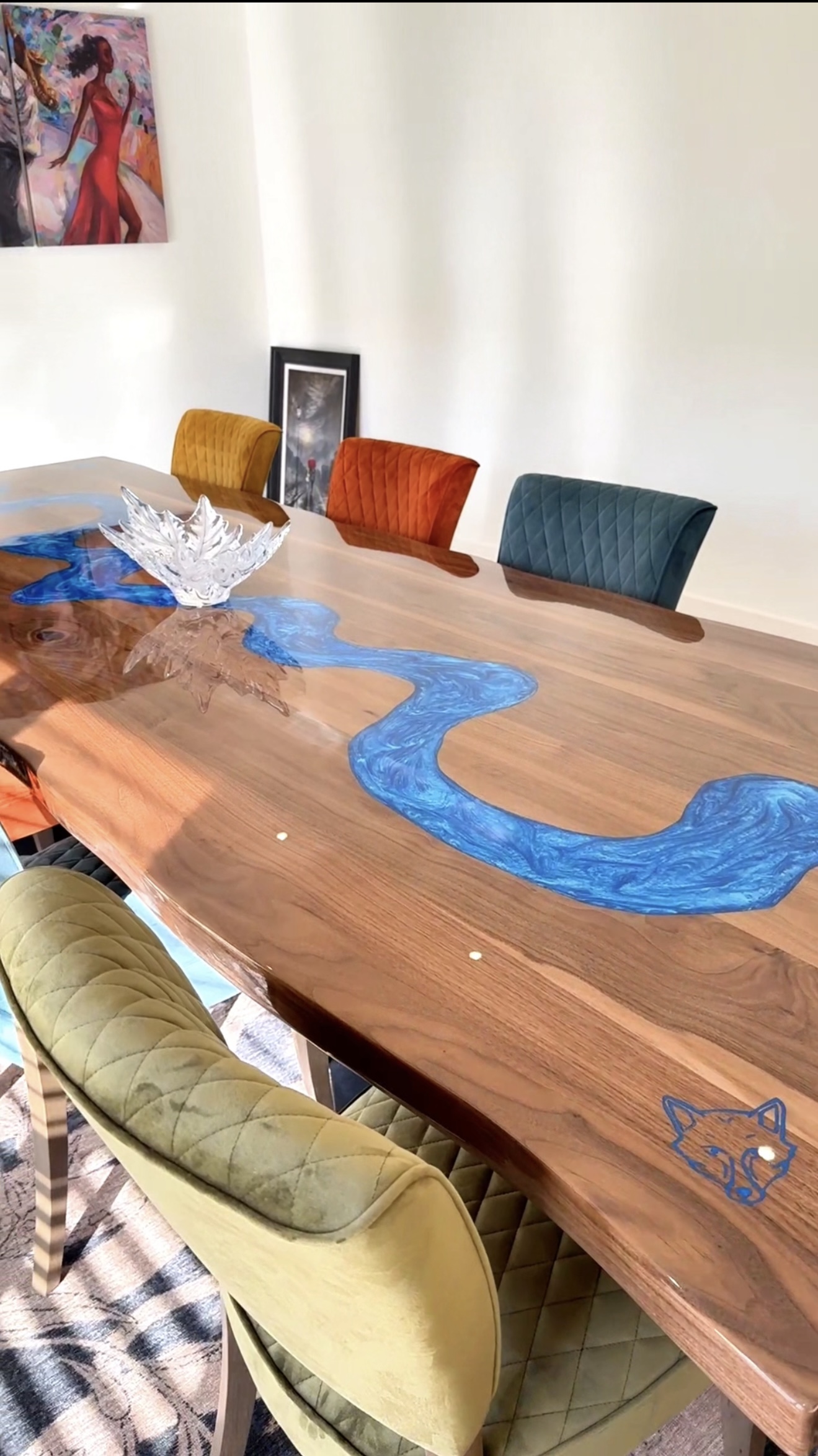 Crafted with heart, this bespoke Walnut & ‘Olympic Blue’ River Resin dining table is more than just furniture—it’s a story.