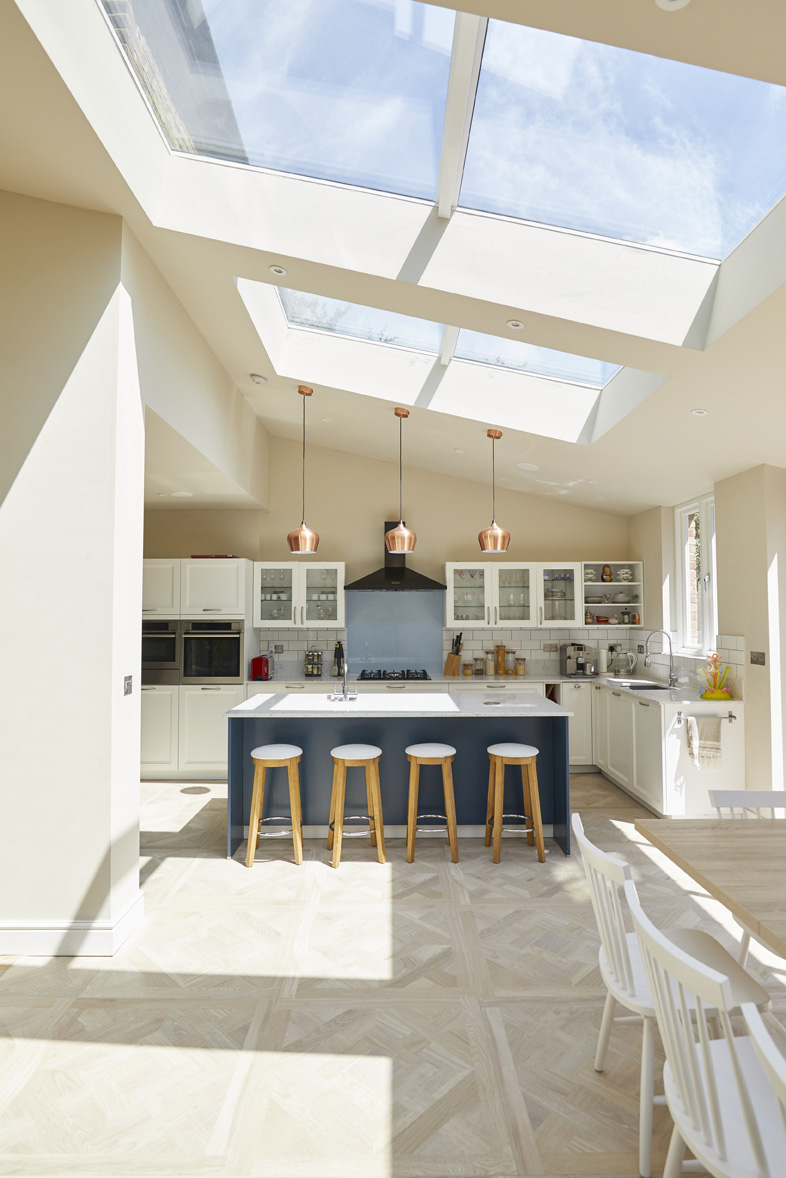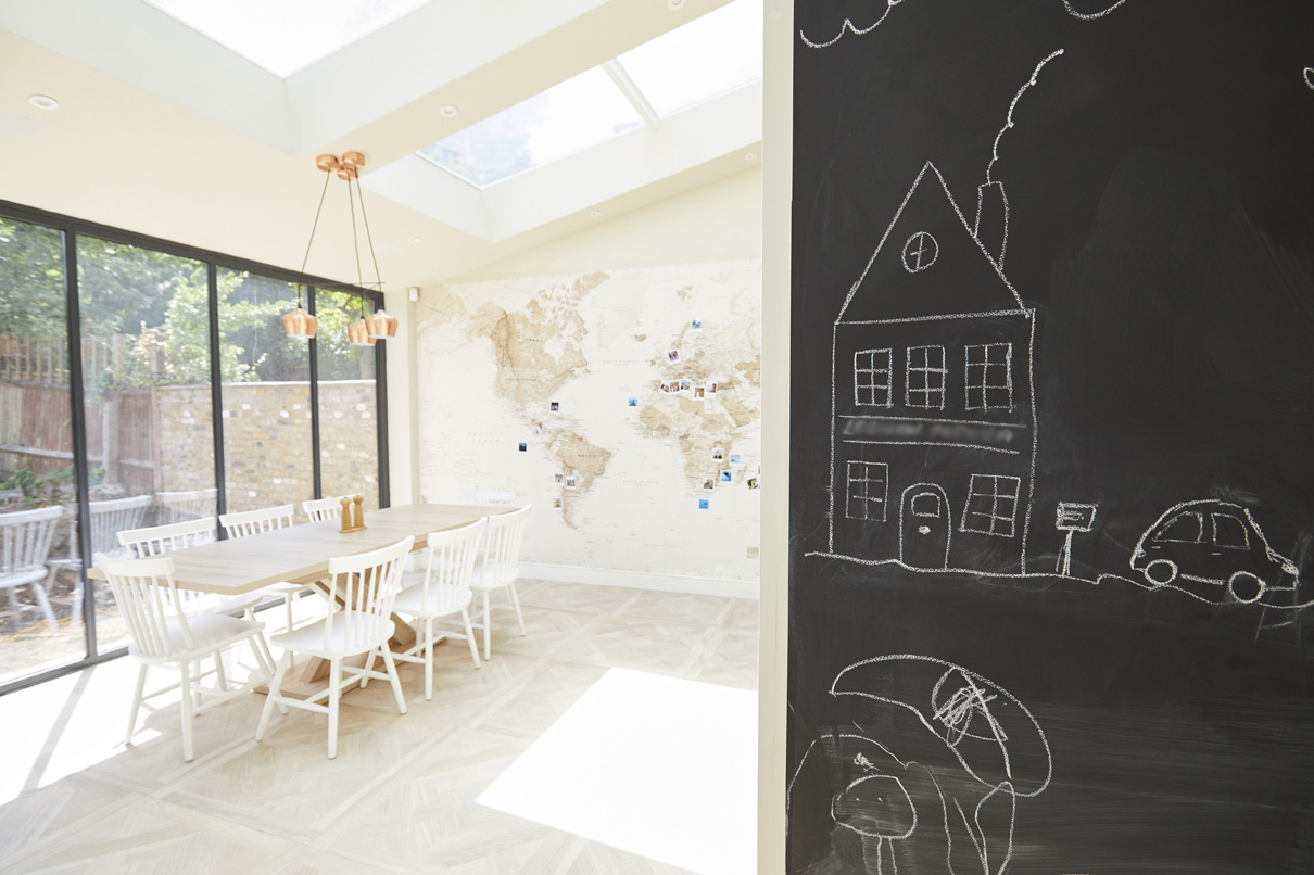 This house was formerly a dilapidated, tired and dark property. My clients - Franco/Russian - bought it wanting to create a light, bright, family home. Both had extensive hobbies and interests, we designed a glorious open house, flooded with light and reflecting their personalities.