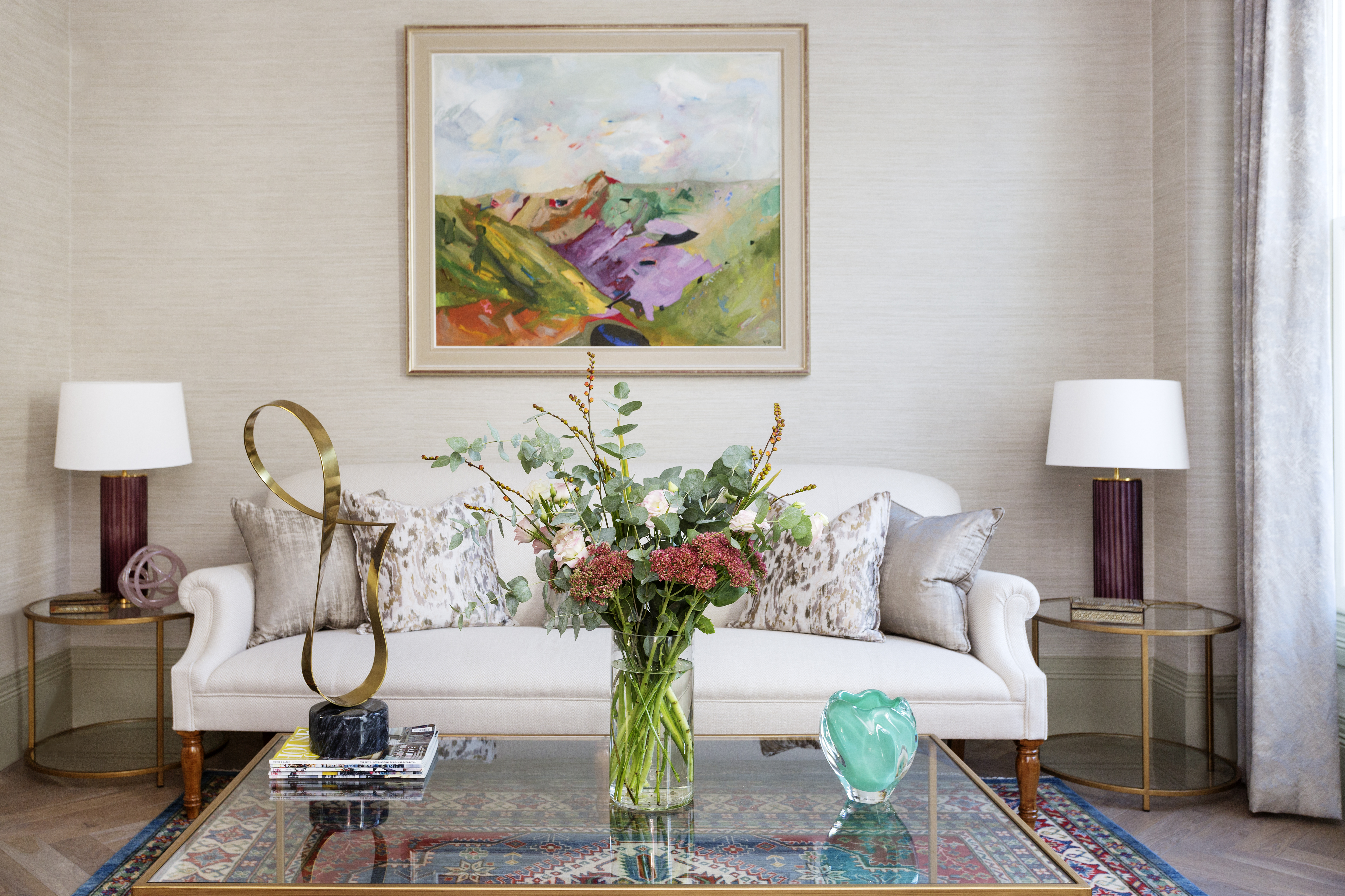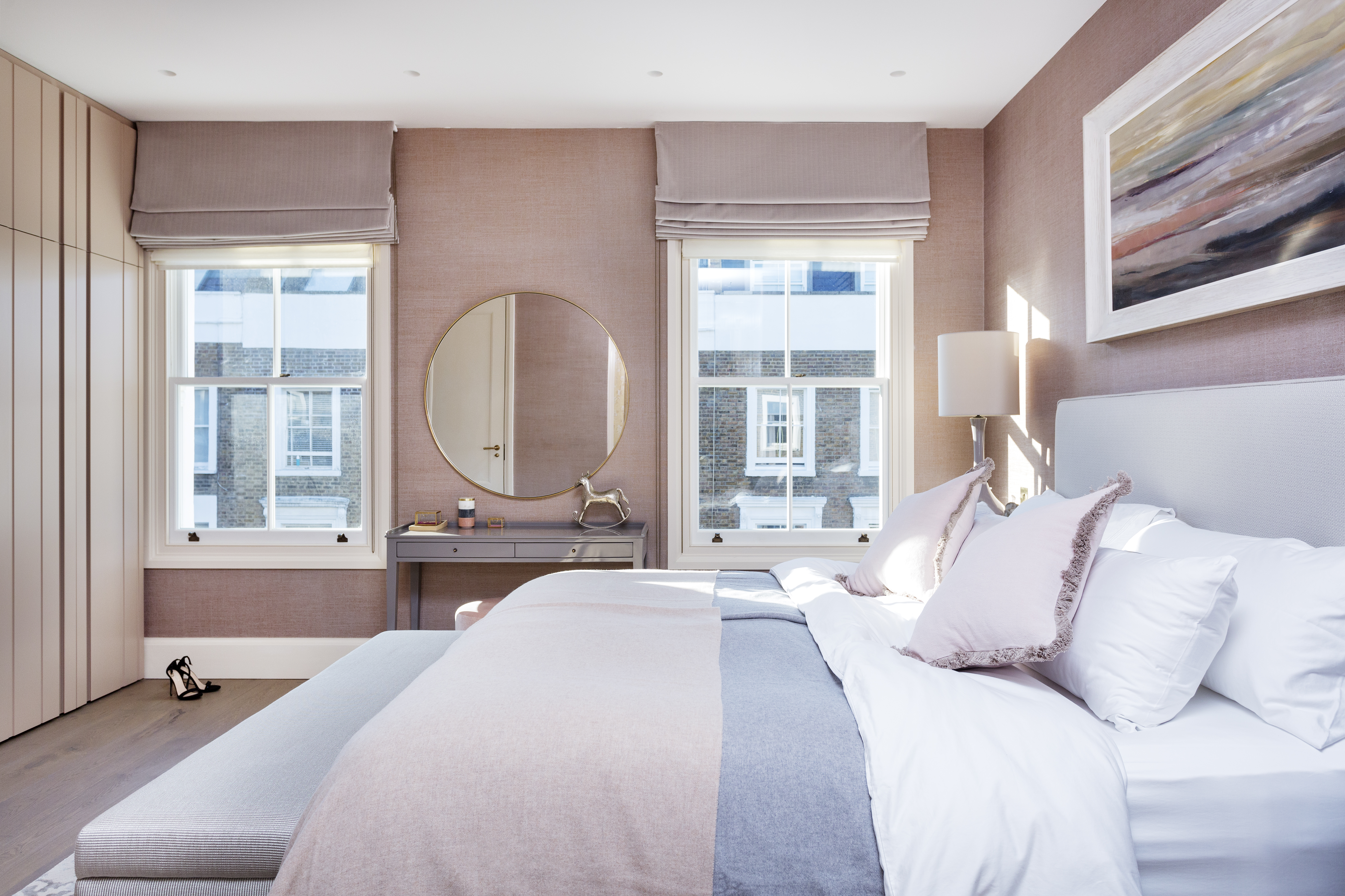 Settling here from overseas, the owners of this house in Primrose Hill chose the area for its quintessentially English architecture and bohemian feel. They loved the property’s original features and wanted their new home to be light and spacious, with plenty of storage and an eclectic British feel. As self-confessed ‘culture vultures’, the couple’s art collection formed the basis of their home’s colour palette. Originally set over four-storeys, the property was tall and narrow with boxy rooms. Our build team removed dividing walls throughout and created a fifth floor in the loft. On the lower ground floor the ceiling height was increased to create a bright, open family kitchen-diner. There’s a fresh, energetic palette, with aqua-blue and white kitchen cabinetry complemented by fashionable ice cream shades in the dining area. The grandest part of the house, the first floor, with tall sash windows, now has an elegant double-drawing room, and a beautiful roof terrace. The pale backdrop is enlivened with sumptuous green velvet sofas, eau de nil occasional chairs and intricate Persian rugs. In the master suite on the second floor, a corridor of stylish soft pink panelling conceals floor-to-ceiling wardrobes and leads to a stunning antique mirrored doorway, behind which is a generous marble-clad en-suite bathroom.