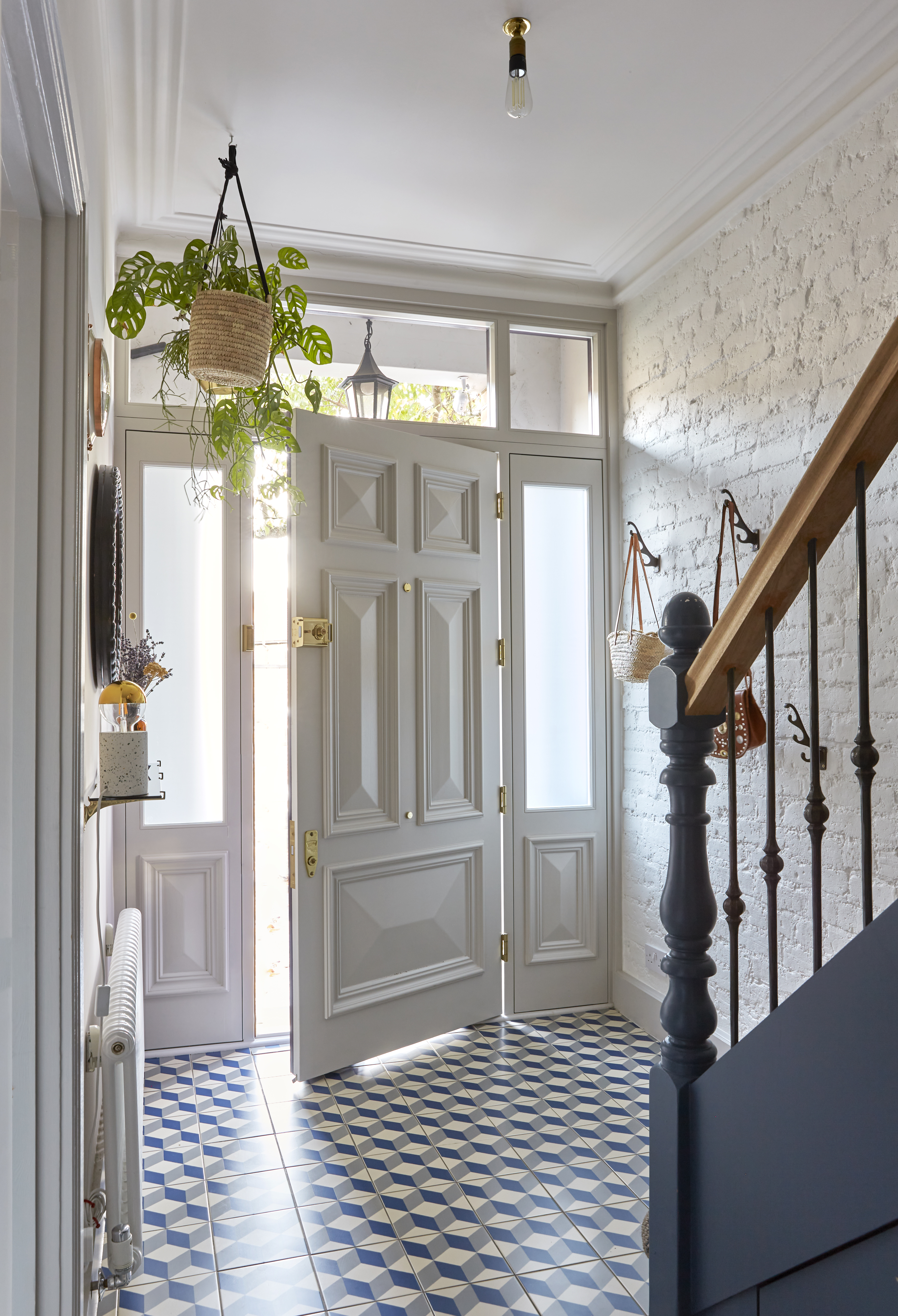 A complete overhaul of an Edwardian home that hadn’t been touched since the 1950s, requiring renewed plumbing, electrics, ceilings and walls, as well as an extension and loft conversion. A palette of blues underpins a blend of vintage finds, graphic shapes and quirky design motifs. Exposed brick detailing nods to the architectural roots of this home, whose ground floor has been extended to house a kitchen-diner suitable for family living, while two living areas have been opened up to one another. We also reworked the original kitchen into a separate downstairs cloakroom and a discreet laundry. Texture plays a key part in this renovation, from micro cement and aged brass finishes, to a modern take on classic encaustic tiling via a contemporary graphic geometric for the hallway flooring.