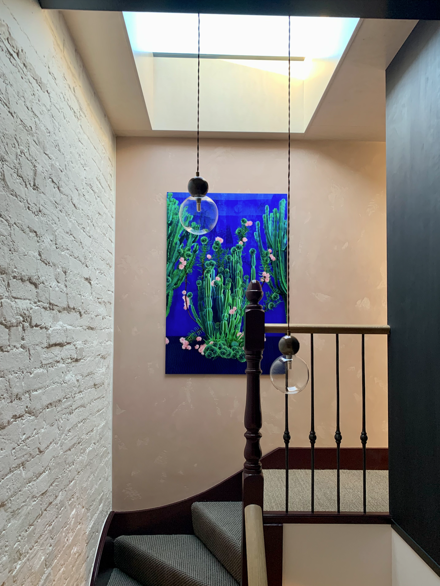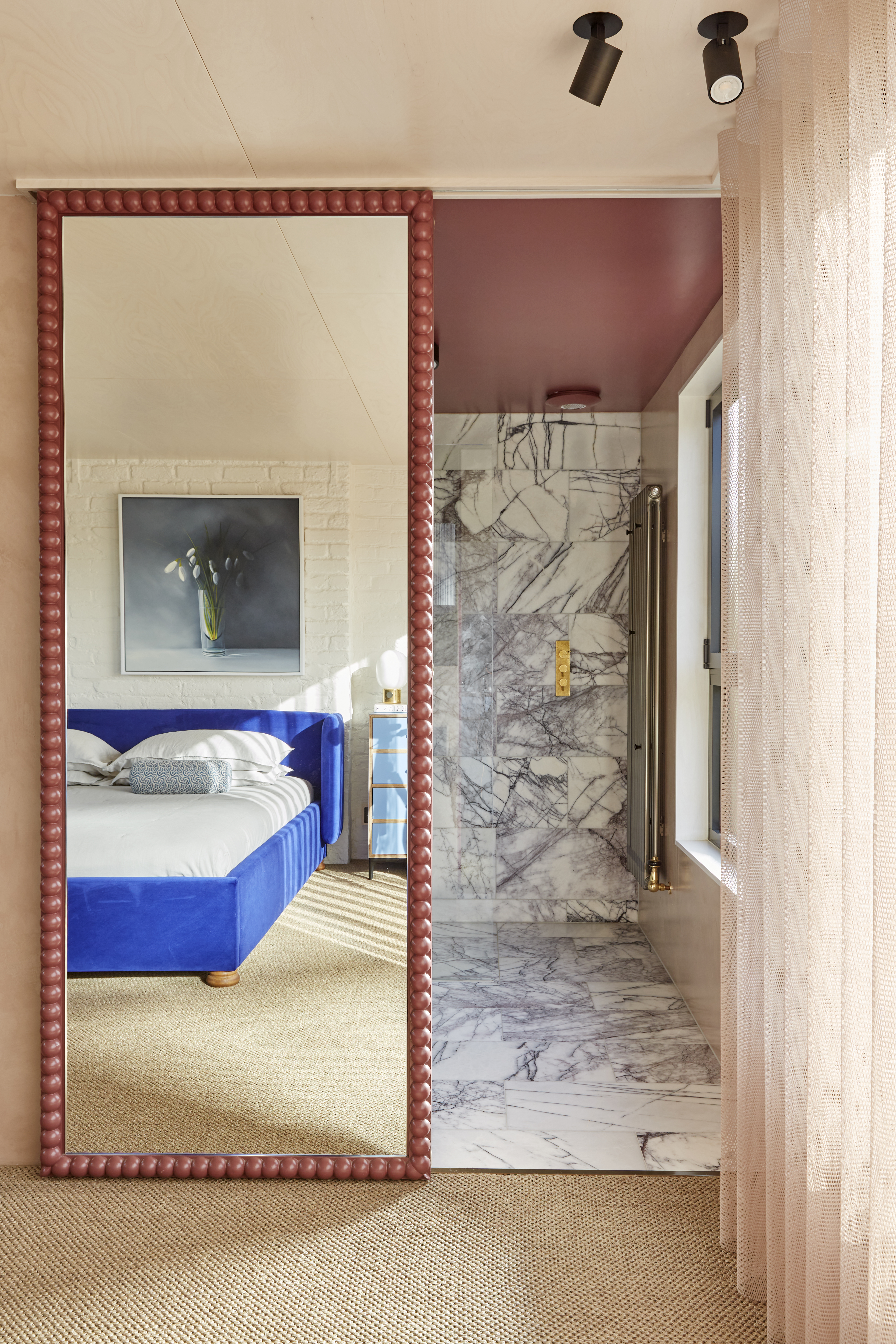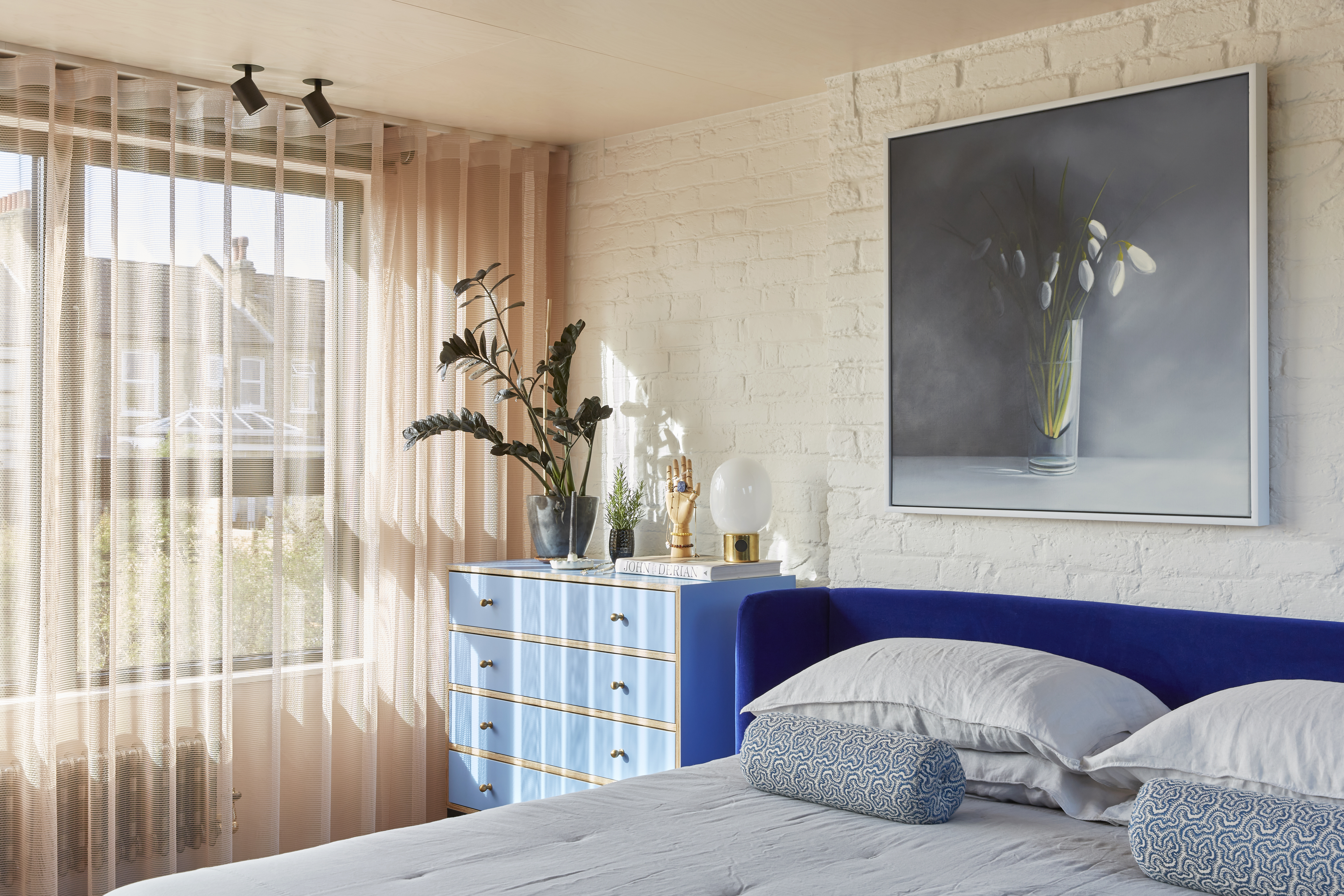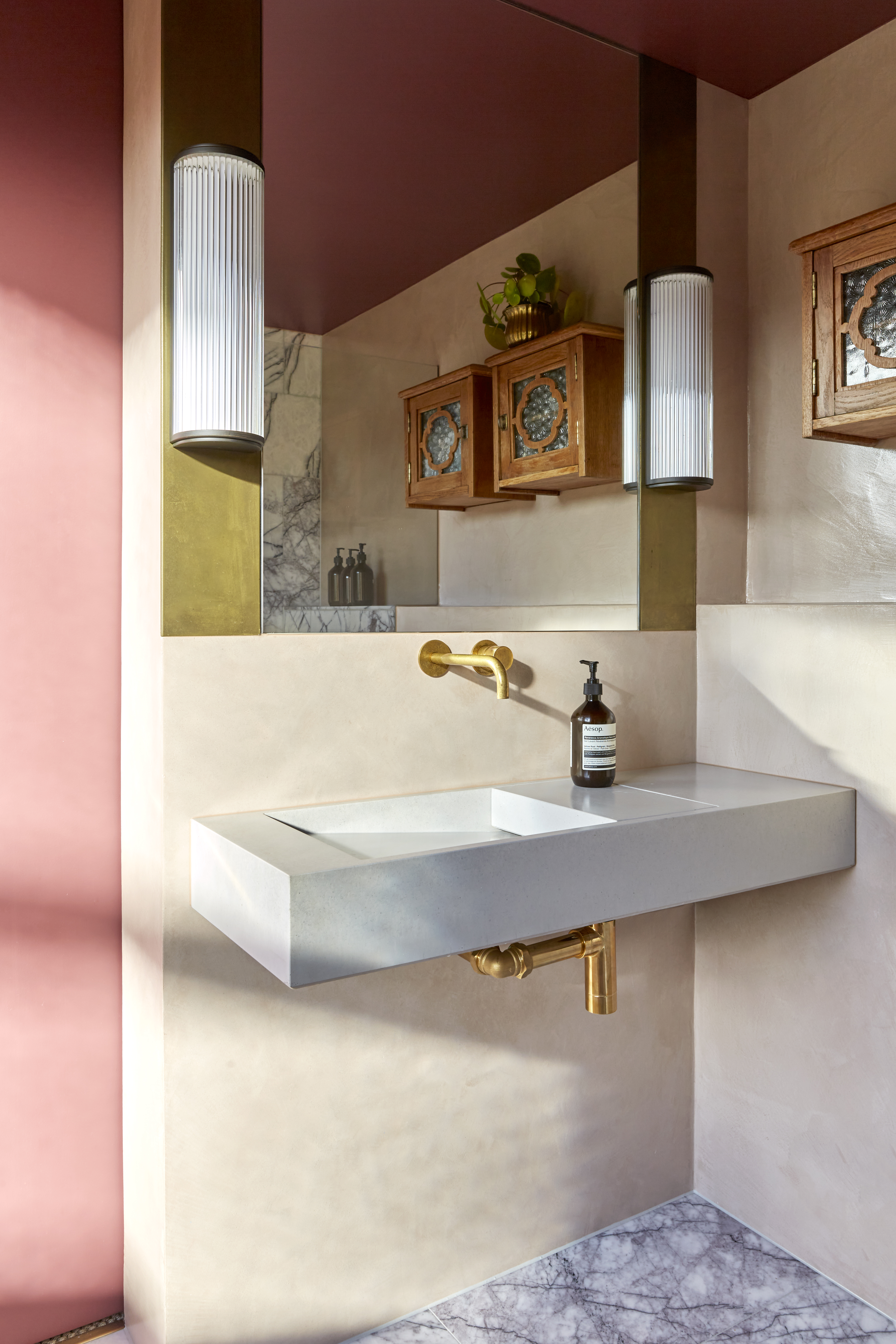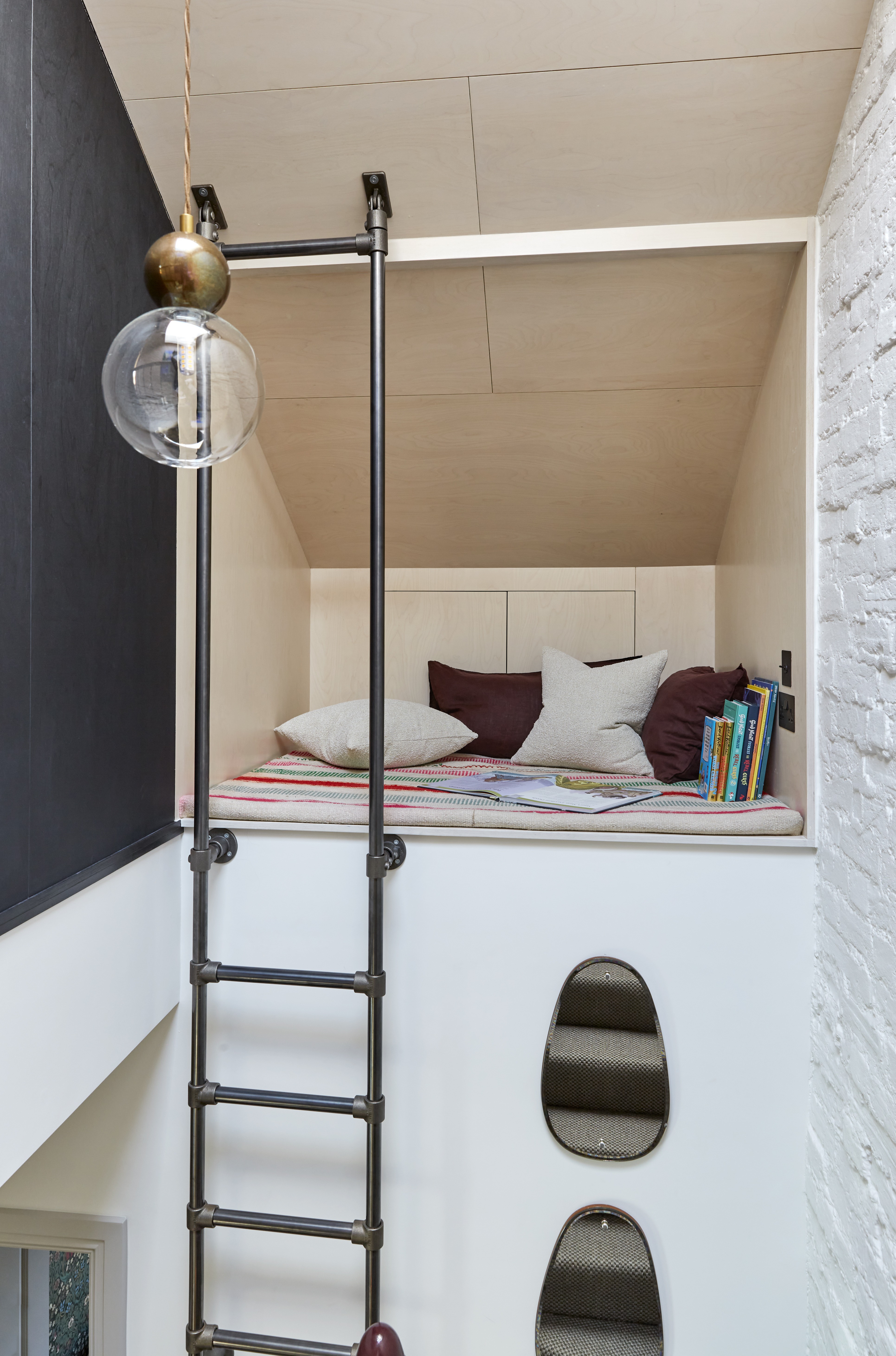 Our studio reworked the first and eaves floors of this Edwardian townhouse. A new dormer loft extension houses the main bedroom and ensuite, showcasing a relaxed mix of materials, including a birch plywood ceiling, plus an exposed brick wall and steel beam for a softly industrial note. Form and function marry seamlessly, with built-in wardrobes made from blackened ply maximising the potential of the space, while a generous bobbin-framed mirror slides open to reveal the bathroom. Designed to echo the sense of nature beyond, textures such as sisal merge with a soft plaster pink palette. On the first-floor landing, a wall-mounted ladder made from scaffolding leads to a playful reading nook carved out from the dead space in the eaves – making an ideal cubby hole for children.