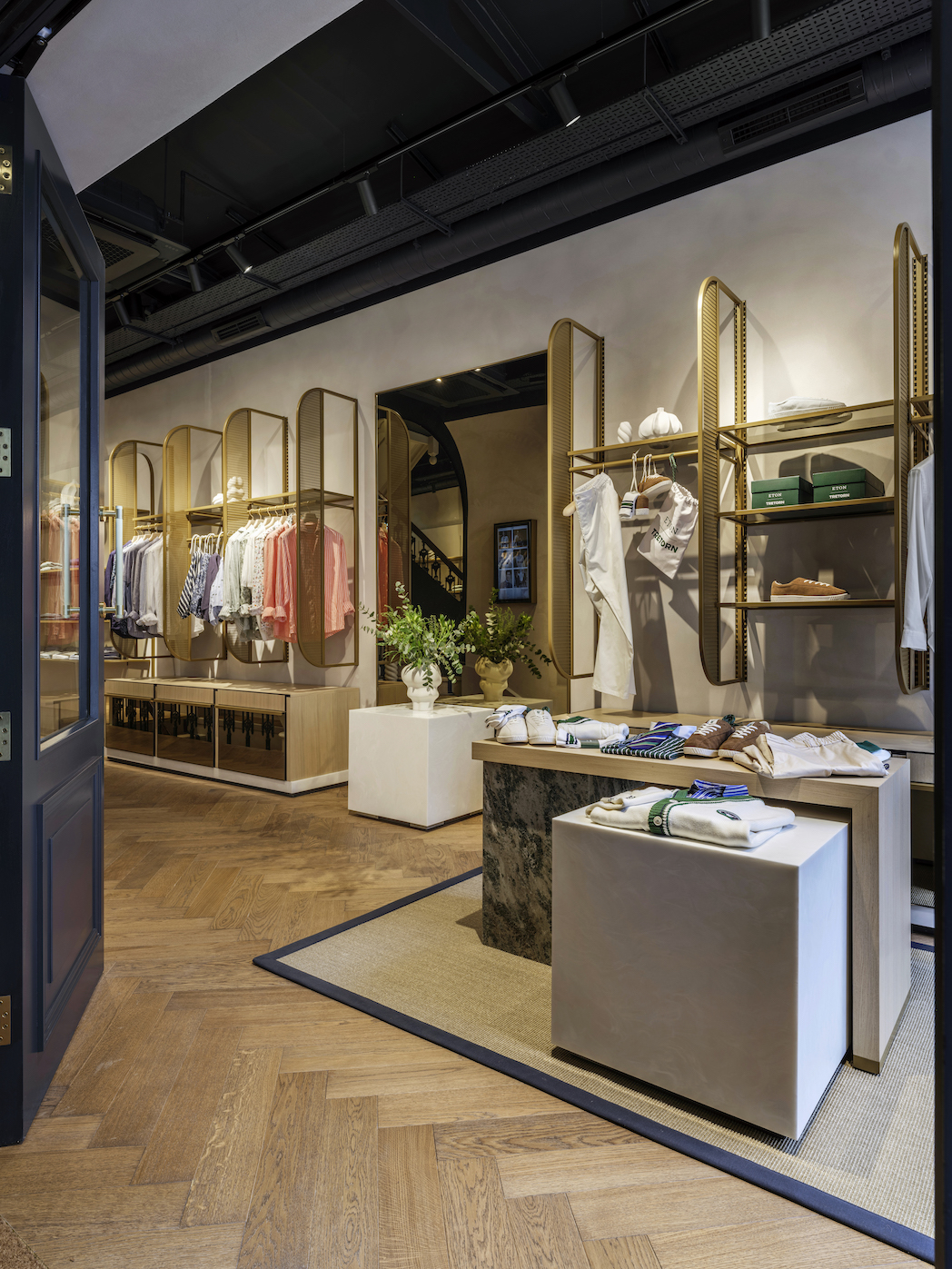 The use of Havwoods HW3003 Arena from the Venture Plank collection brings warmth and textural depth underfoot. The neutral tone of the wood complements the palette of Eton's clothing collections and offers a sophisticated backdrop.