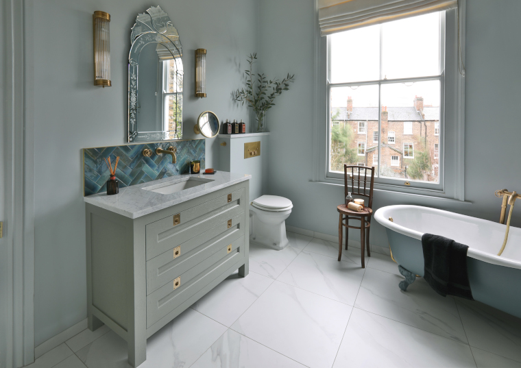 The elegant basin unit is bespoke (again supplied by Aston Matthews) featuring a marble top, three generous storage drawers and carefully chosen brass handles. The gorgeous green/blue tiles unite the colours in the room and are from the Aston Matthews collection.