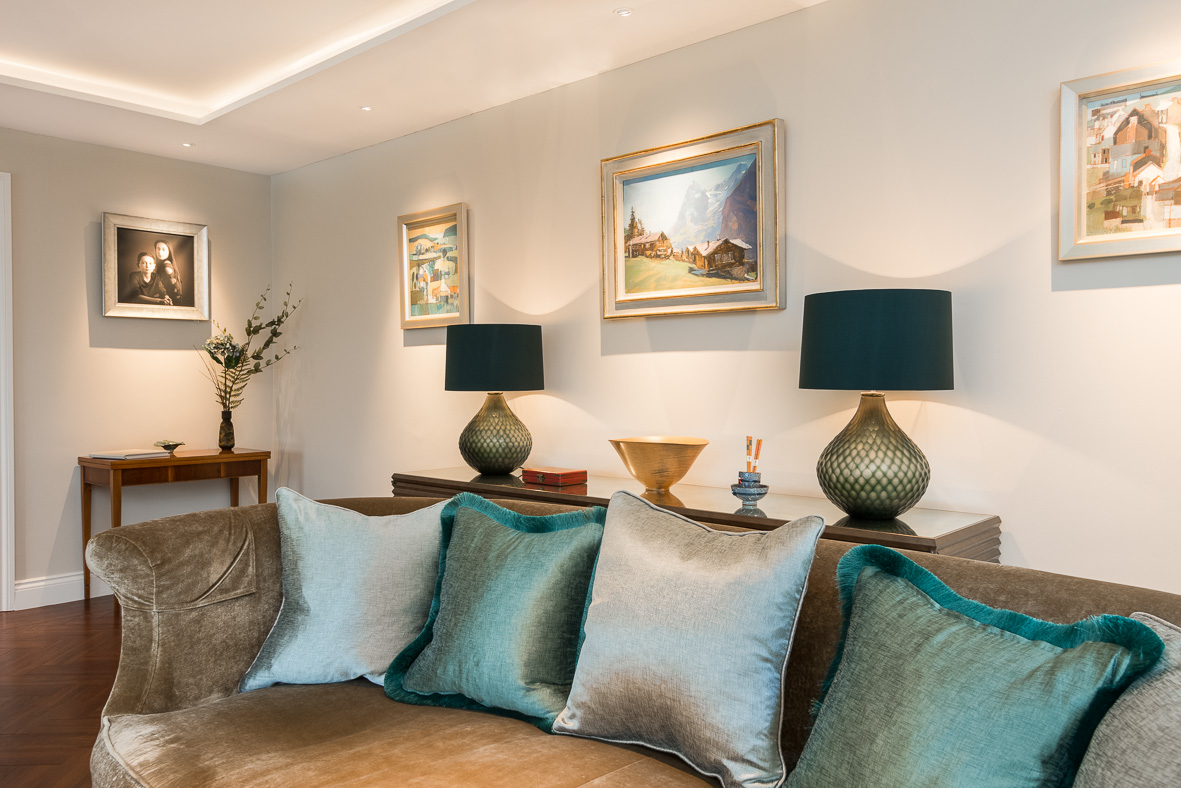 The ceiling has been remodelled and lighting designed to suit the space. Having good colour rendering has brought into focus the artwork, the shape and carving of the fireplace is now noticed.