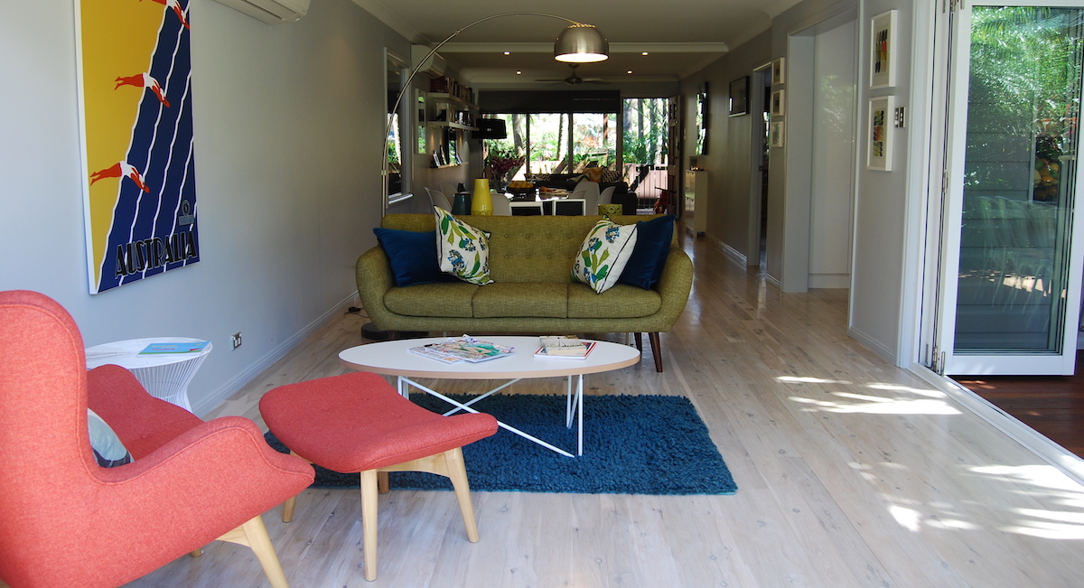 The indoor living area merges seamlessly with both the kitchen and outdoor living space, essential in the Australian climate.