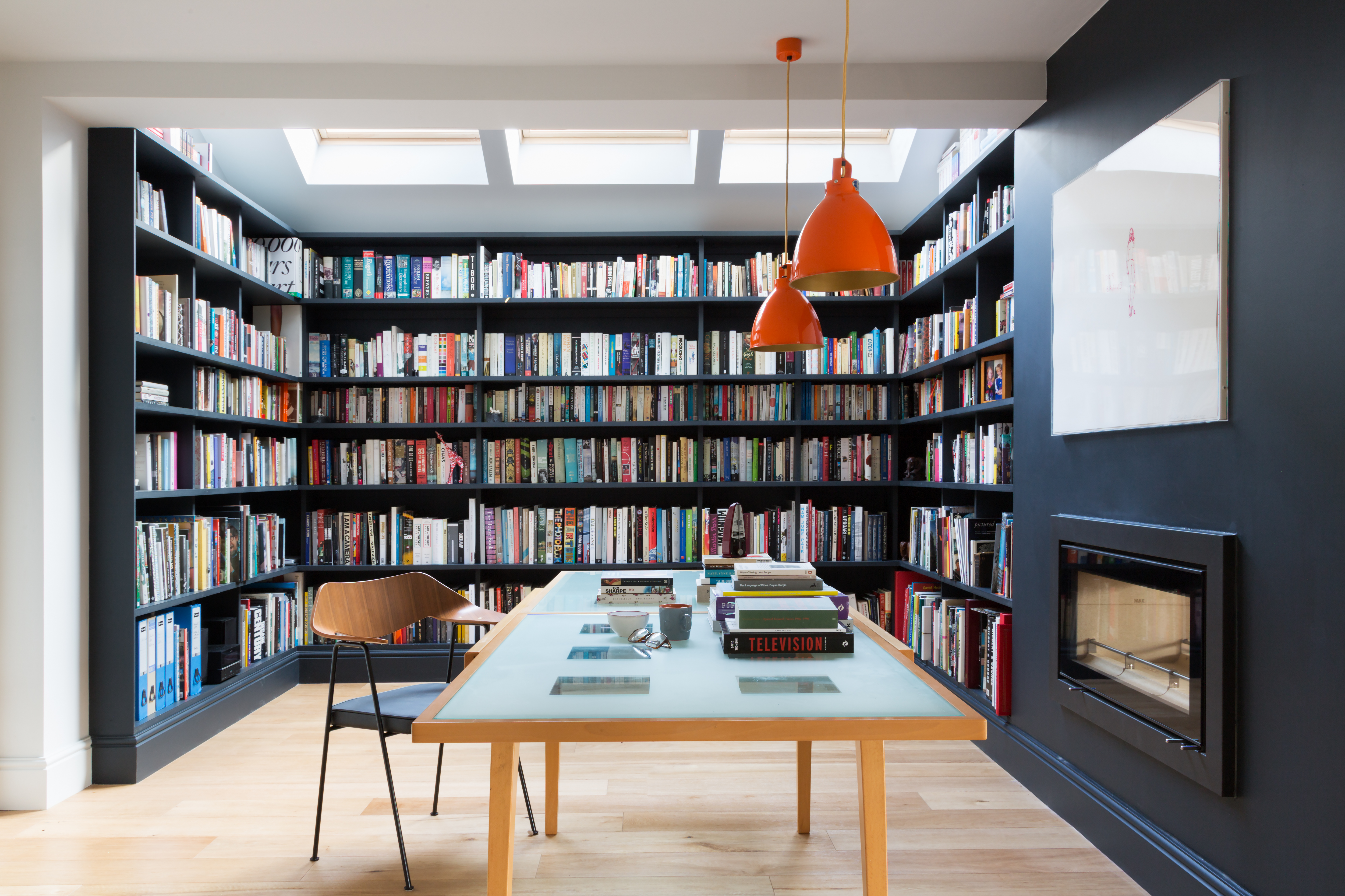 The focus of family life is round the kitchen and they wanted to open this up and link it with a relaxing lounge area, dining and through to the living room where a real fire was important. The client required a large study (with wall to wall bespoke book shelving) to write in, but also was keen not to feel isolated from the rest of the family. We did this by making the study part of the open plan ground floor area, but with glass screens he could close easily if he needed to concentrate without noise, but still see everyone milling around. Equally vital to the scheme was a grand entrance-hall and a big utility room to swallow the clutter of family life.